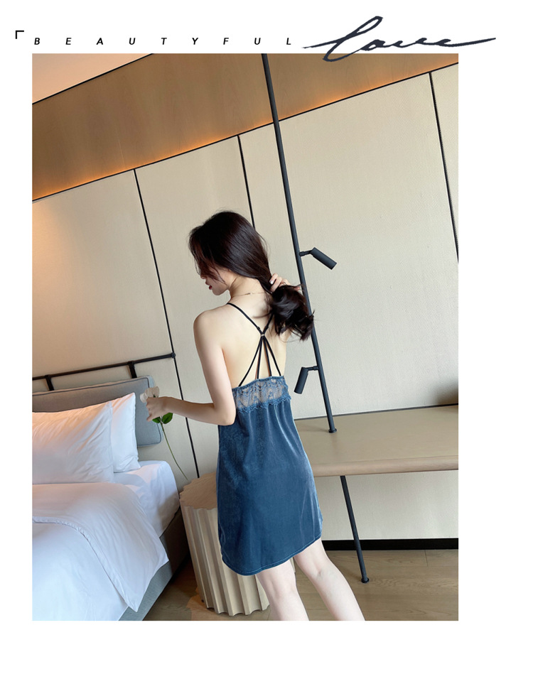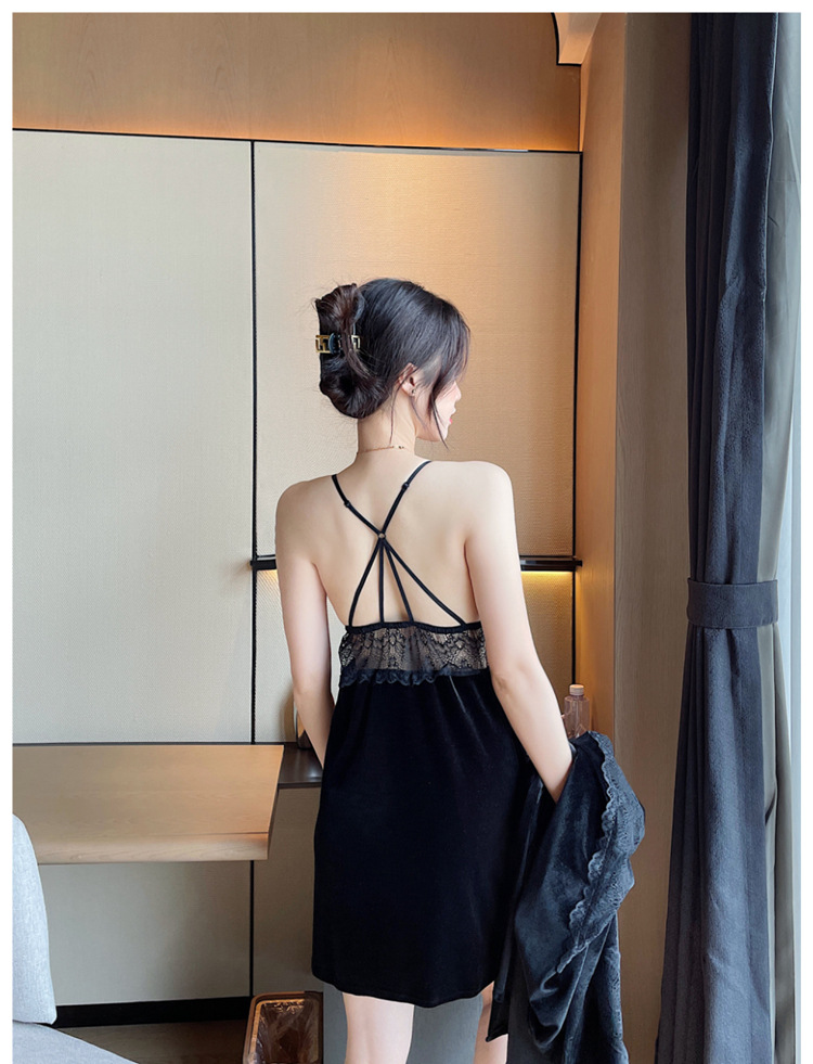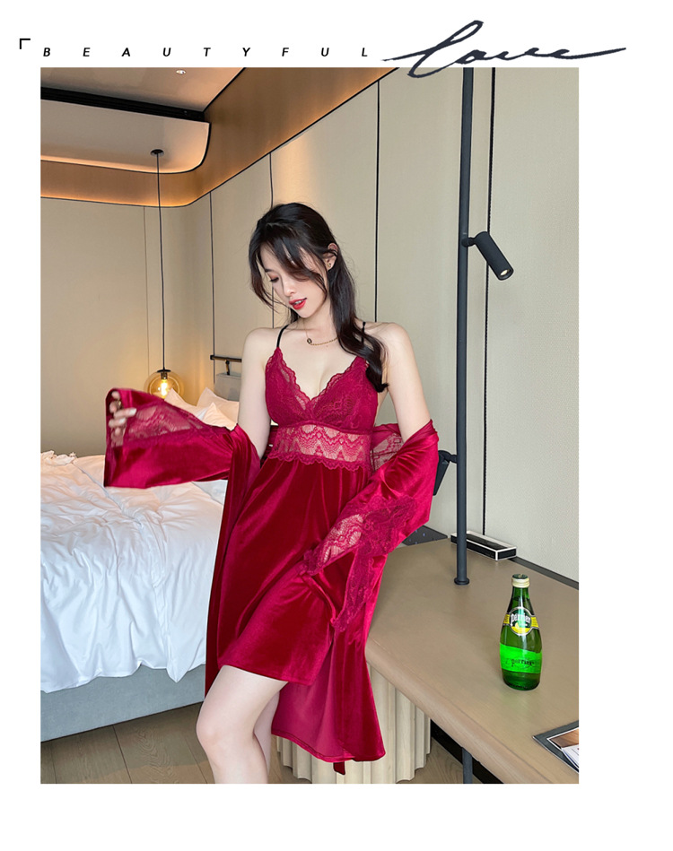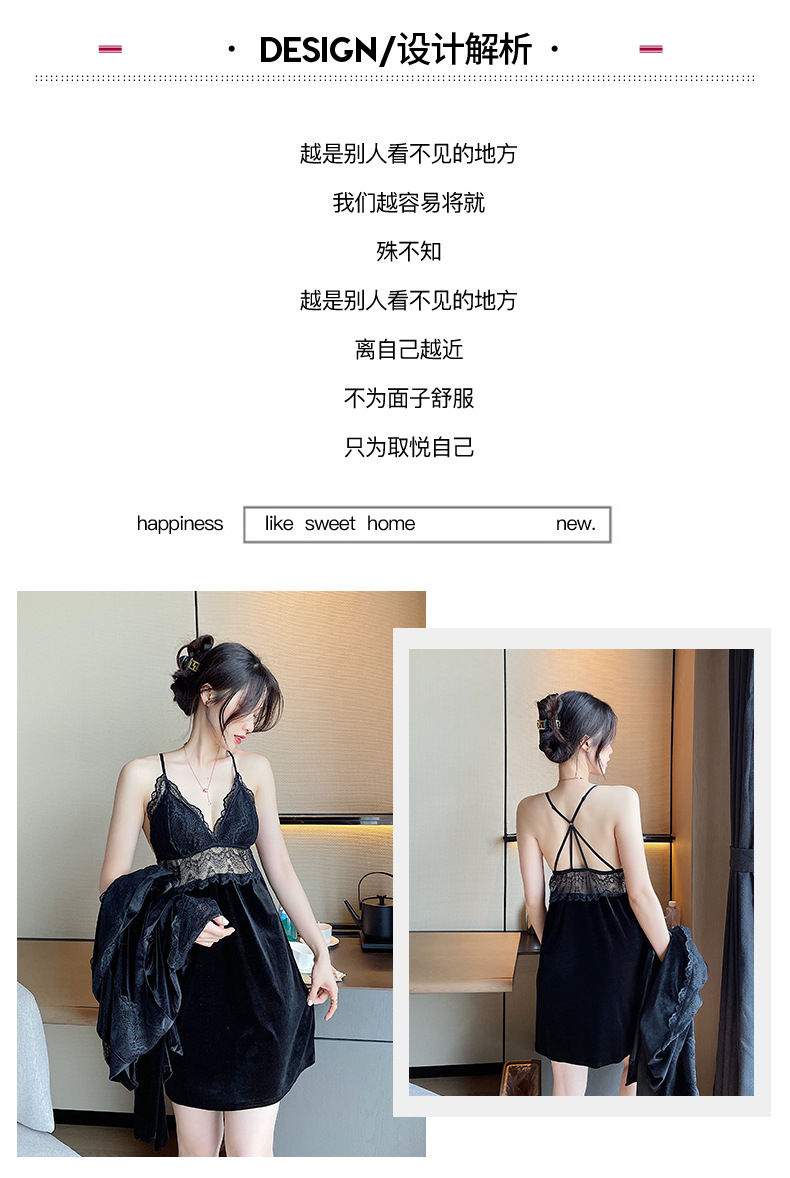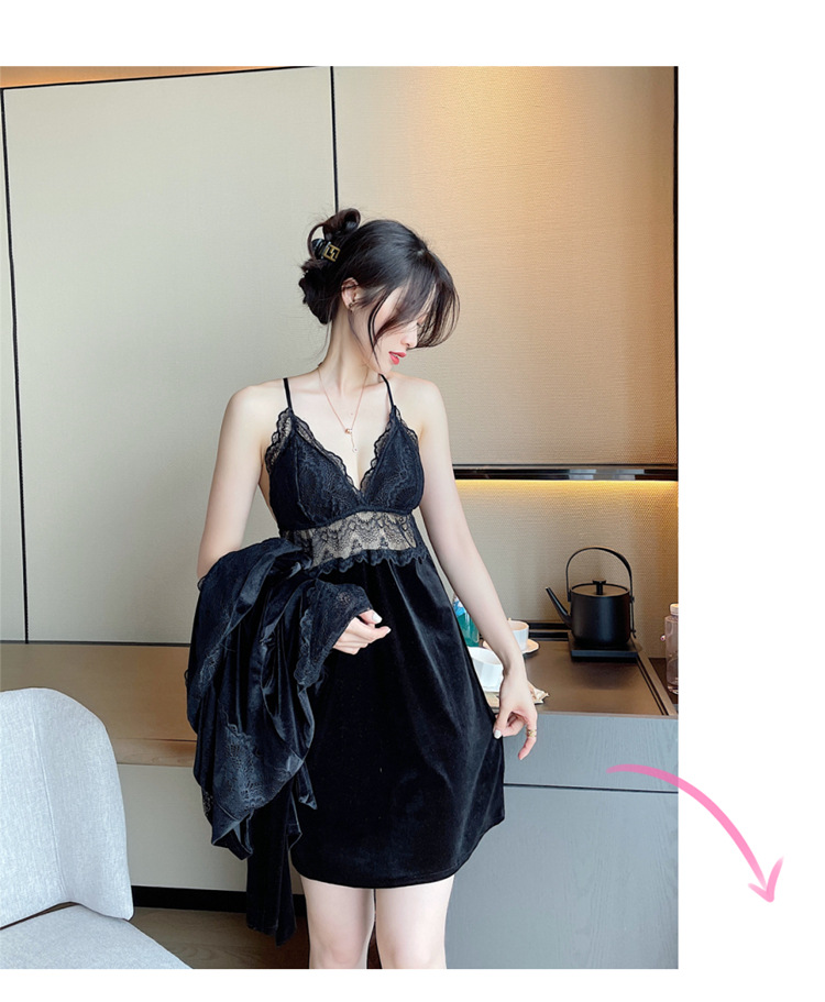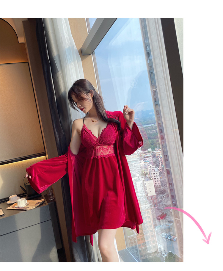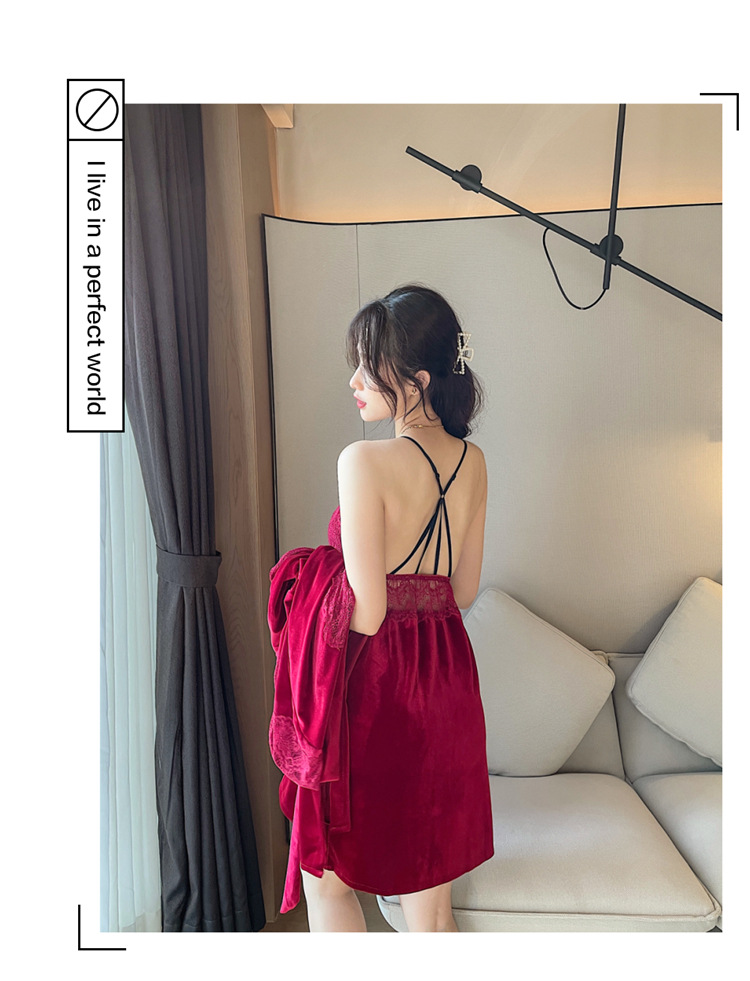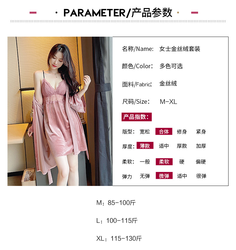 秋冬季新款睡衣金丝绒性感吊带睡裙睡袍两件套蕾丝长袖睡衣女 QYSY2601