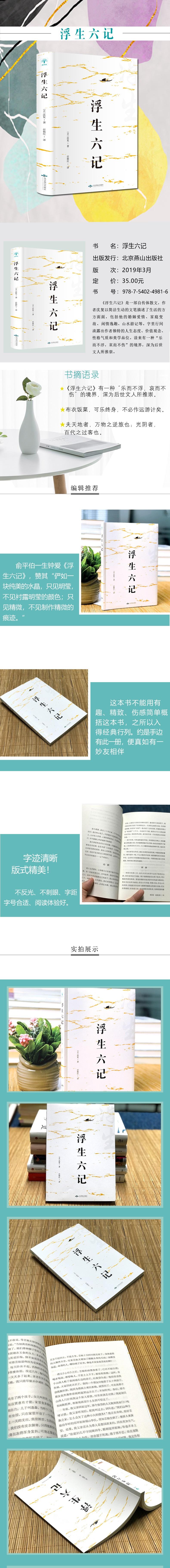 本书是一部自传体散文。作者沈复以简洁生动的文笔描述了生活的方方面面, 包括他的婚姻爱情生活、家庭变故、闲情逸趣、山水游记等。字里行间流露出作者独特的人生态度、价值观念、性格气质和美学品位。读来有一种“乐而不浮, 哀而不伤”的境界, 深为后世文人所推崇。