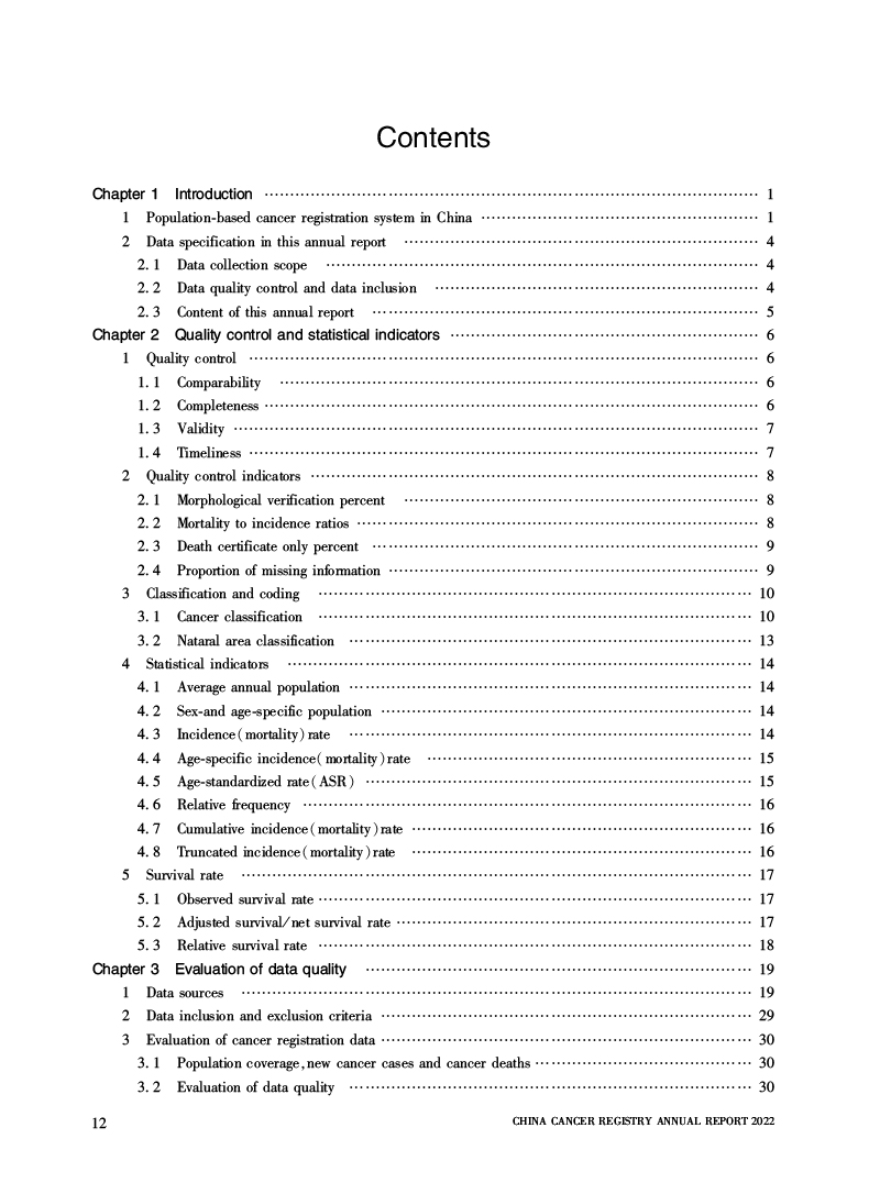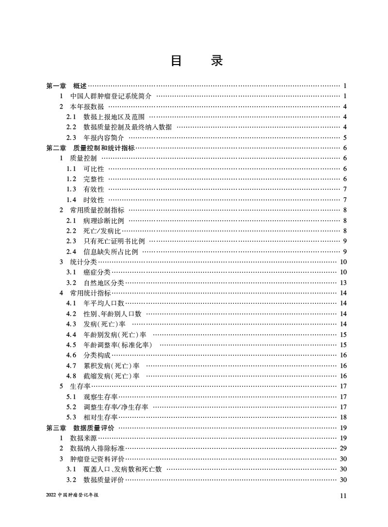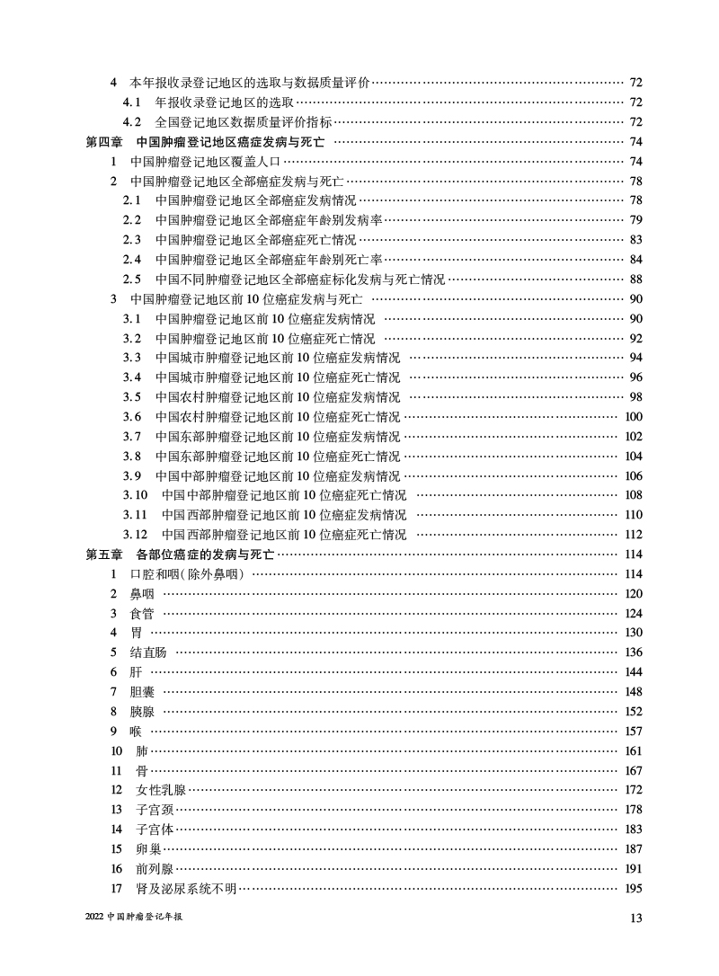 本年报内容共分五章,第一章为概述,主要包括我国肿瘤登记的历史与发展、肿瘤登记建设规划、肿瘤登记年报数据覆盖地区、时间范围、覆盖人群、登记质量;第二章是统计方法,介绍常用的统计指标,例如发病(死亡)率、分类构成比、年龄别发病(死亡)率、年龄调整发病(死亡)率或年龄标准化发病(死亡)率、累积率;第三章是数据质量评价,包括肿瘤登记流程及资料审核流程;第四、五章为全国合计以及主要癌症的发病与死亡分析结果。