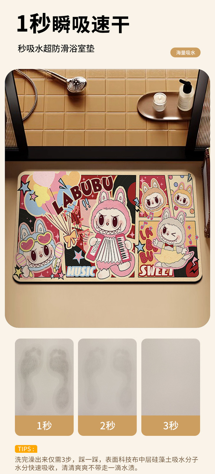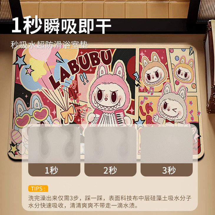 「倒水3秒消失术!」垚森之家Labubu硅藻地垫让浴室滑倒党退!退!退!🎊 暴风吸入体验 ✅ 一踩瞬干黑科技 > 高密硅藻泥芯→疯狂榨干脚底水珠💦 > 光脚踩水实验: 🌷抬起脚面≈水痕消失 ✅ 防滑到能劈叉 > 底部橡胶吸盘阵→沐浴露撒了照样稳如泰山🎊 ✅ 浴室颜值刺客 > Labubu萌脸C位出道→洗澡也要仪式感!💗
