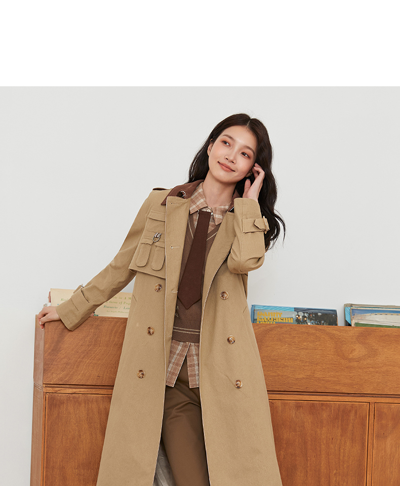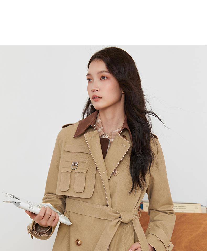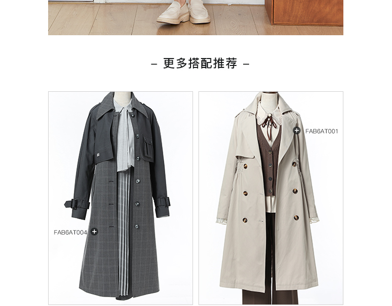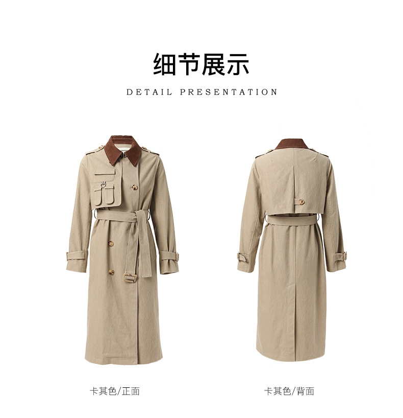 Famecoco范可儿风衣长款双排扣高腰撞色翻领外套通勤FAB6AT005