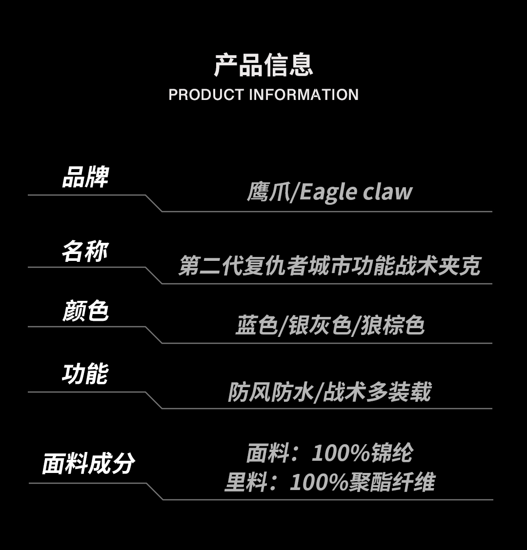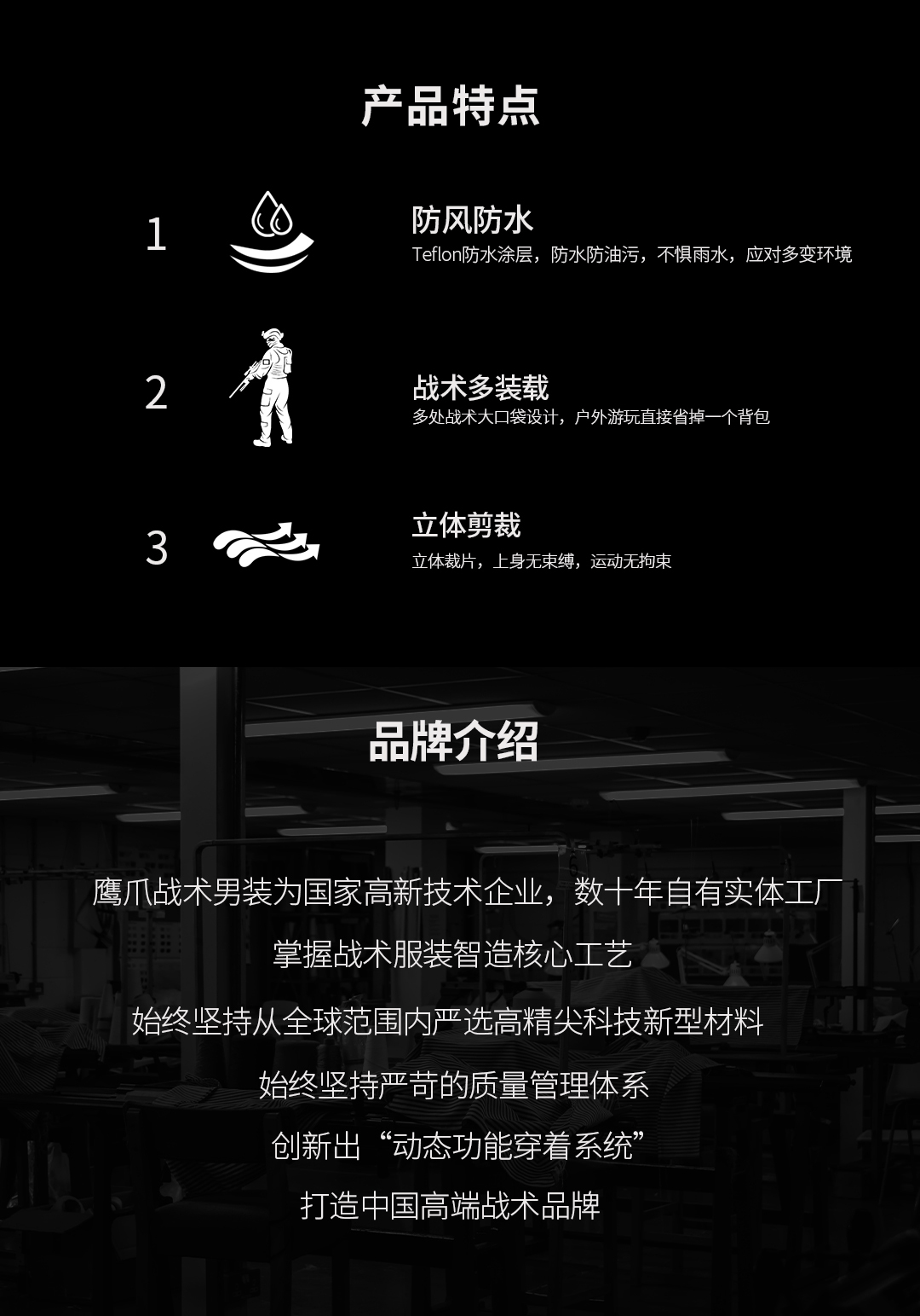 鹰爪,中国功能男装创领品牌,致力于服务中国3亿新中产阶级,着力打造全场景穿着体验创新平台,三十年产业深耕的积淀,以用户的痛点为己任,开创兼具军品与户外装备的功能动态穿着系统。