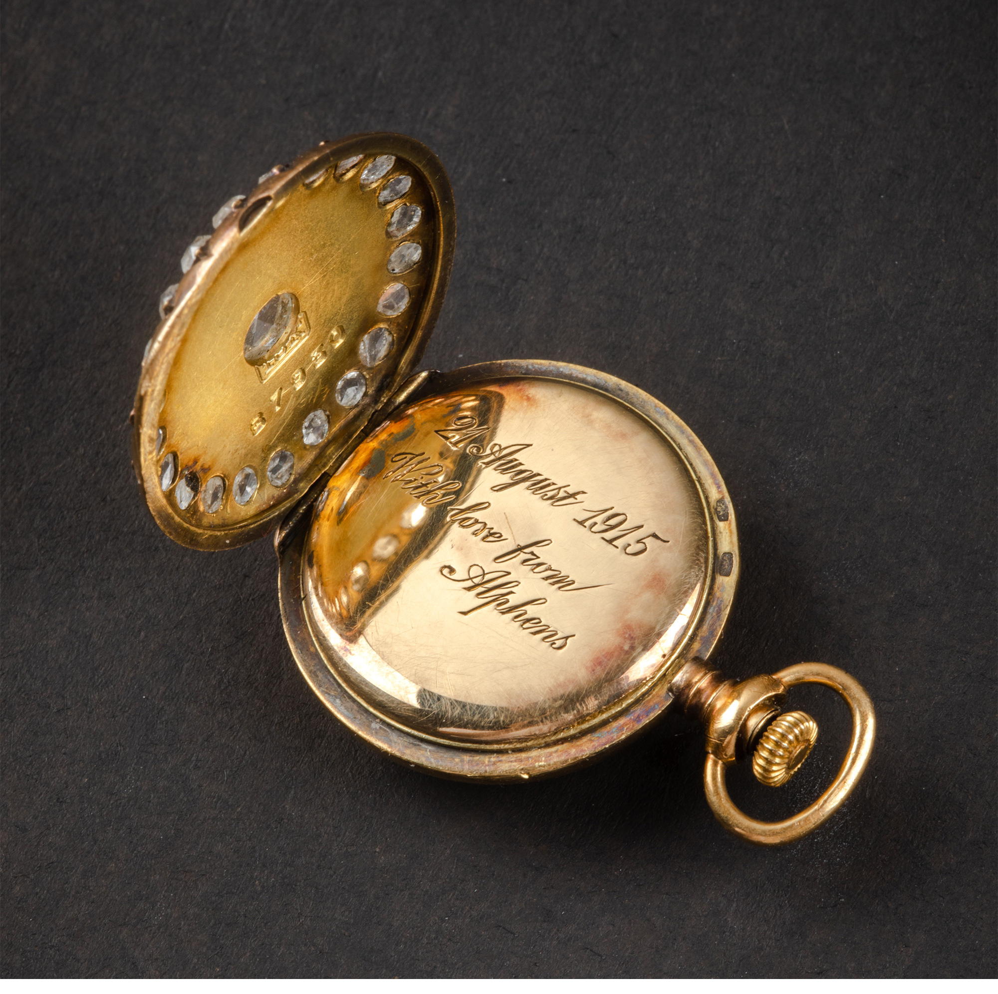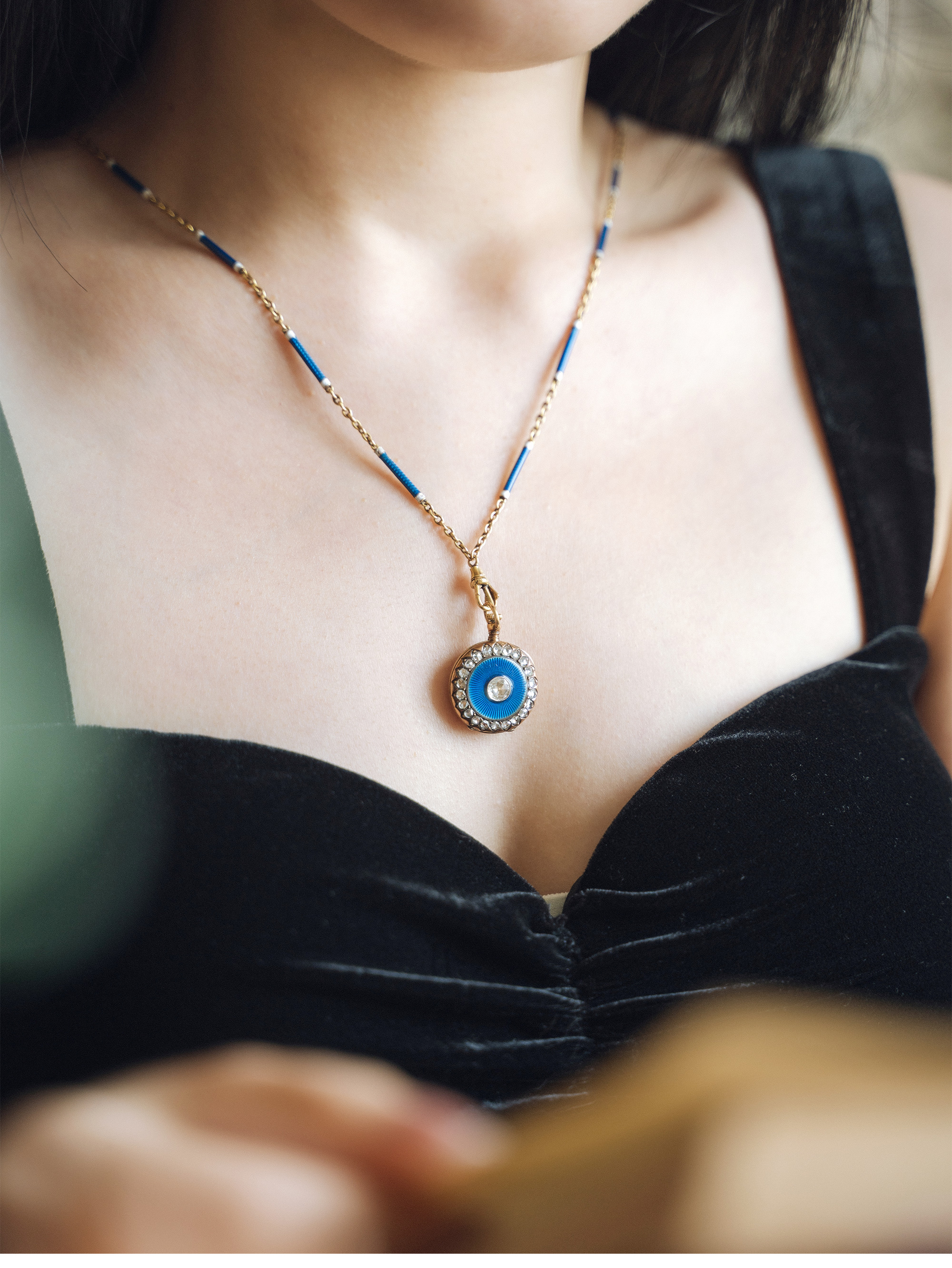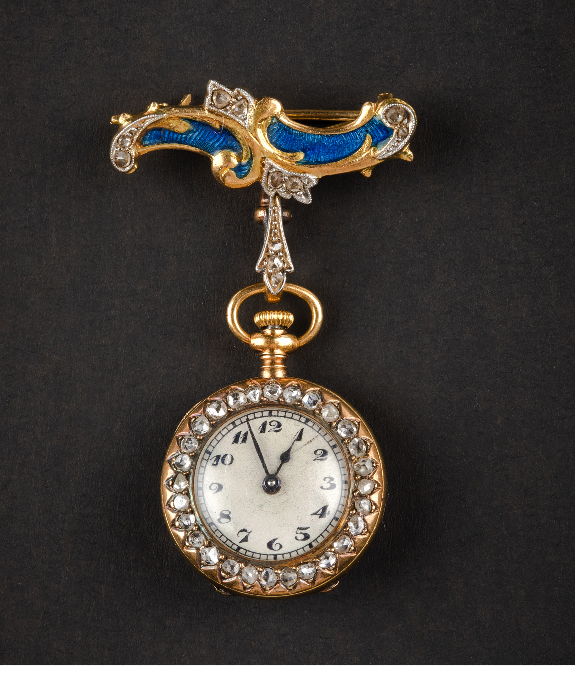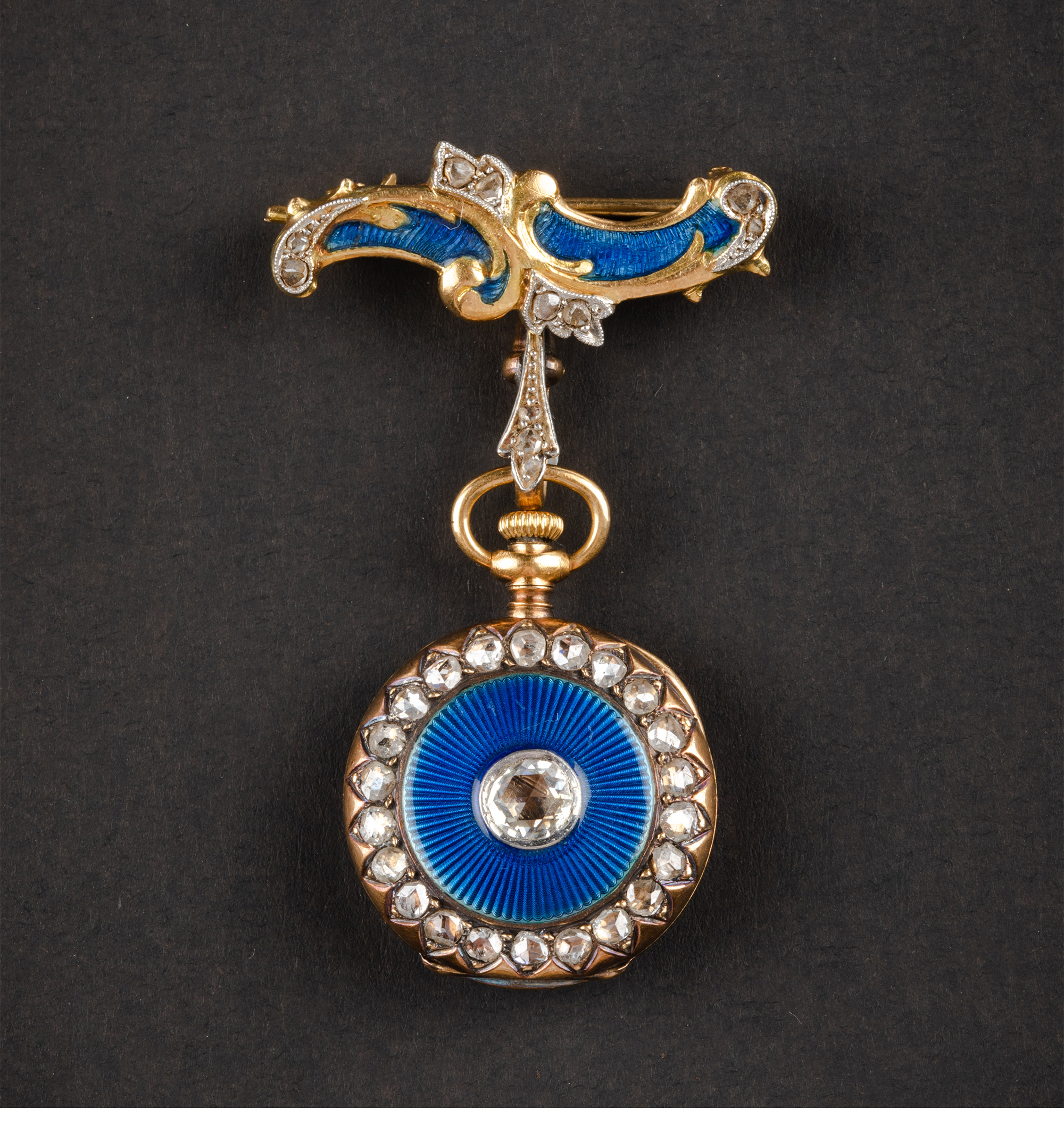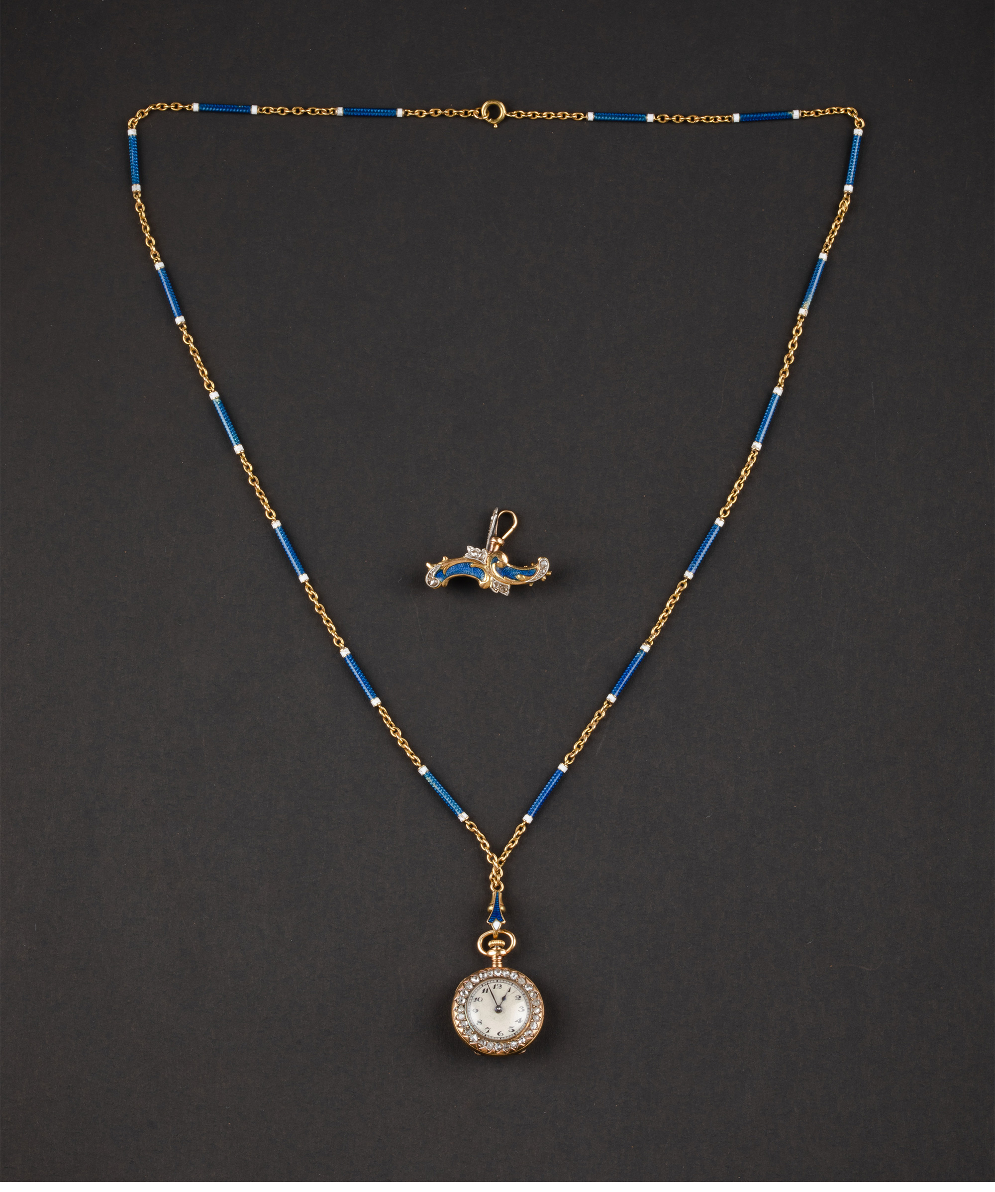 20世纪初欧洲出品新艺术风格18K黄金镶嵌钻石蓝色玑镂珐琅怀表吊坠及胸针