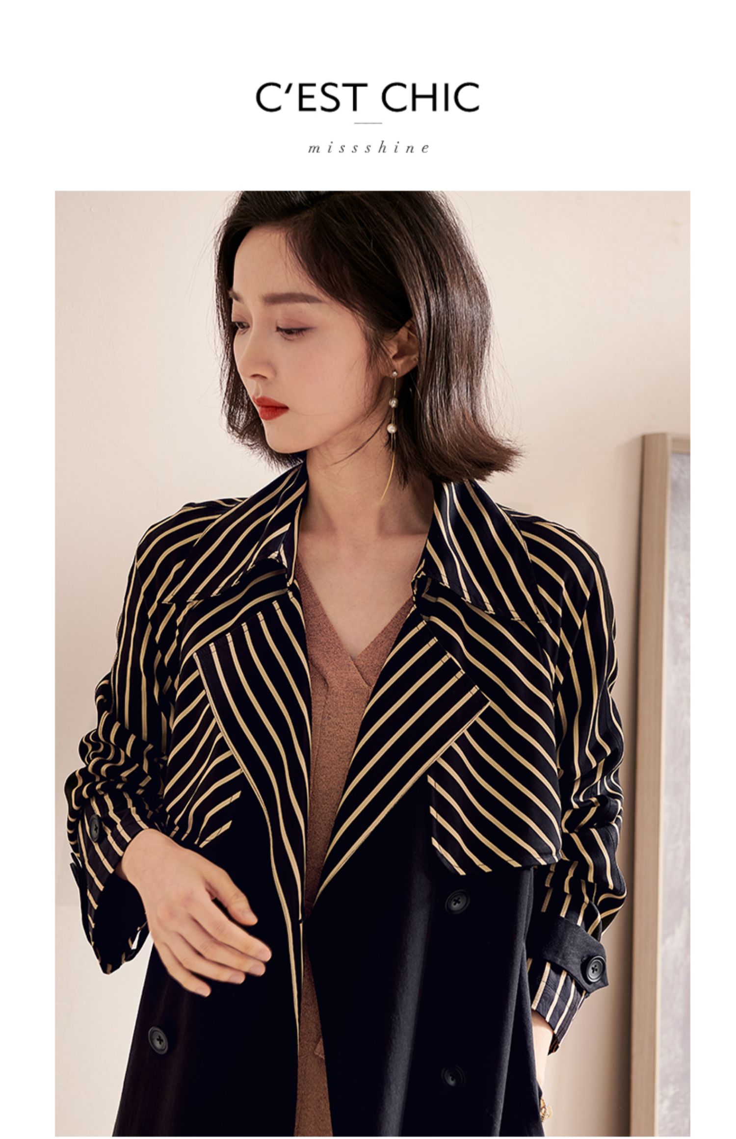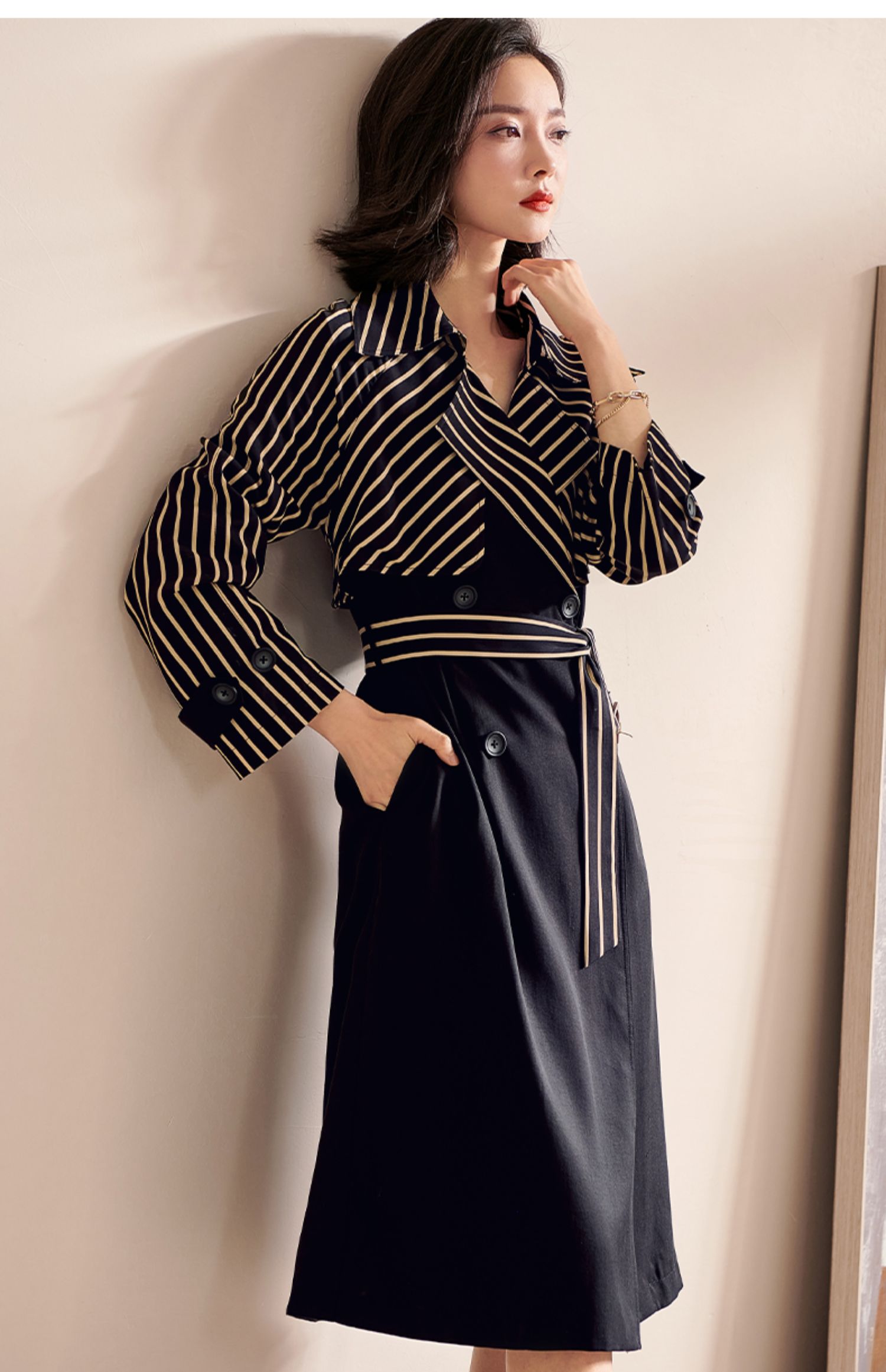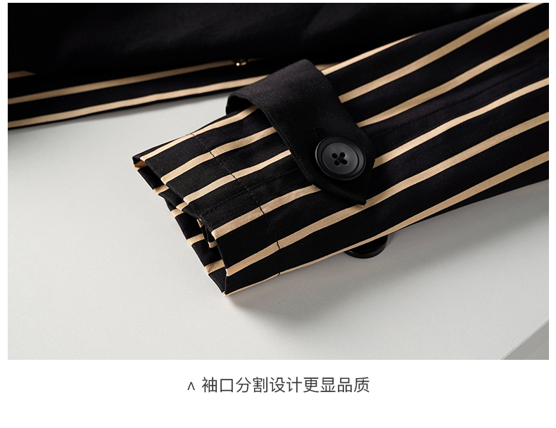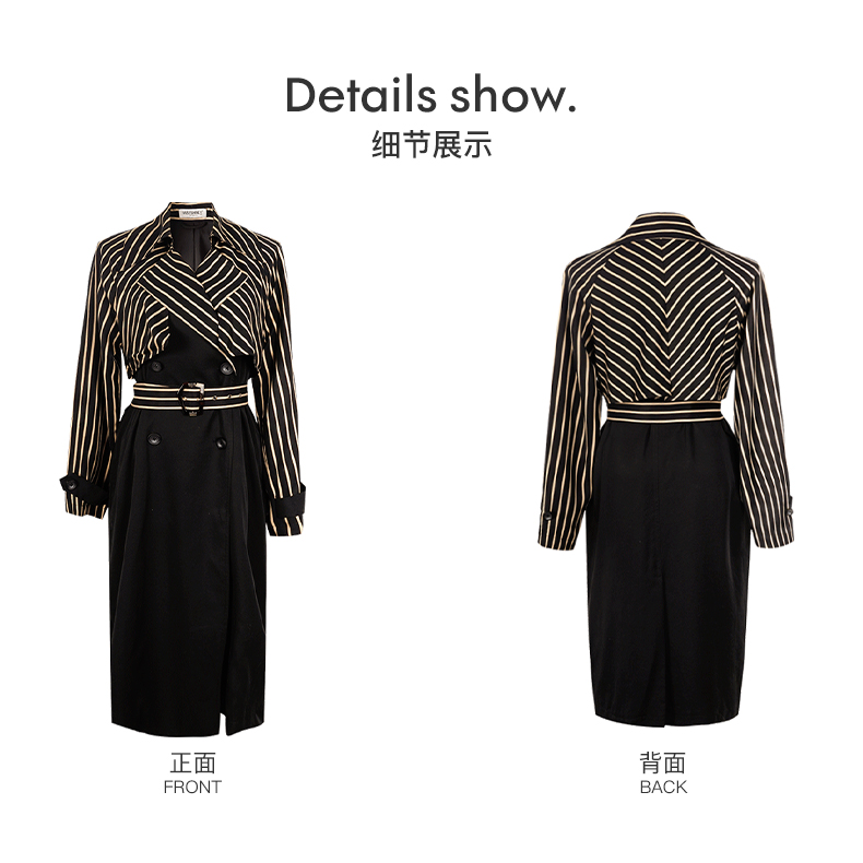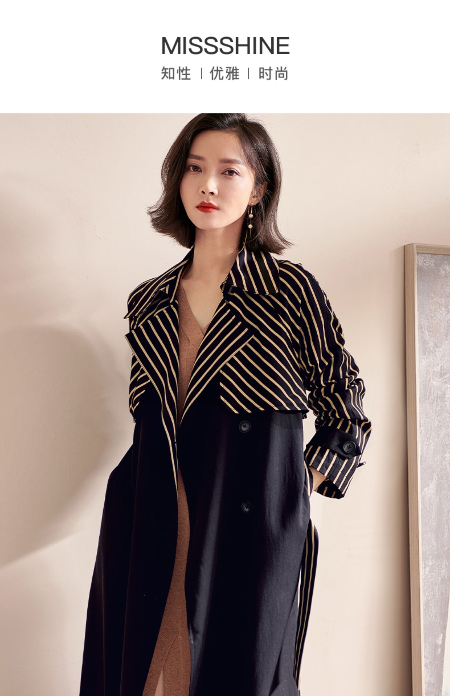 剩M 米思阳2025秋装新款时尚流行撞色条纹收腰系带风衣中长外套女0249