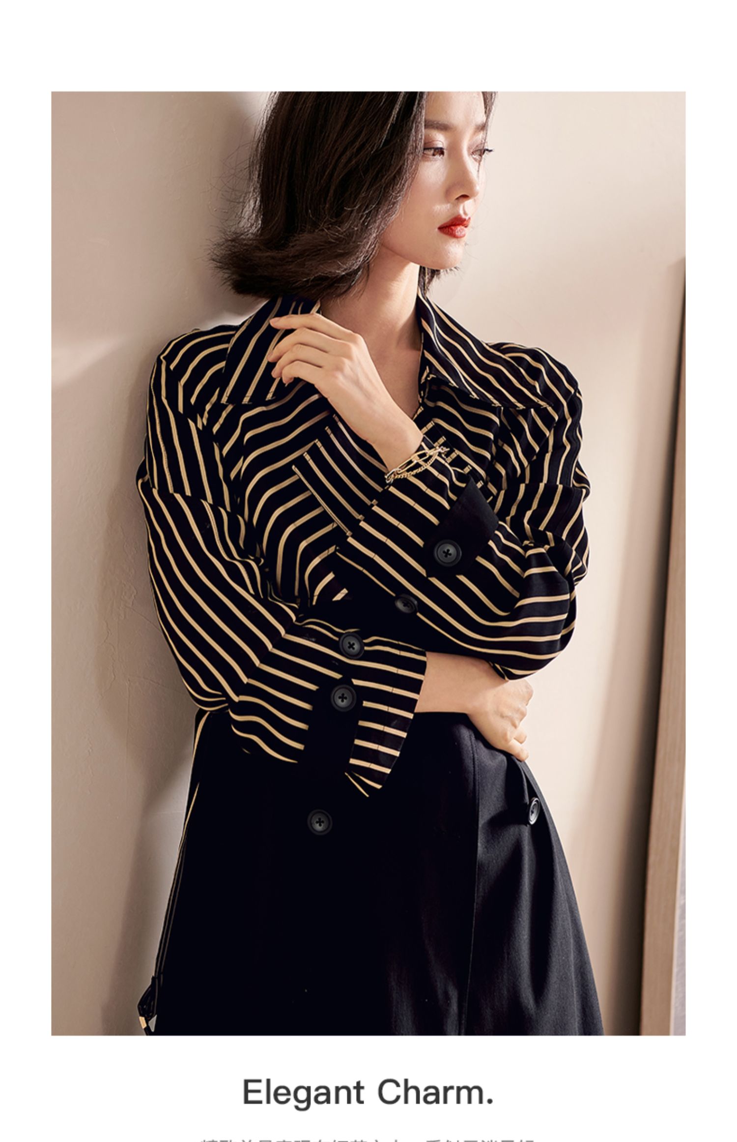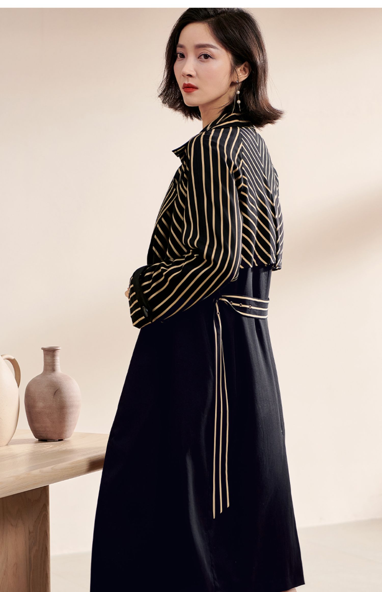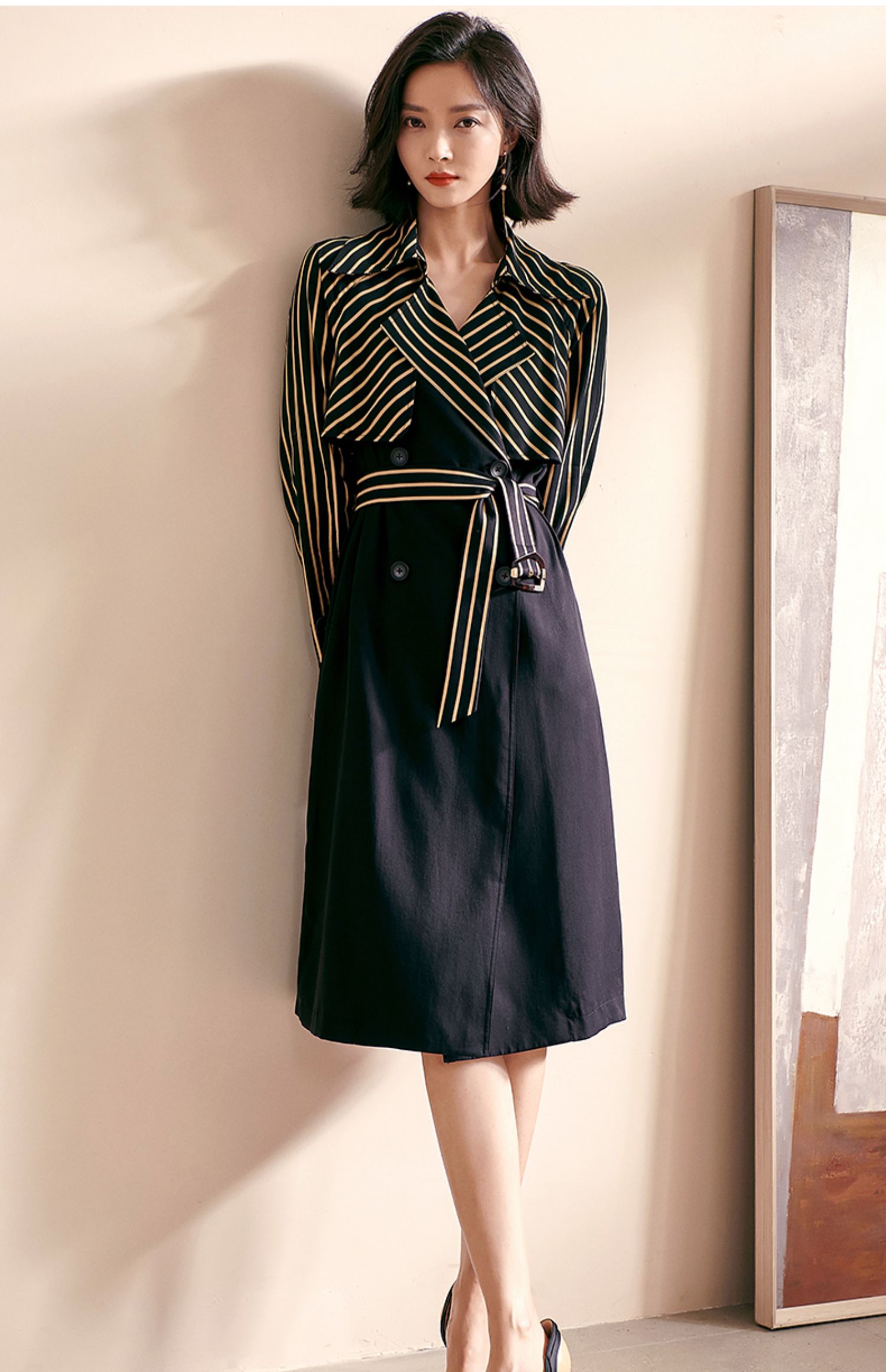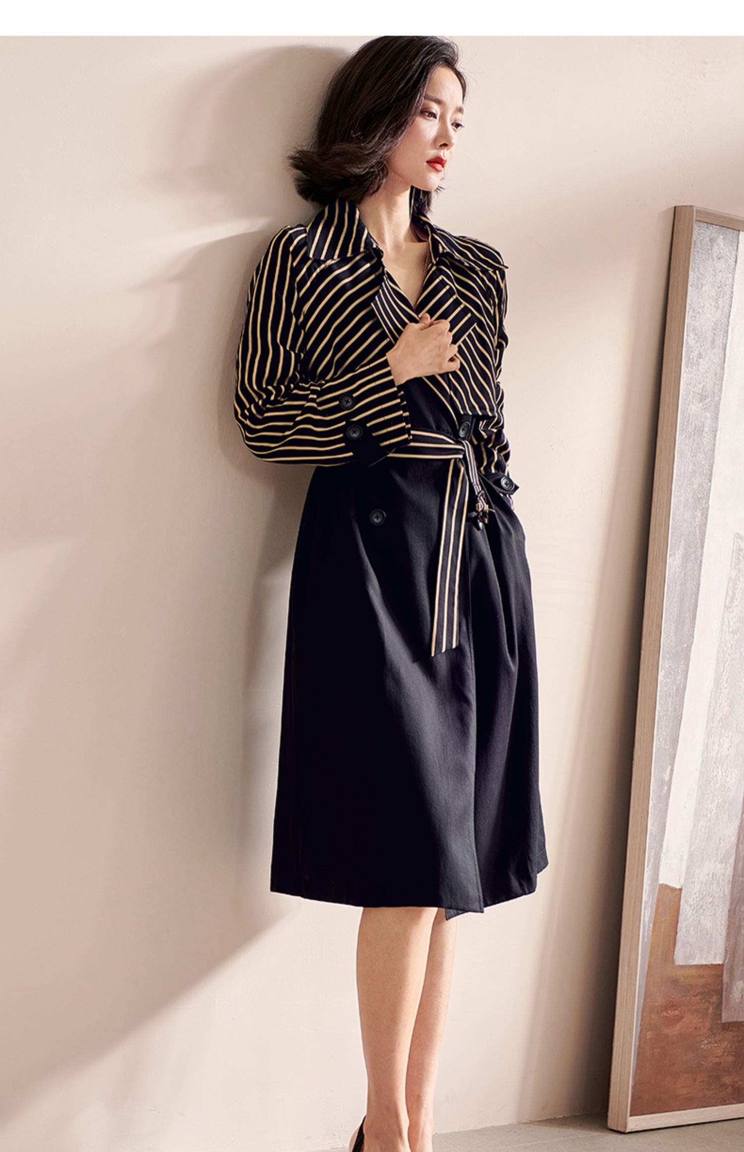 剩M 米思阳2025秋装新款时尚流行撞色条纹收腰系带风衣中长外套女0249