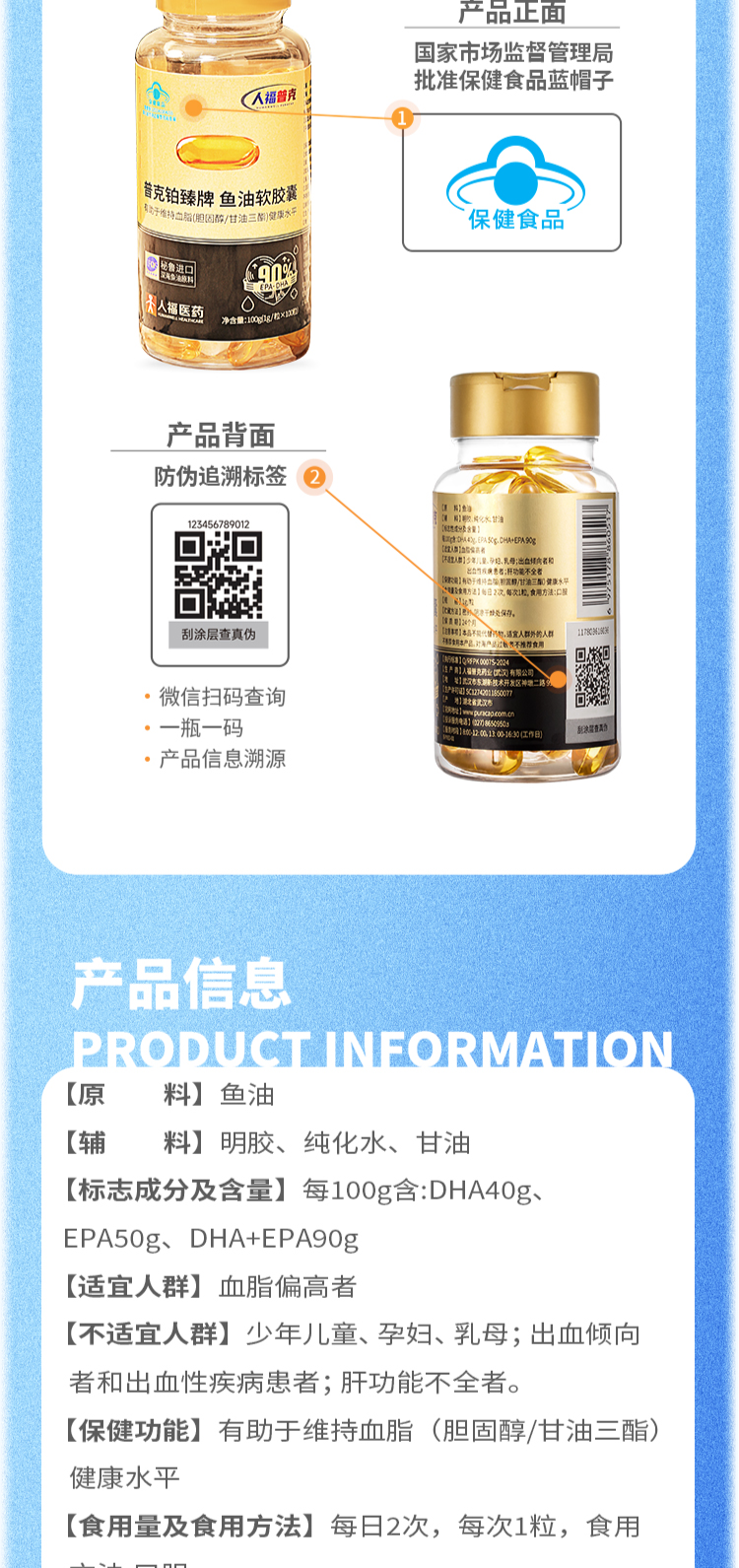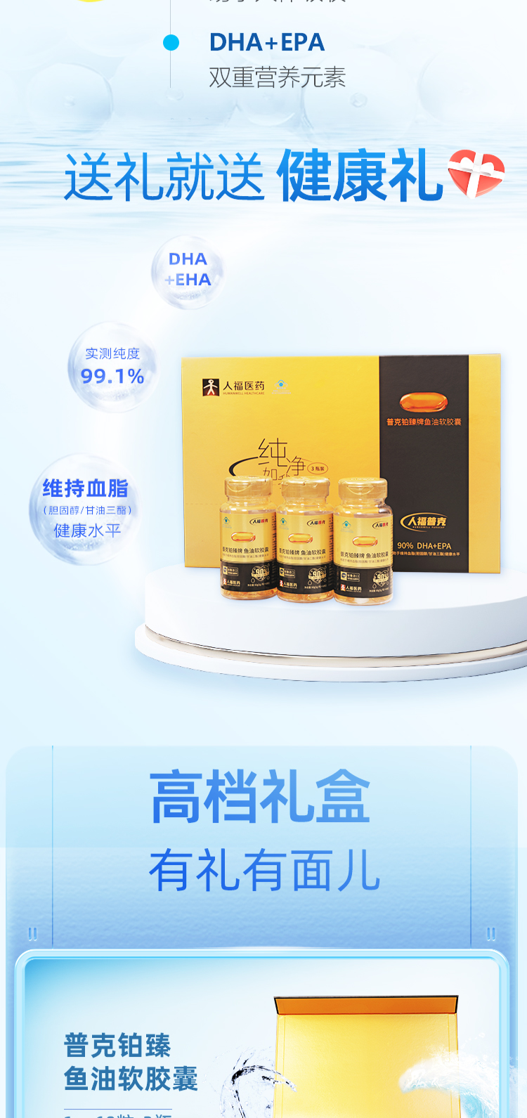 人福普克铂臻牌鱼油软胶囊99.1%高含量秘鲁进口鱼油礼盒1g*60粒【3瓶装】