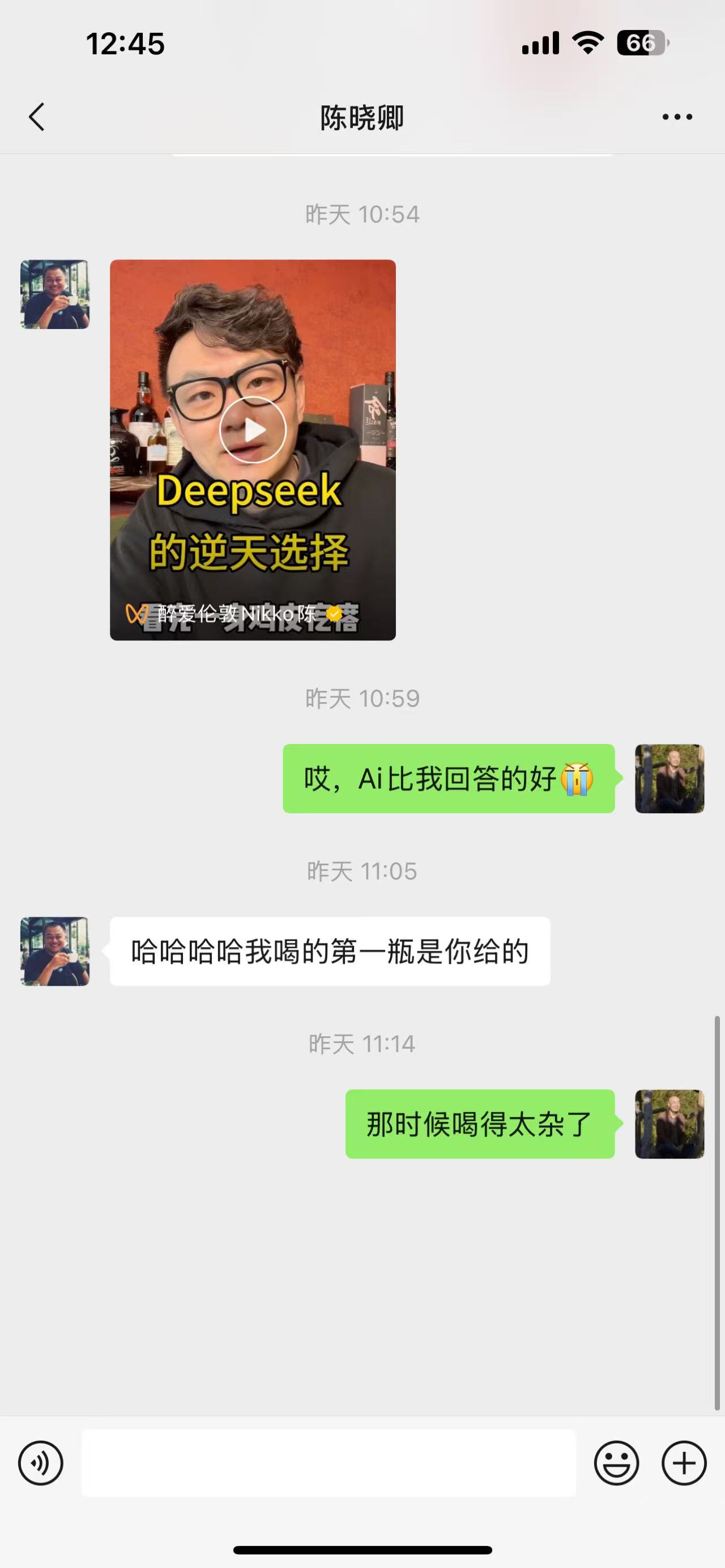 昨天陈晓卿老师给我发了一个视频:有人问DeepSeek:如果你变成人类,你最想喝的一瓶威士忌是什么?