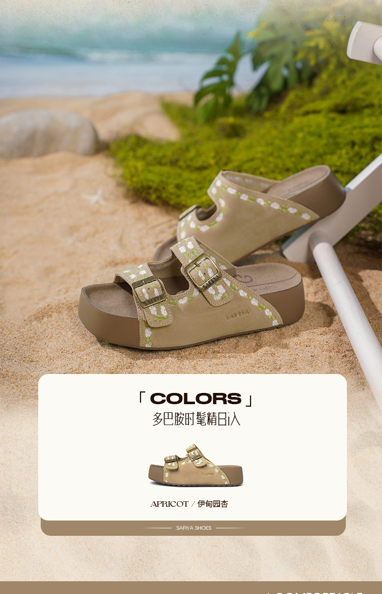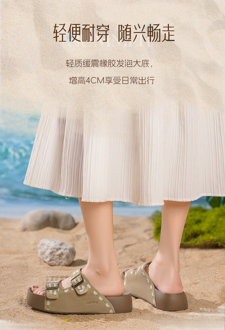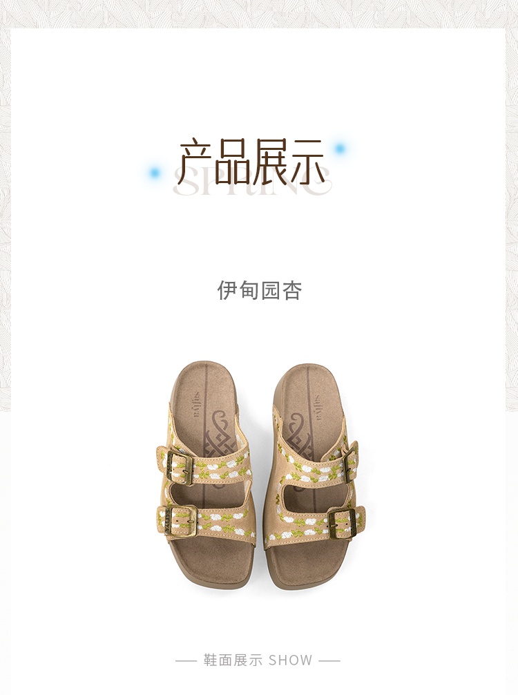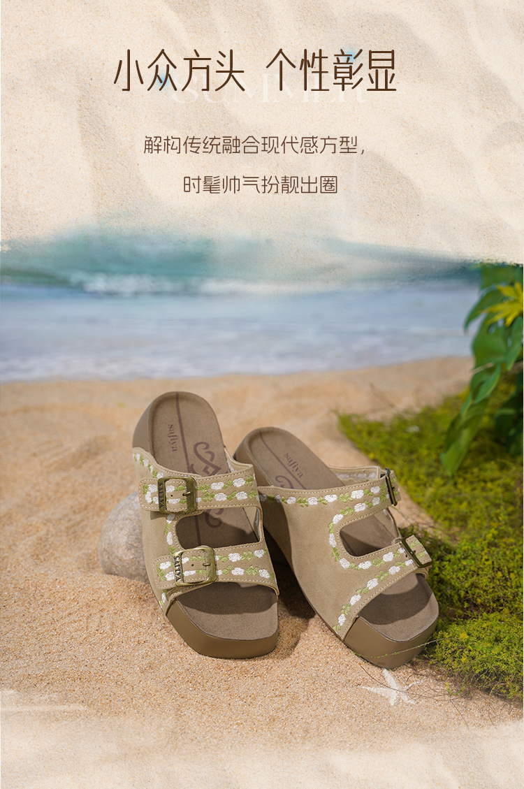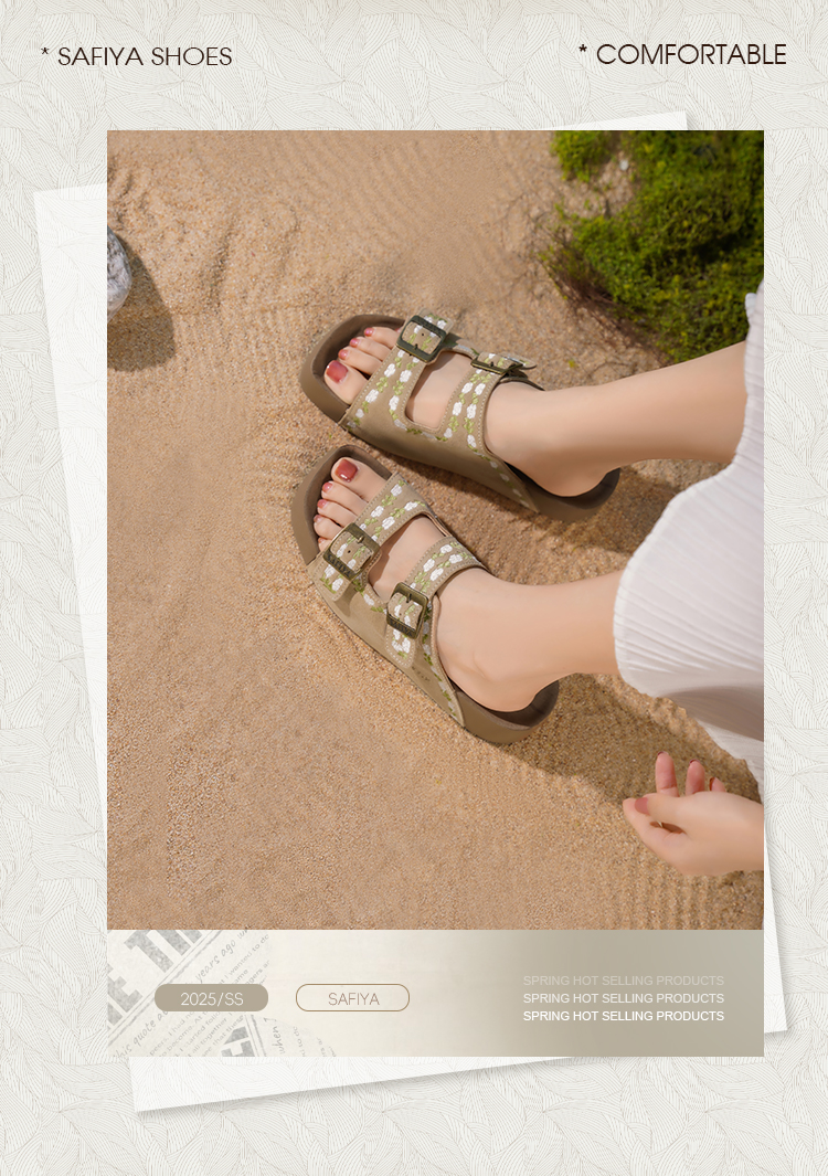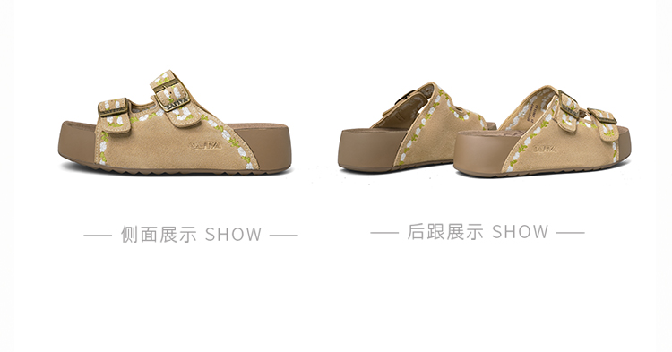 预售7天|Safiya/索菲娅2025小众方头花边刺绣外穿厚底休闲勃肯凉拖鞋SFD2110407