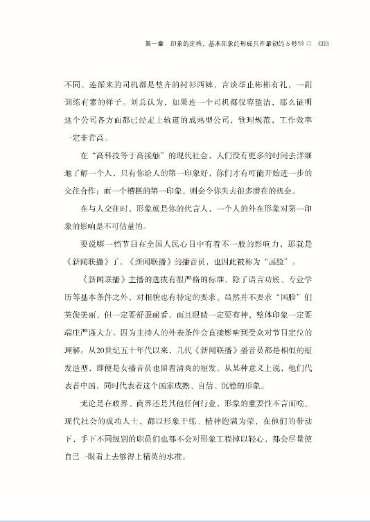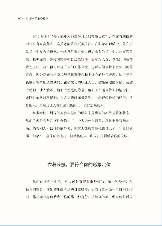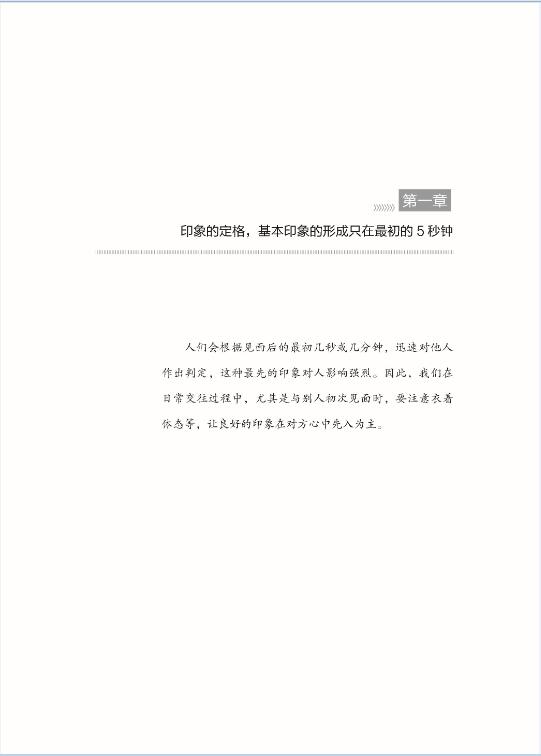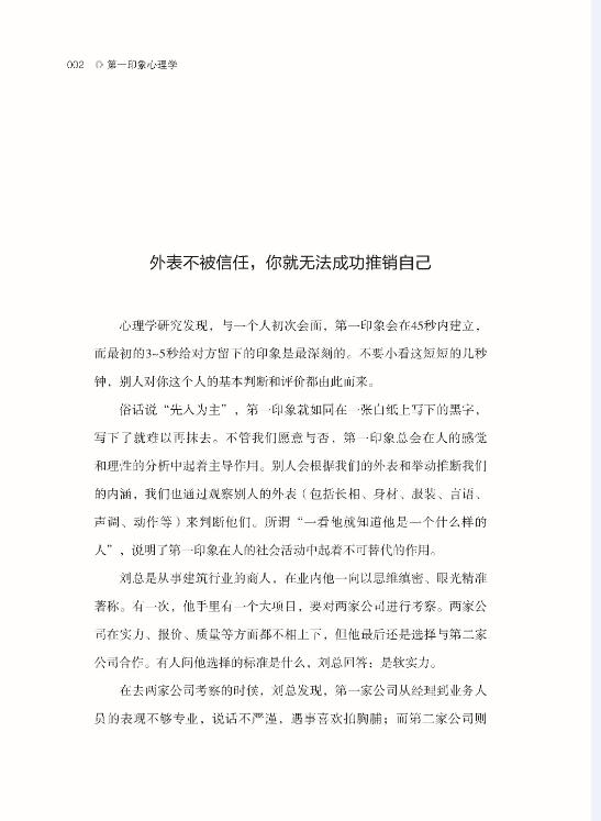 外表不被信任,你就无法成功推销自己心理学研究发现,与一个人初次会面,第一印象会在45秒内建立, 而 最 初 的3~5 秒 给 对 方 留 下 的 印 象 是 最 深 刻 的 。 不 要 小 看 这 短 短 的 几 秒 钟,别人对你这个人的基本判断和评价都由此而来。俗话说“先入为主”,第一印象就如同在一张白纸上写下的黑字, 写下了就难以再抹去。不管我们愿意与否,第一印象总会在人的感觉 和理性的分析中起着主导作用。别人会根据我们的外表和举动推断我们 的内涵,我们也通过观察别人的外表(包括长相、身材、服装、言语、 声调、动作等)来判断他们。所谓“一看他就知道他是一个什么样的 人”,说明了第一印象在人的社会活动中起着不可替代的作用。 刘总是从事建筑行业的商人,在业内他一向以思维缜密、眼光精准 著称。有一次,他手里有一个大项目,要对两家公司进行考察。两家公 司在实力、报价、质量等方面都不相上下,但他最后还是选择与第二家 公司合作。有人问他选择的标准是什么,刘总回答:是软实力。 在去两家公司考察的时候,刘总发现,第一家公司从经理到业务人 员的表现不够专业,说话不严谨,遇事喜欢拍胸脯;而第二家公司则不同,连派来的司机都是整齐的衬衫西裤,言谈举止彬彬有礼,一副 训练有素的样子。刘总认为,如果连一个司机都仪容整洁,那么证明 这个公司各方面都已经走上轨道的成熟型公司,管理规范,工作效率 一定非常高。在“高科技等于高接触”的现代社会,人们没有更多的时间去详细 地了解一个人,只有你给人的第一印象好,你们才有可能开始进一步的 交往合作;而一个糟糕的第一印象,则会令你失去很多潜在的机会。 在与人交往时,形象就是你的代言人,一个人的外在形象对第一印象的影响是不可估量的。