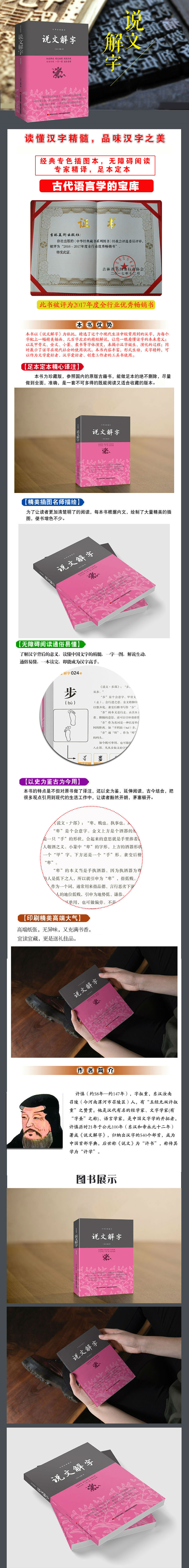 ★精心译注足本定本无障碍阅读精美插图古为今用经典珍藏。 ★中国历史上一部分析字形、解说字义、辩识声读的字典,也是1800年来一部研究汉字的经典著作。 ★了解汉字背后的意义,读懂中国文字的精髓,一字一图,解说生动,通俗易懂,一本读完,即能成为汉字高手。 《中华经典藏书系列》从立项到出版,历时三年,花费大量精力财力,倾力打造。所收书目是传统国学中很经典的著作,以经典版本为核校底本,进行注释和翻译,认真研究,精雕细琢。 【足本定本精心译注】 《说文解字:中华经典藏书平装版》为经典珍藏版,参照国内的原版古籍书,能做足本的绝不删除,尽量做到全面,准确,是一套的既能阅读又适合收藏的不错版本。 【精美插图名师描绘】 为了让读者更加清楚明了的阅读,每本书根据内文,绘制了大量精美的插图,使书增色不少。 【无障碍阅读通俗易懂】 原版古籍书生涩难懂,对原文做了准确的翻译,并对每一个难读的字词和难懂的语句做了通俗的译注和点评。 【以史为鉴古为今用】 《说文解字:中华经典藏书平装版》的特点是不但对原书做了译注,还以史为鉴,延伸阅读,古今结合,把很多观点引用到现代的生活工作中,让读者豁然开朗,茅塞顿开。 【印刷精美高端大气】 《说文解字:中华经典藏书平装版》封面采用进口高端冰白纸,并做了烫金工艺;内文为了让读者阅读更舒服,保护读者视力,采用太阳高端本白胶版纸;内文用环保大豆油墨印刷,无异味,又充满书香。