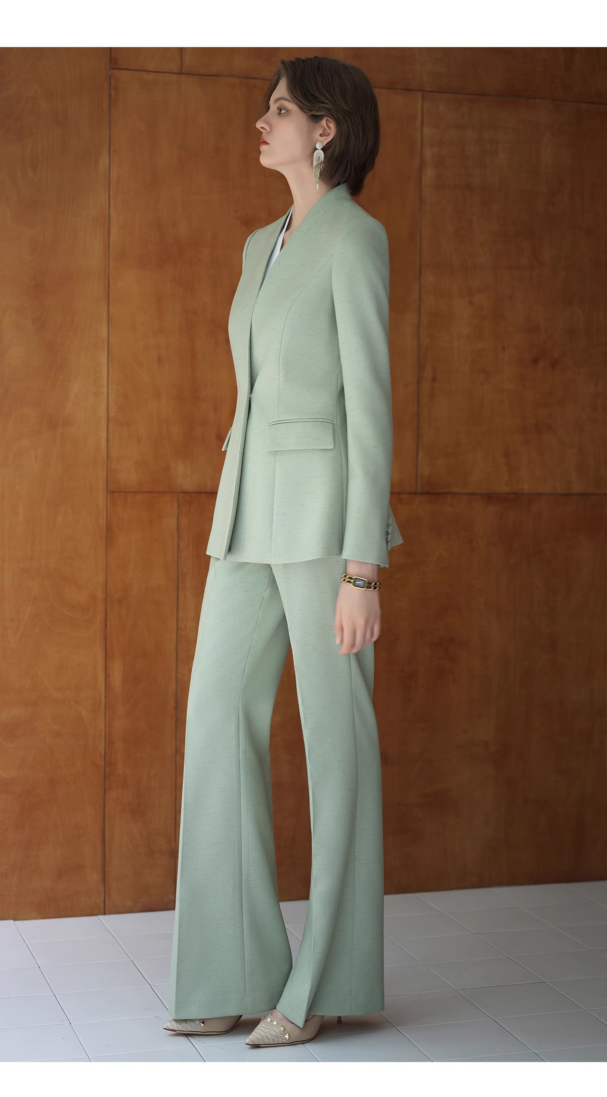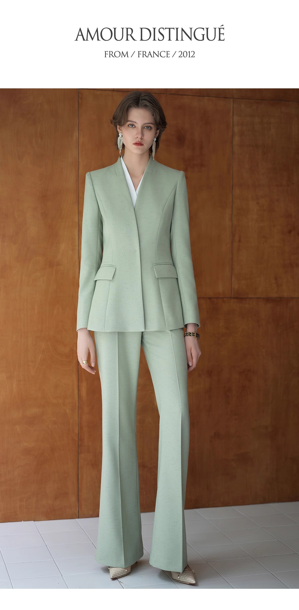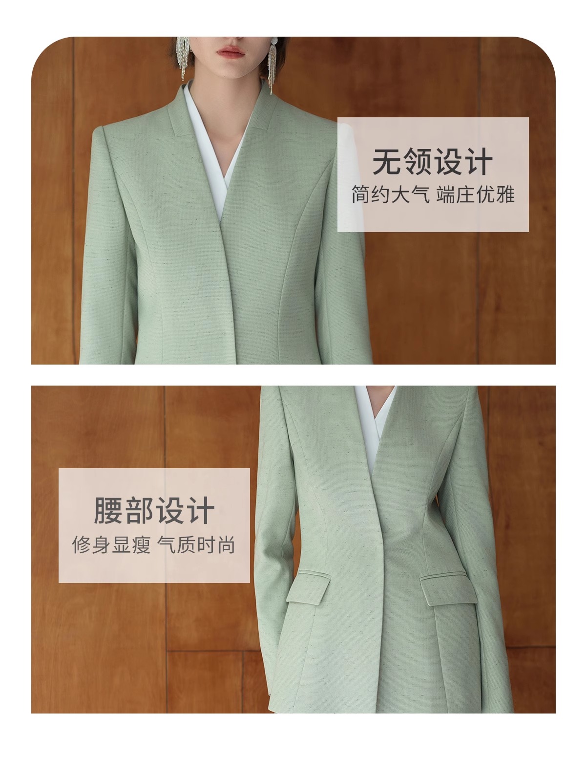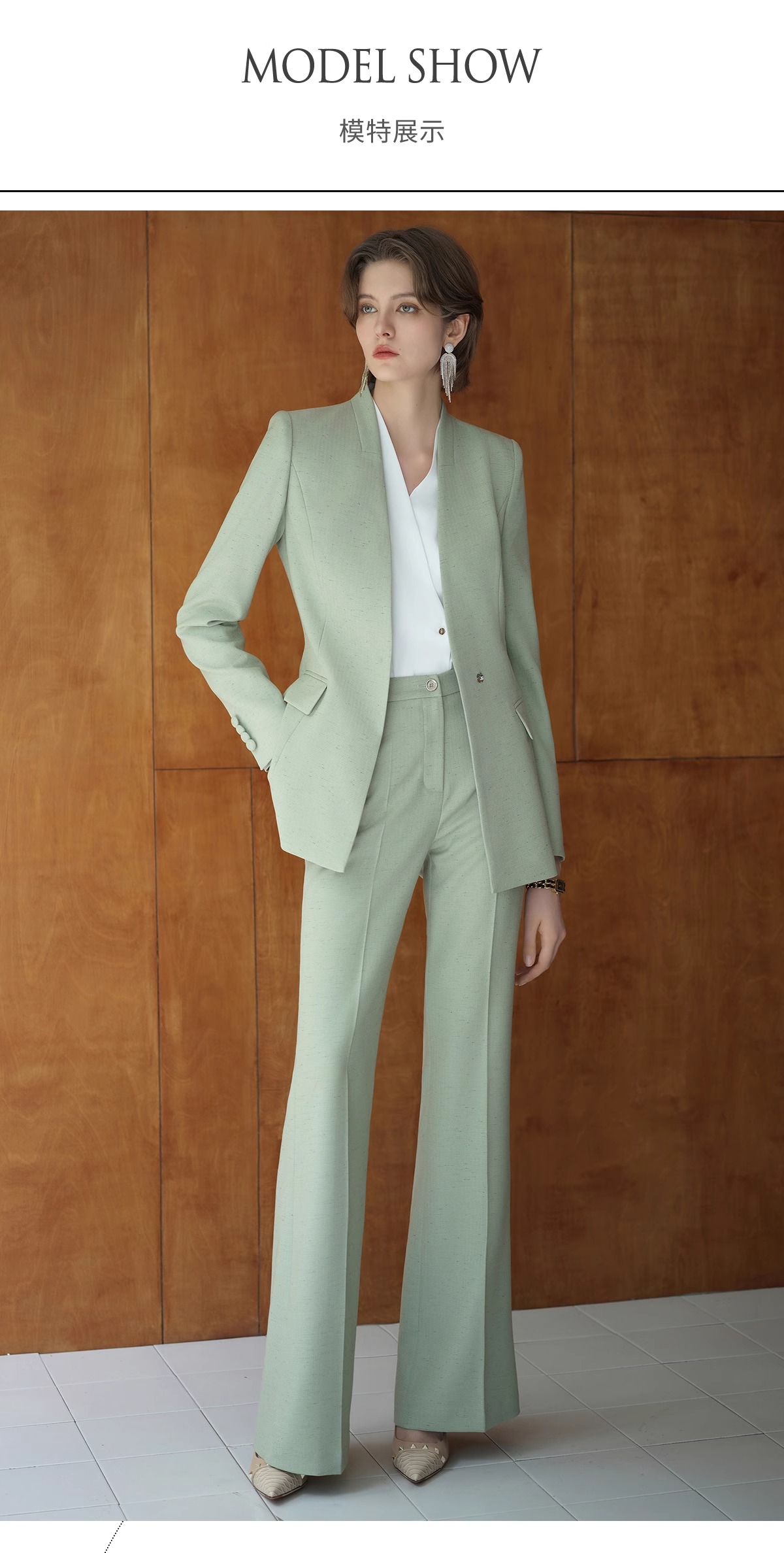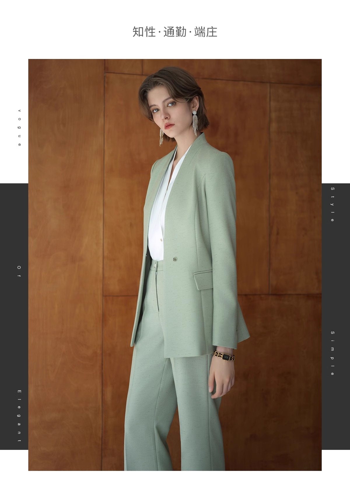 IWY/职场套装女绿色加厚西装外套无领中长款显瘦职业装气质阔腿裤装CP2182