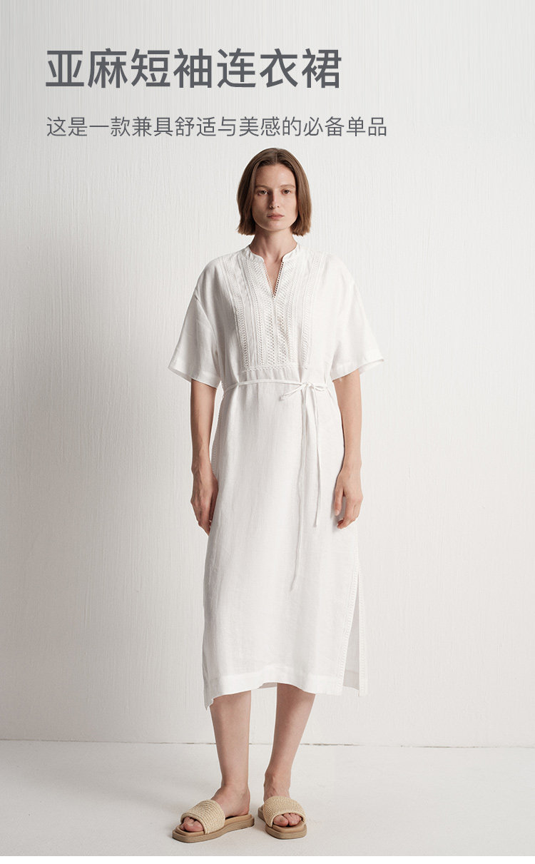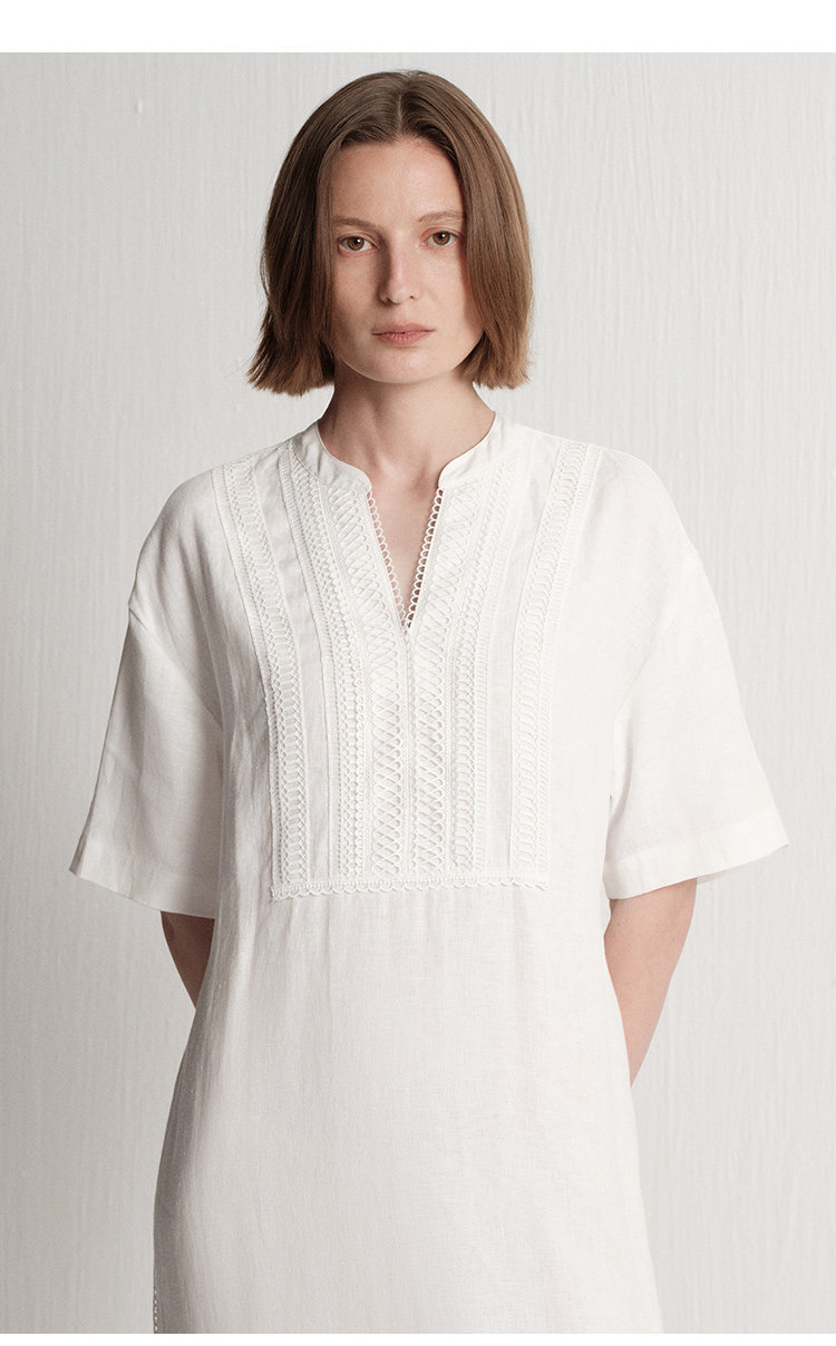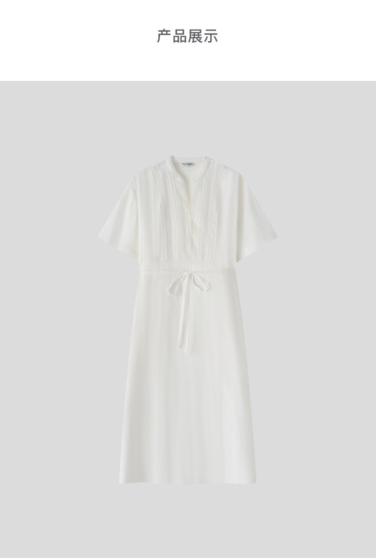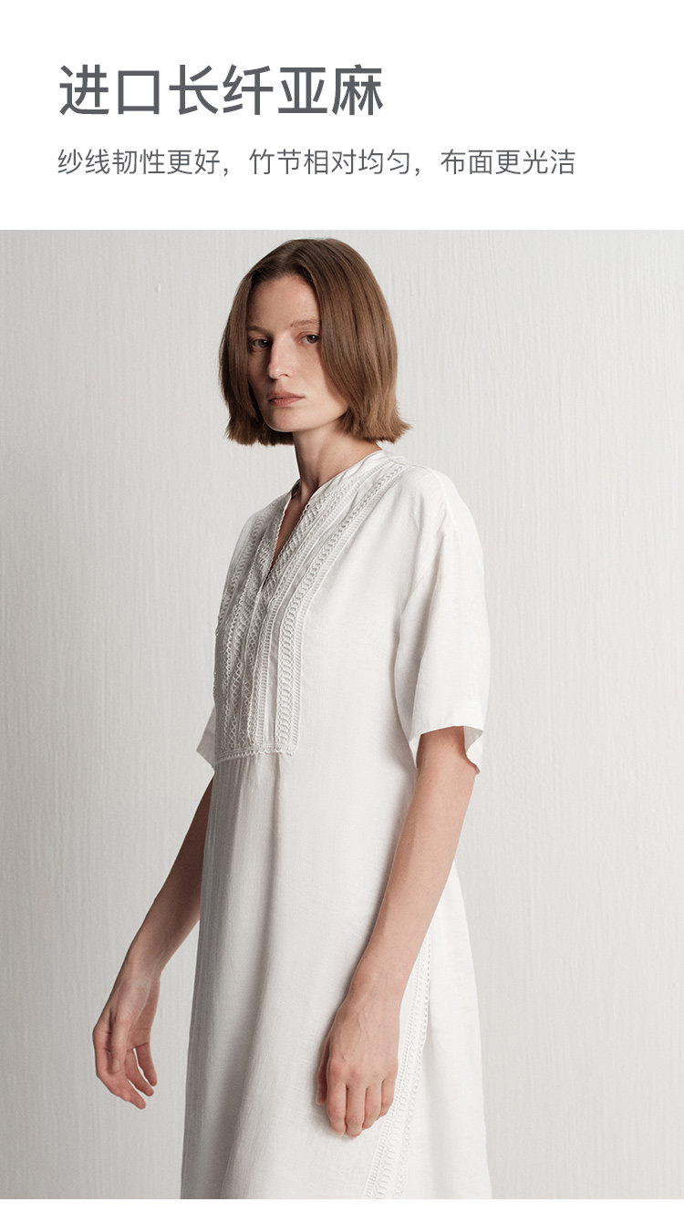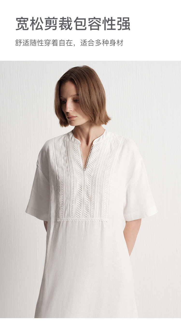 Marc O'Polo夏季新款好看气质白色V领蕾丝拼接亚麻短袖连衣裙女