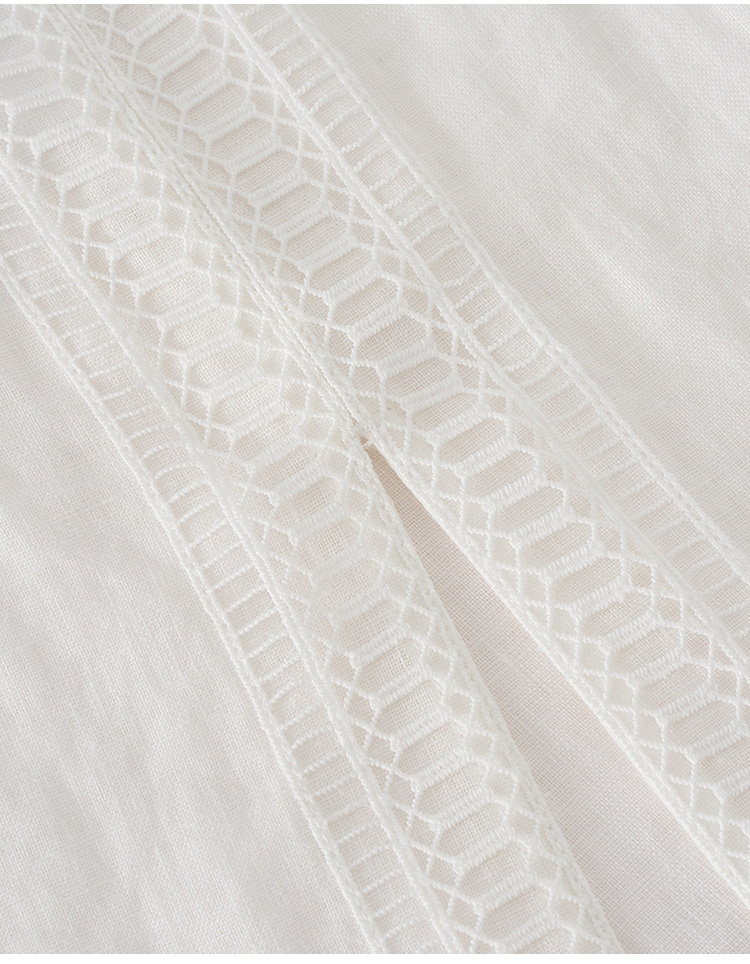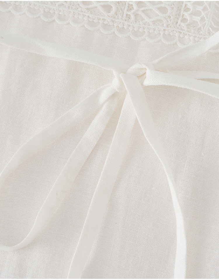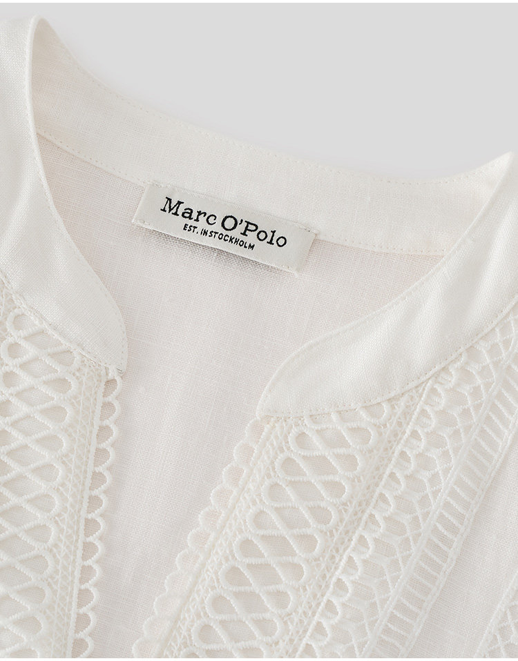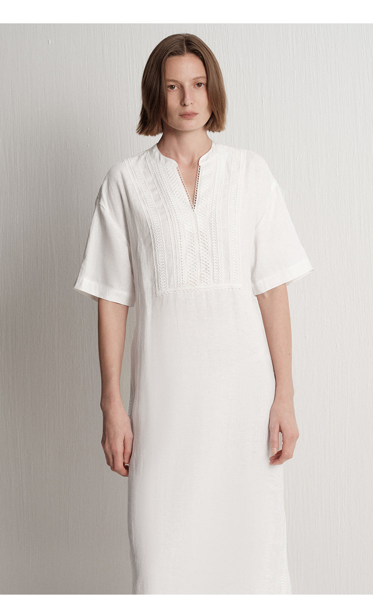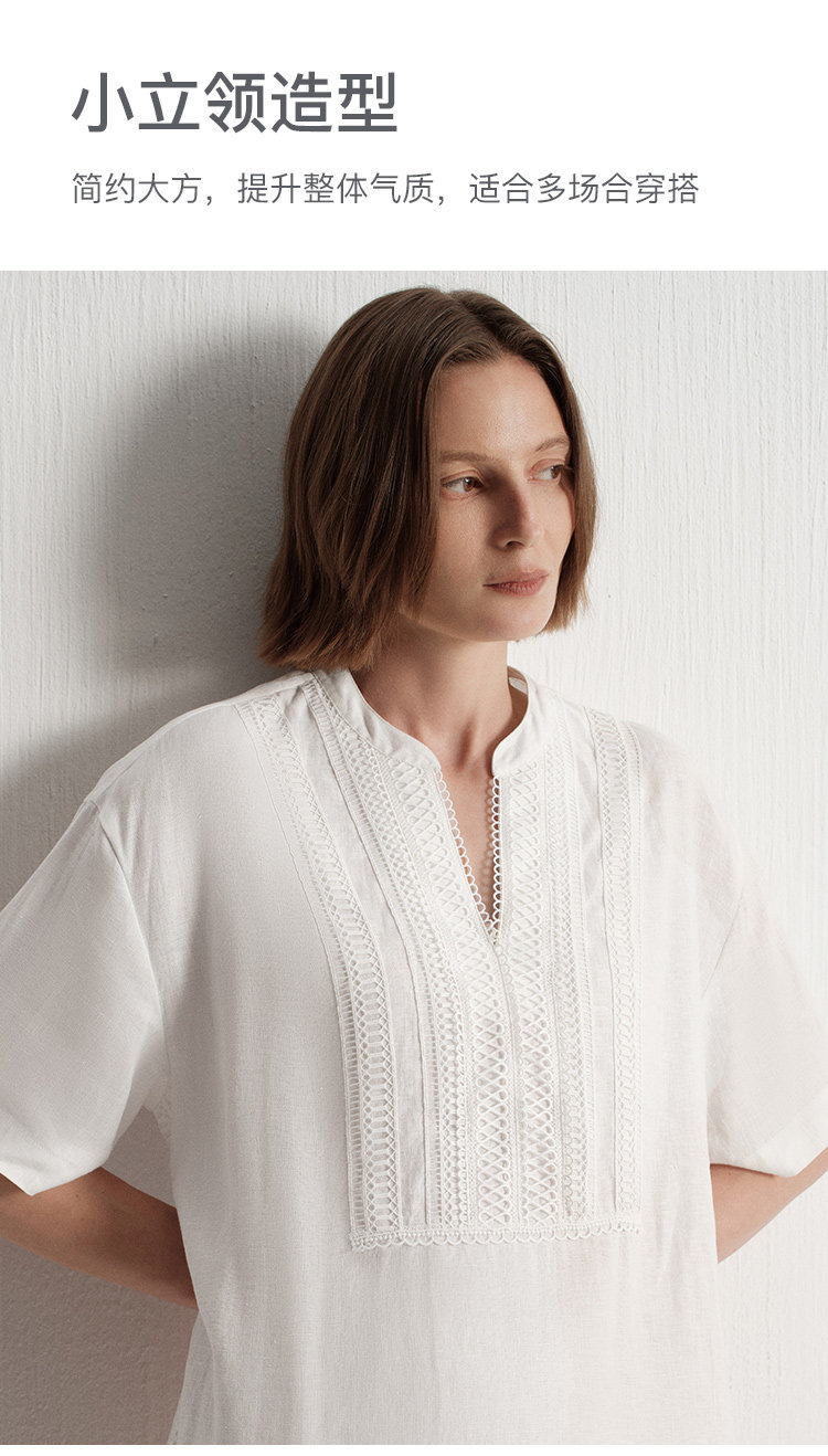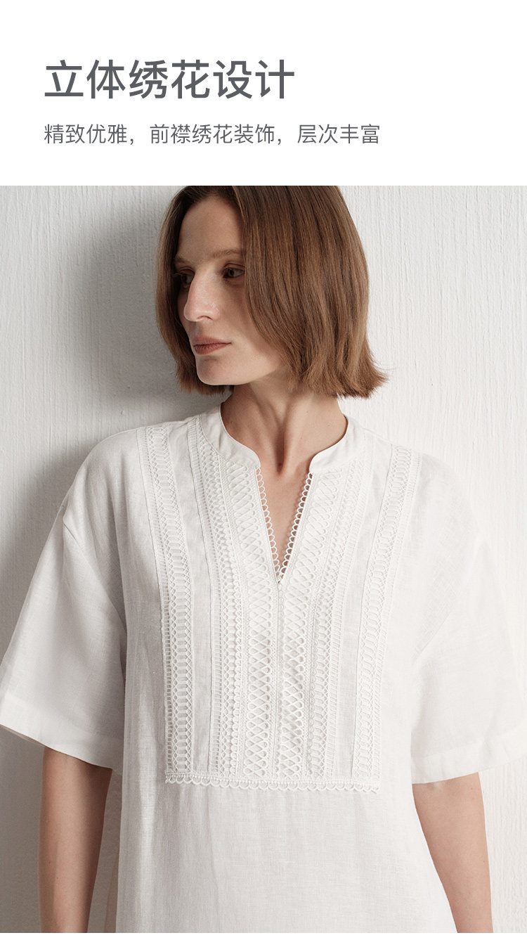 Marc O'Polo夏季新款好看气质白色V领蕾丝拼接亚麻短袖连衣裙女