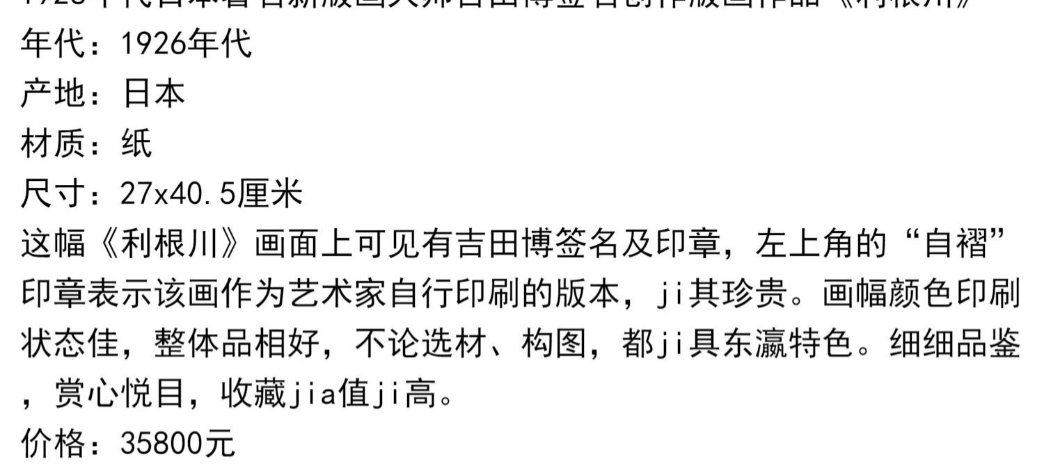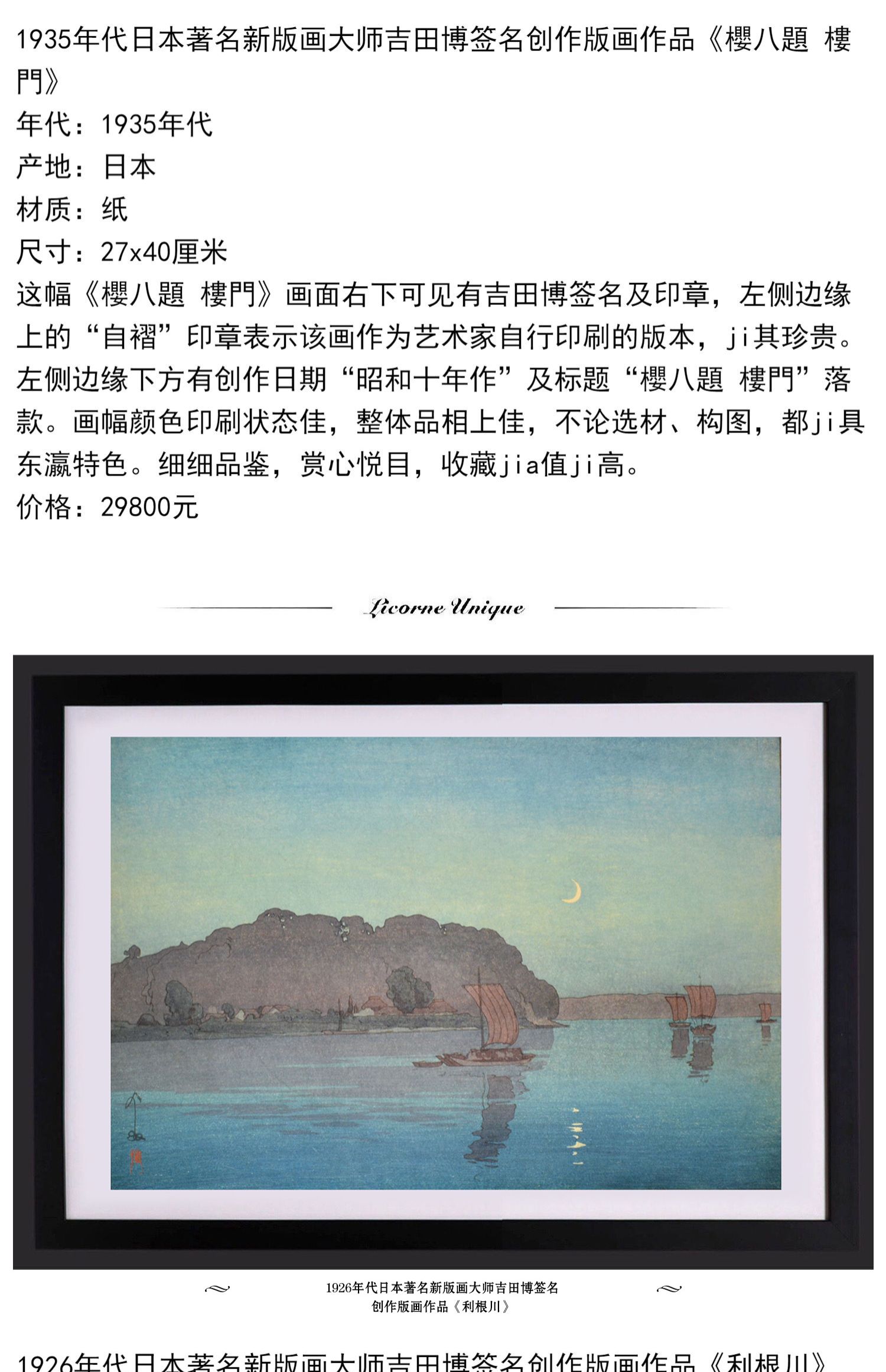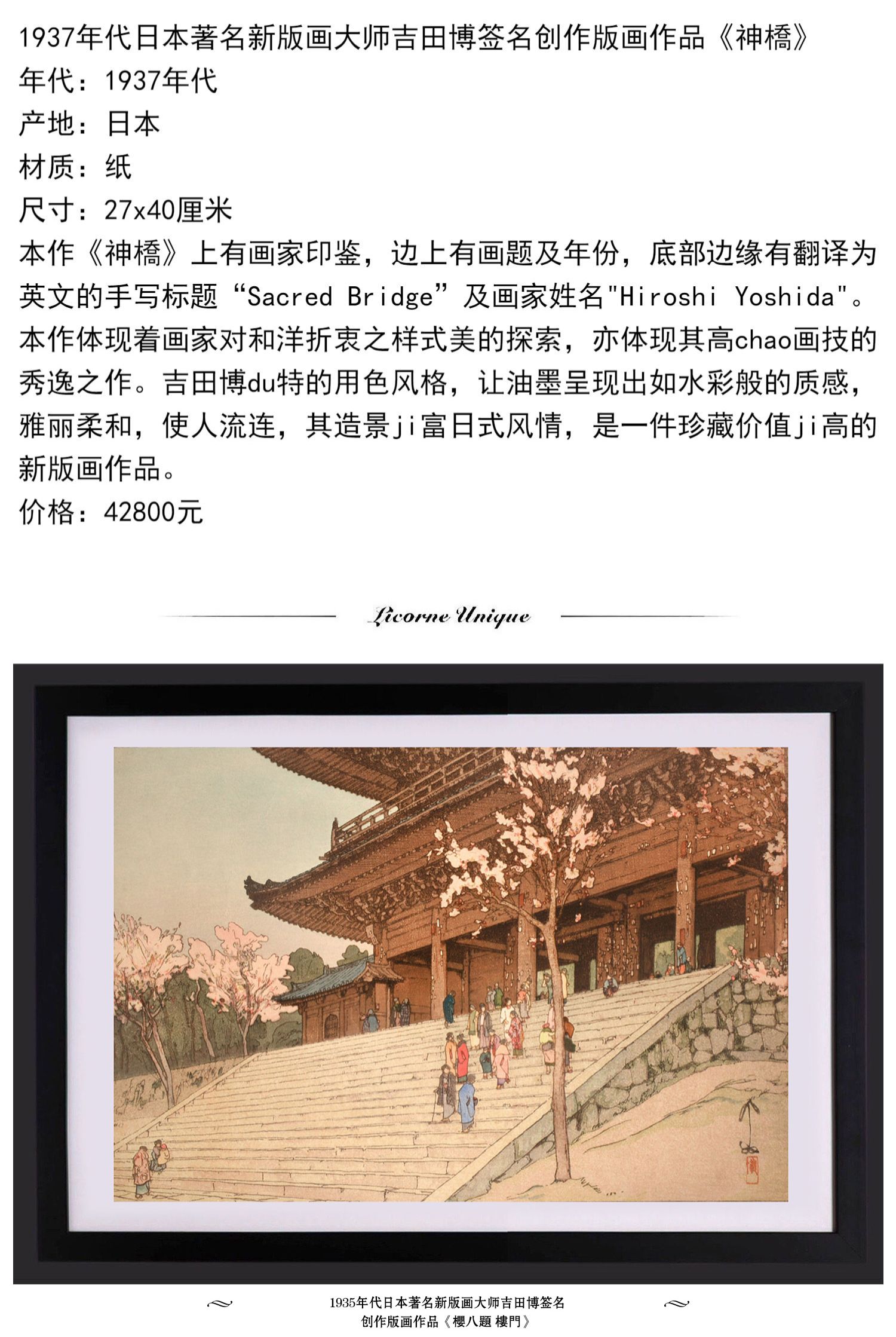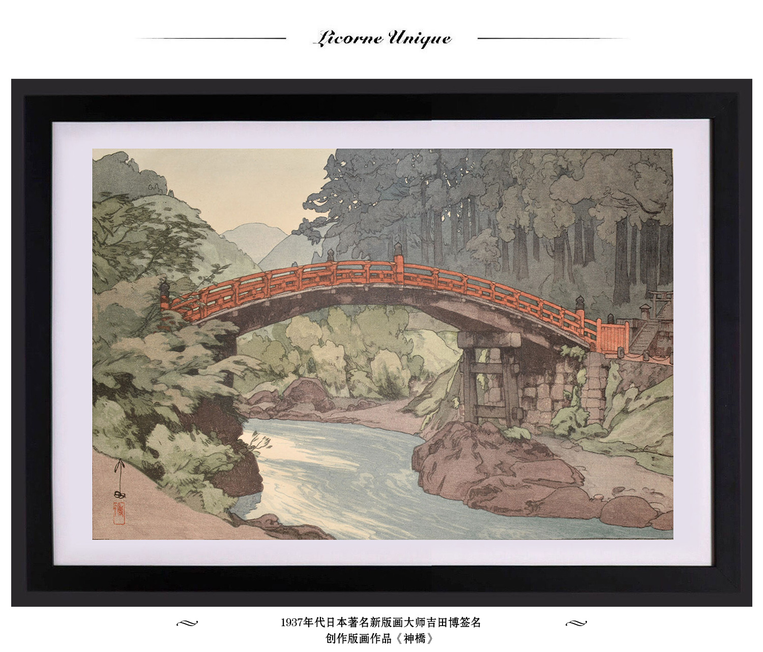 独角鹿西洋古董版画大师吉田博《神橋》《櫻八題樓門》《利根川》