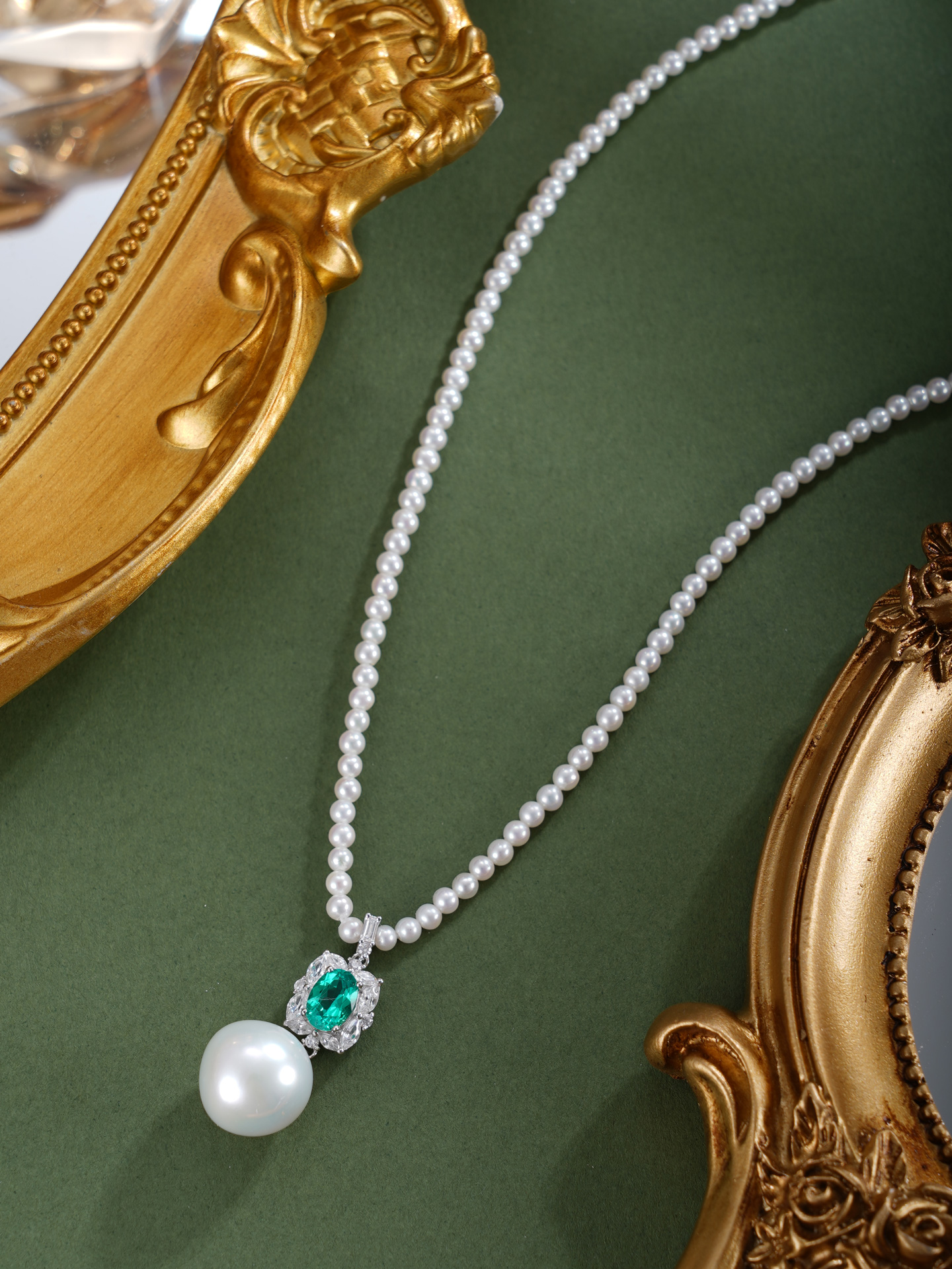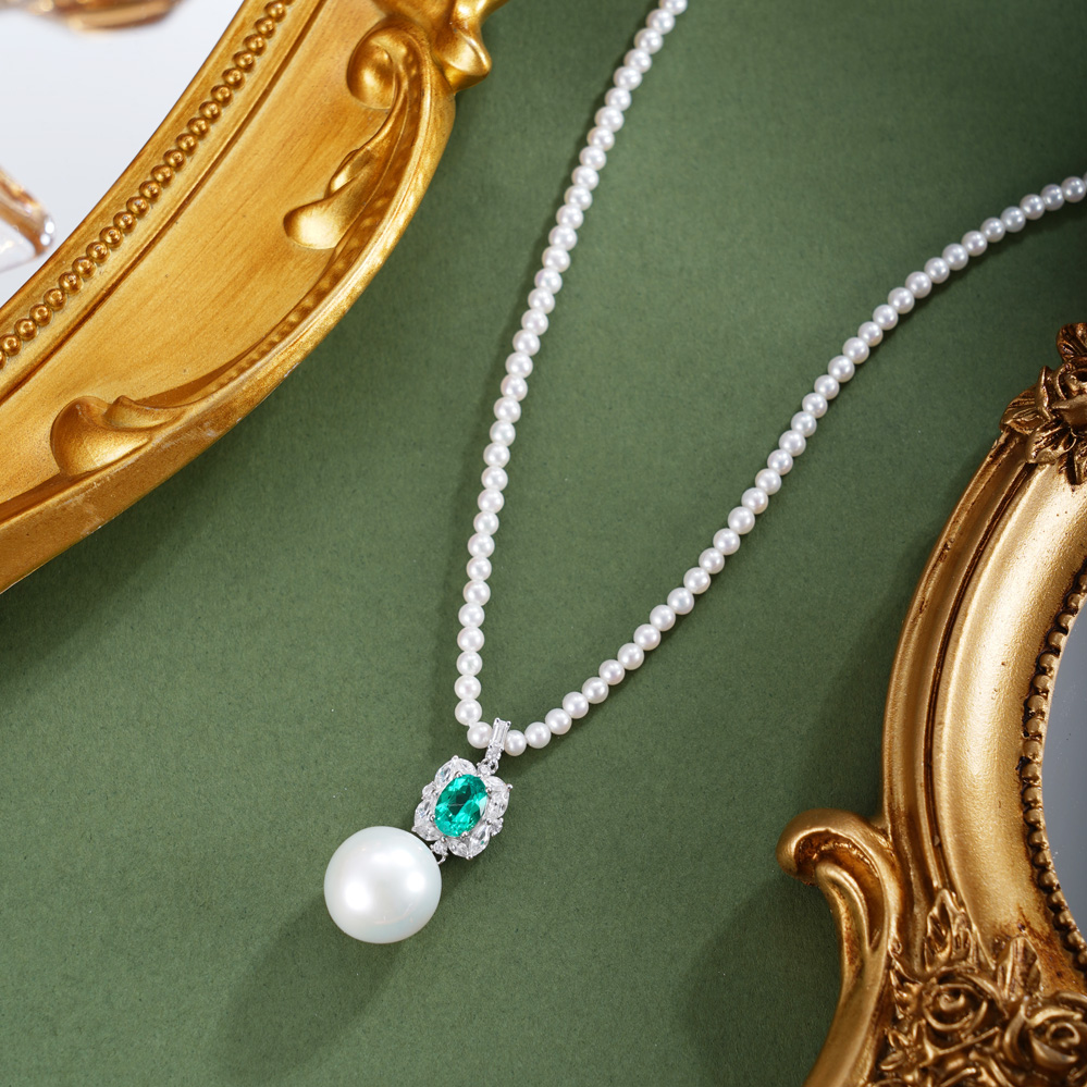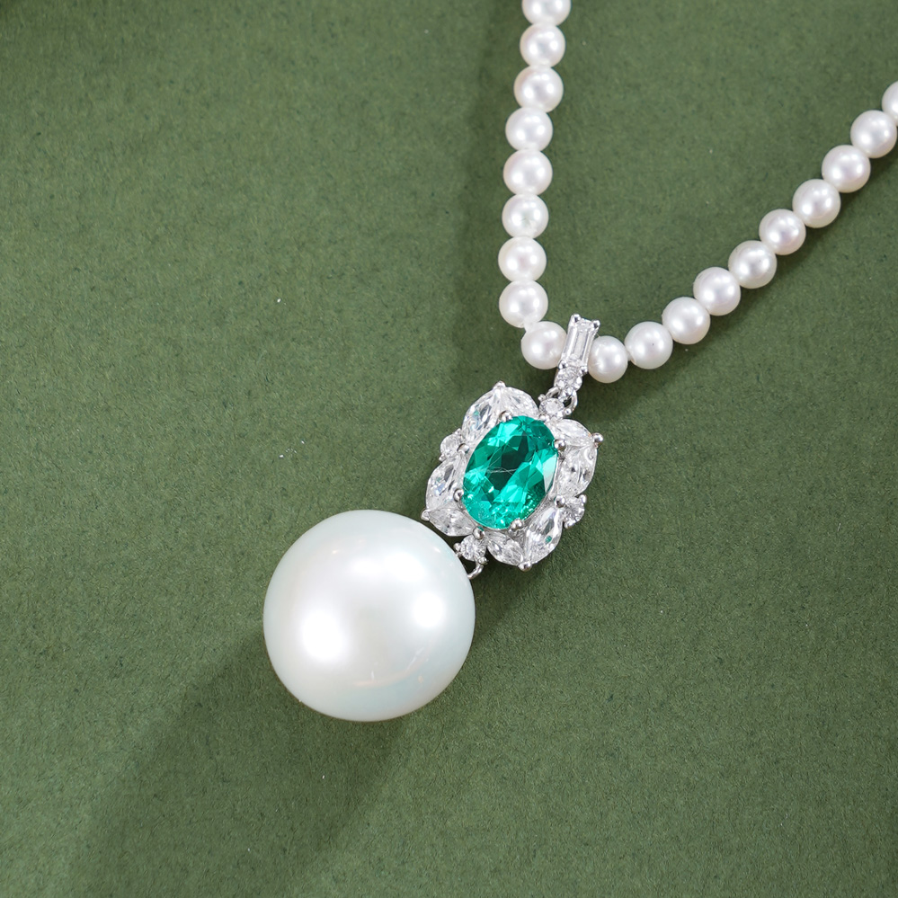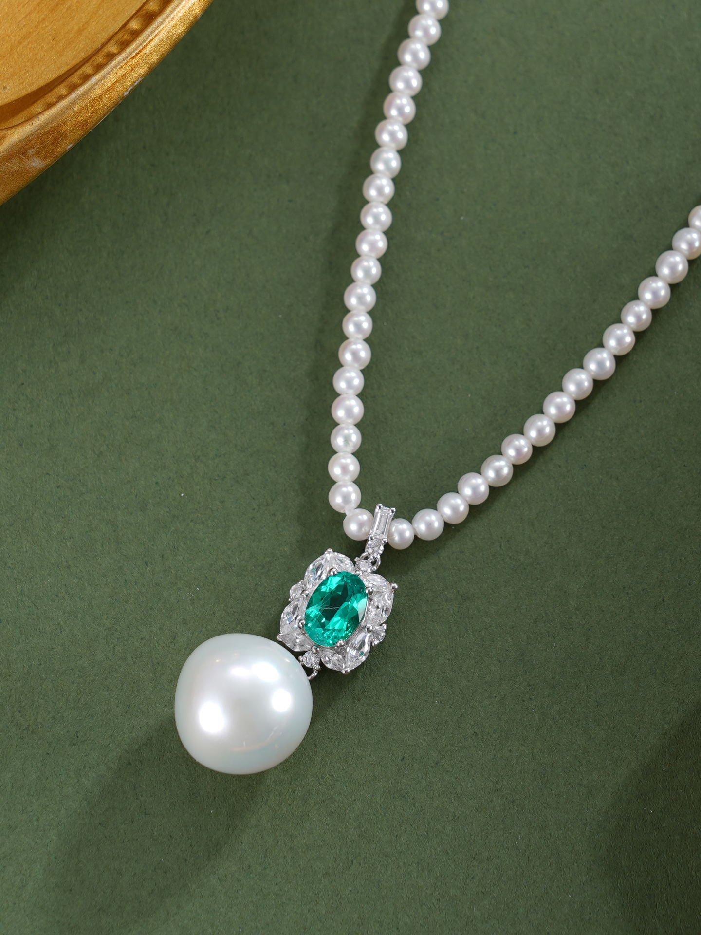 子佩集【碧落星语】银S925珍珠惜王妃项链【ZZXL037】2.8mm小珠12mm大珠绿椭圆方块2601