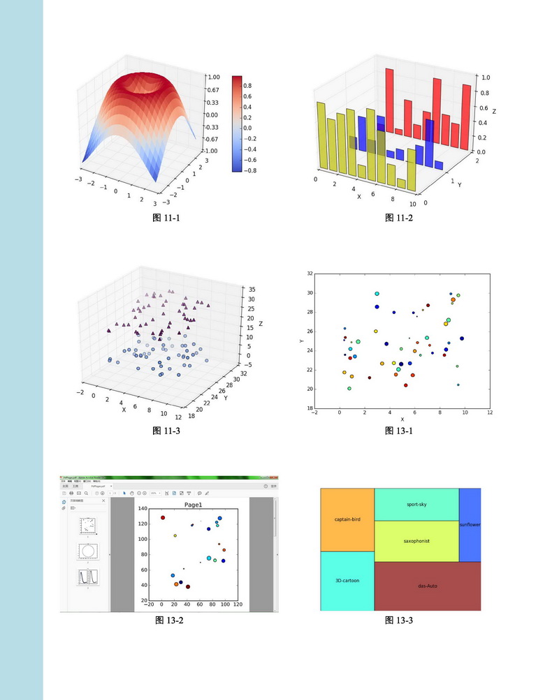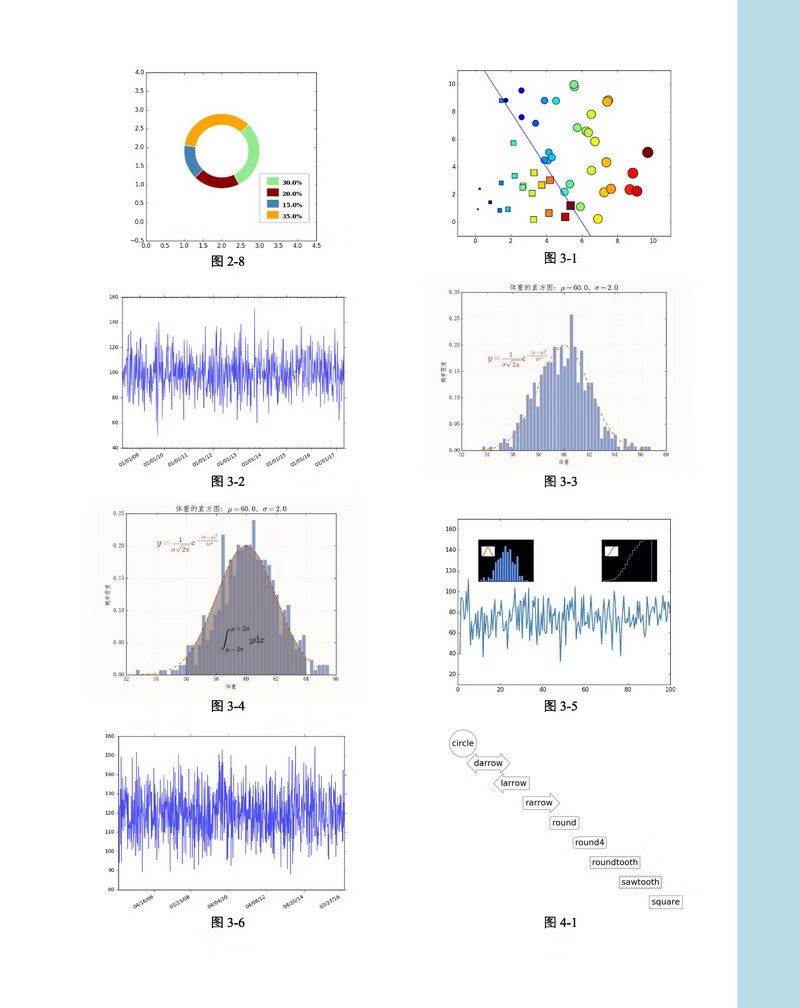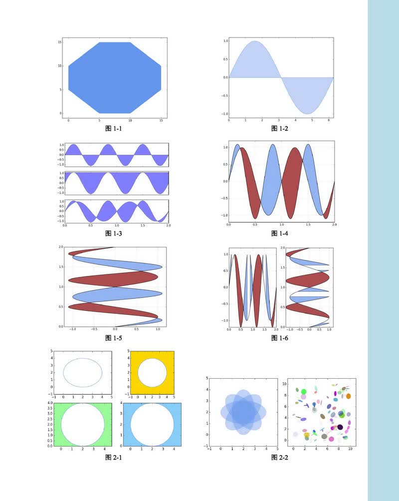 第1篇:图形(第1 ~ 3章)。首先讲解向多边形和交叉曲线等几何图形里填充颜色的实现方法;其次讲解使用模块patches绘制几何图形的实现方法,这些几何图形包括圆、椭圆、矩形、圆弧、楔形等;最后讲解组合展示统计图形的实现方法,包括判别分析示意图、时间序列图、概率密度曲线等。