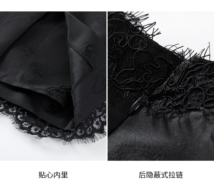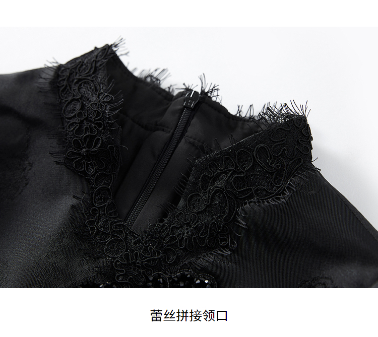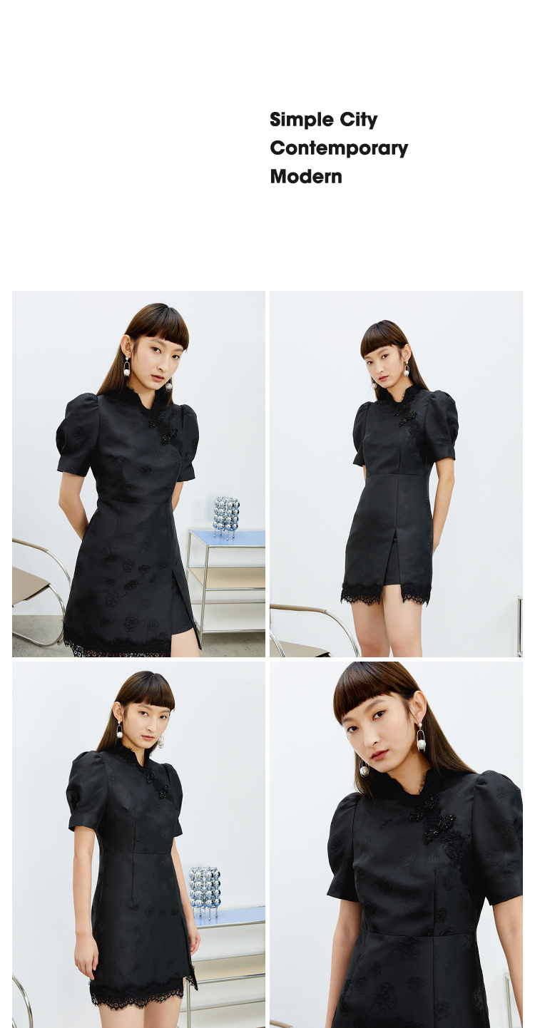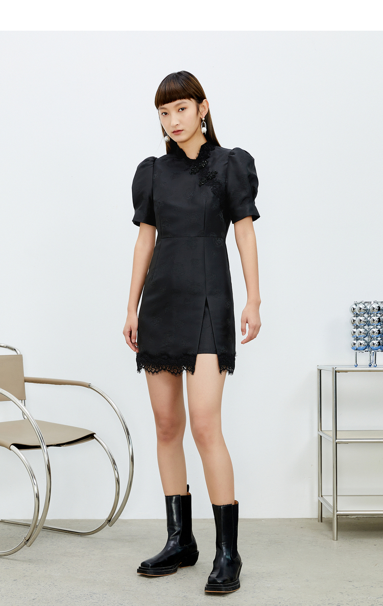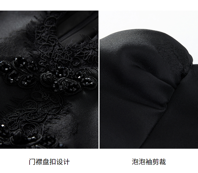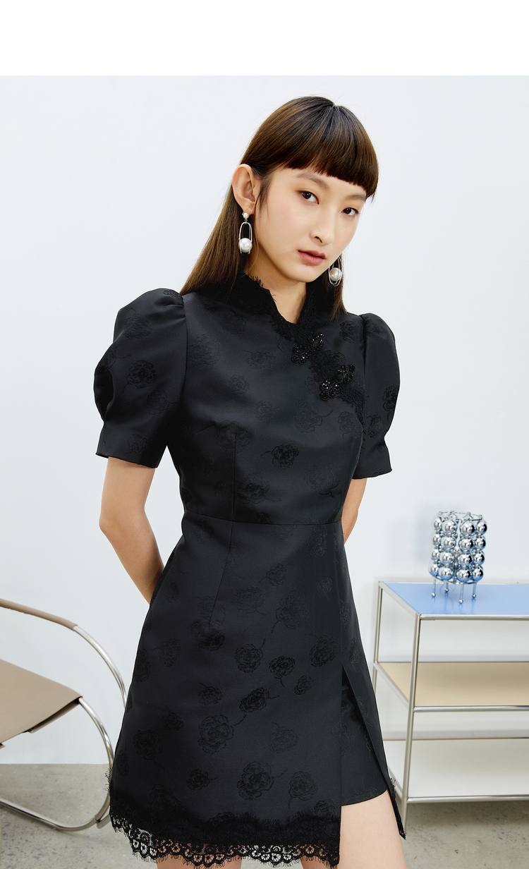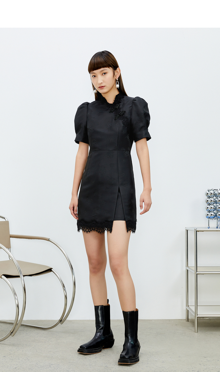 NEELLY纳俪商场同款中国风盘扣连衣裙女显瘦泡泡袖蕾丝拼接A字裙N22023Y02003
