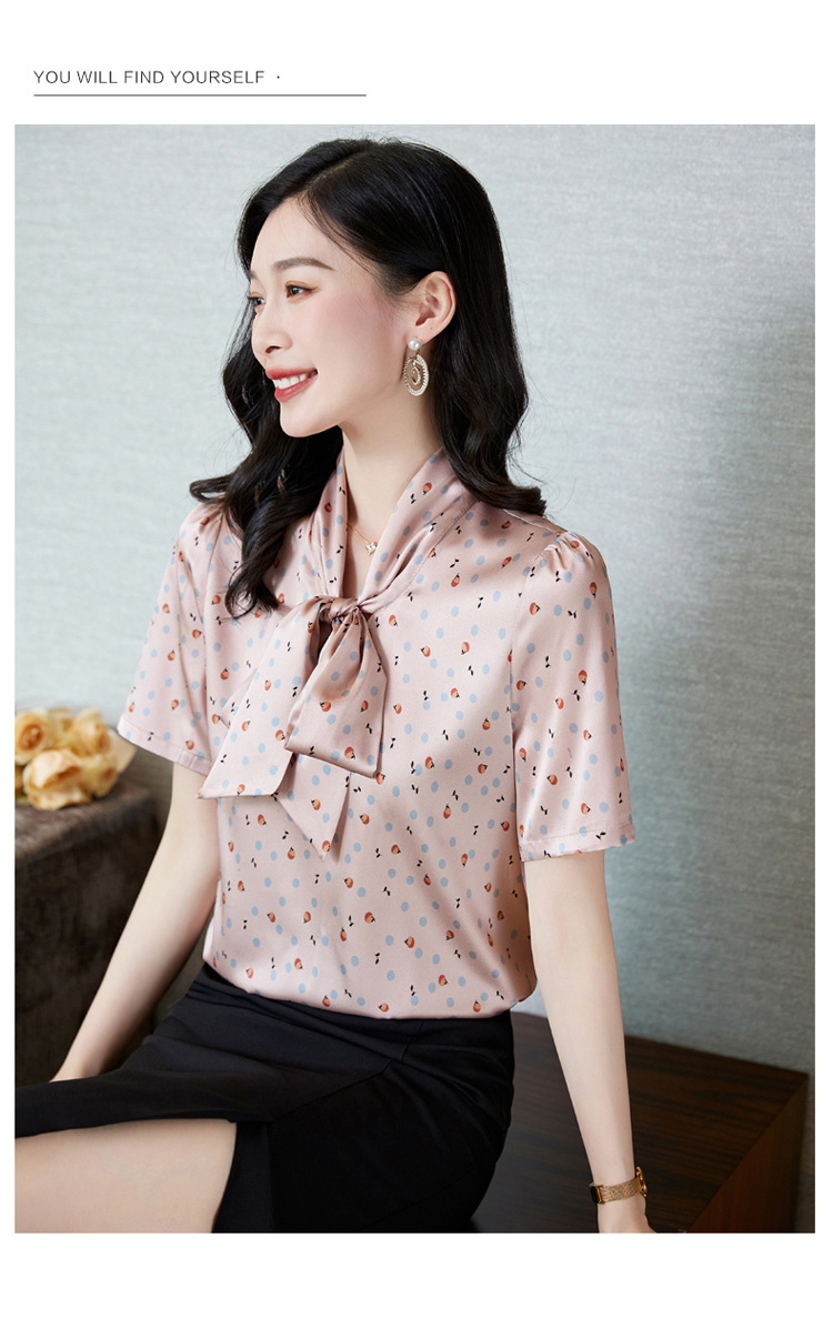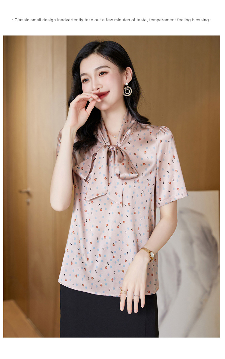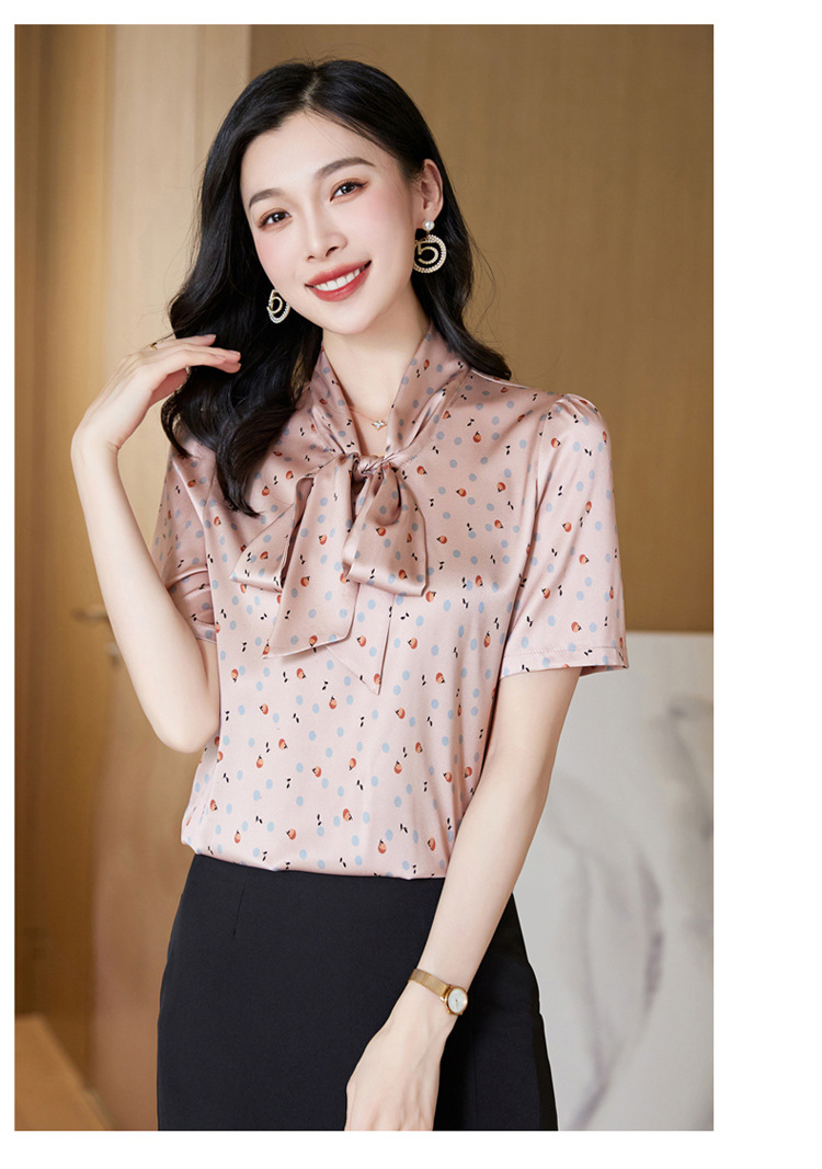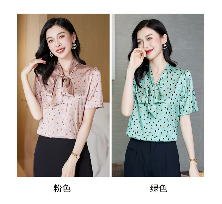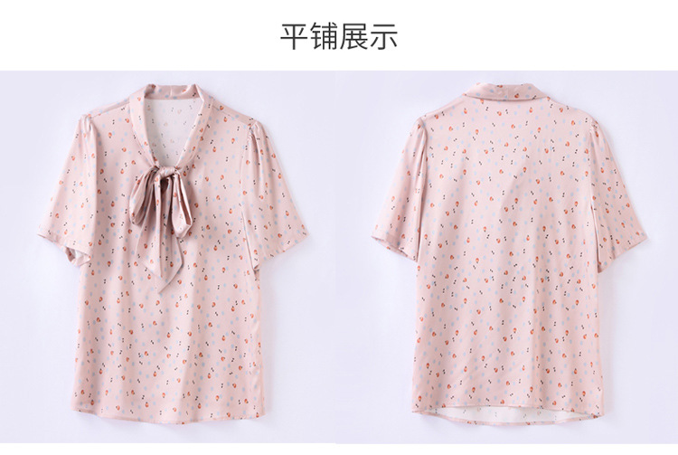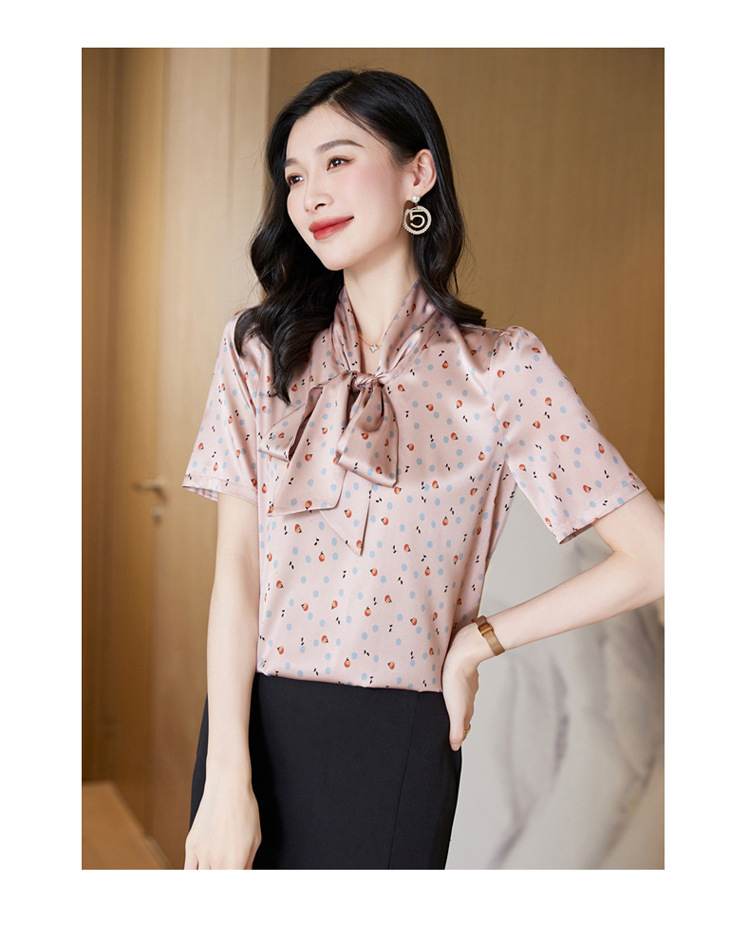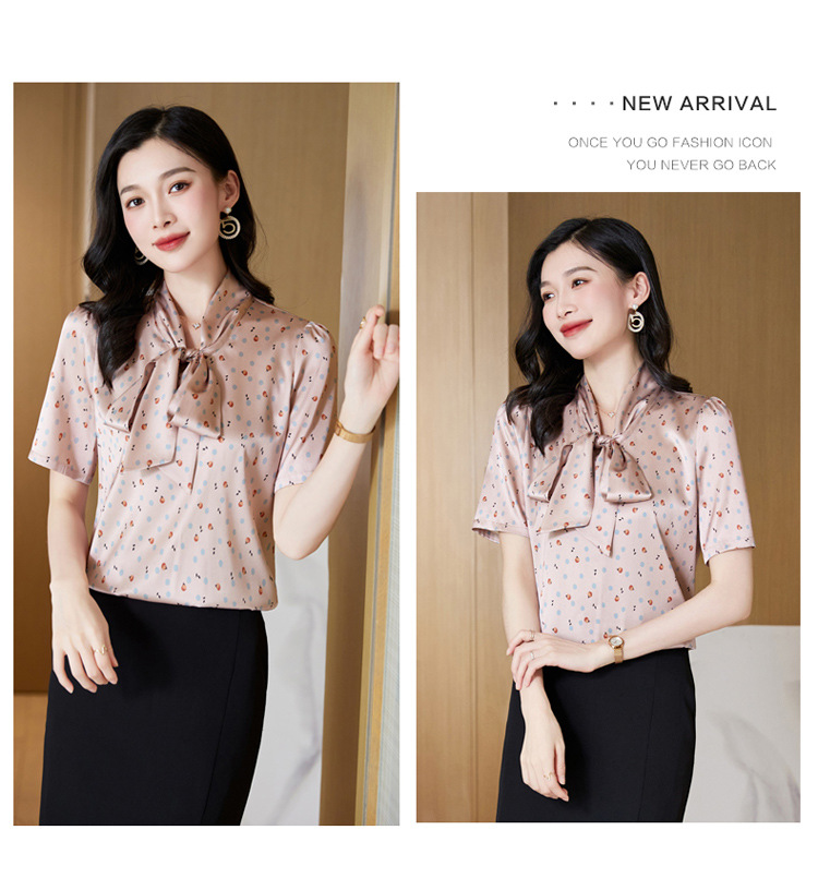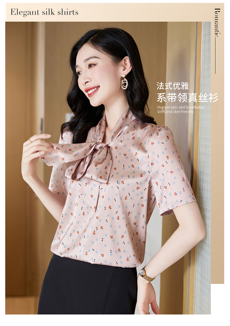 真丝短袖衬衫2023新款印花蝴蝶结飘带洋气桑蚕丝小衫上衣LS-3602