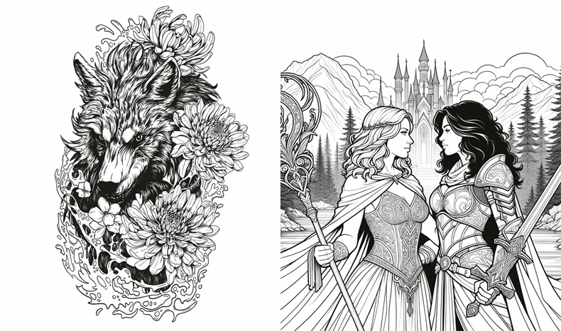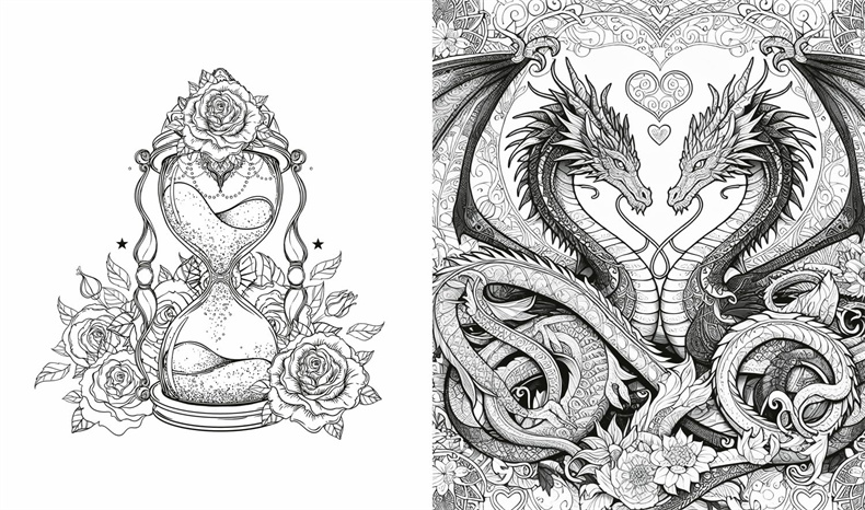 一本精美的涂色书,充满了以经典浪漫奇幻元素为灵感的艺术作品。