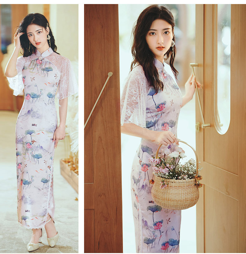 【丹凤朝阳】紫色斜开叉长款年轻款演出旗袍YD90