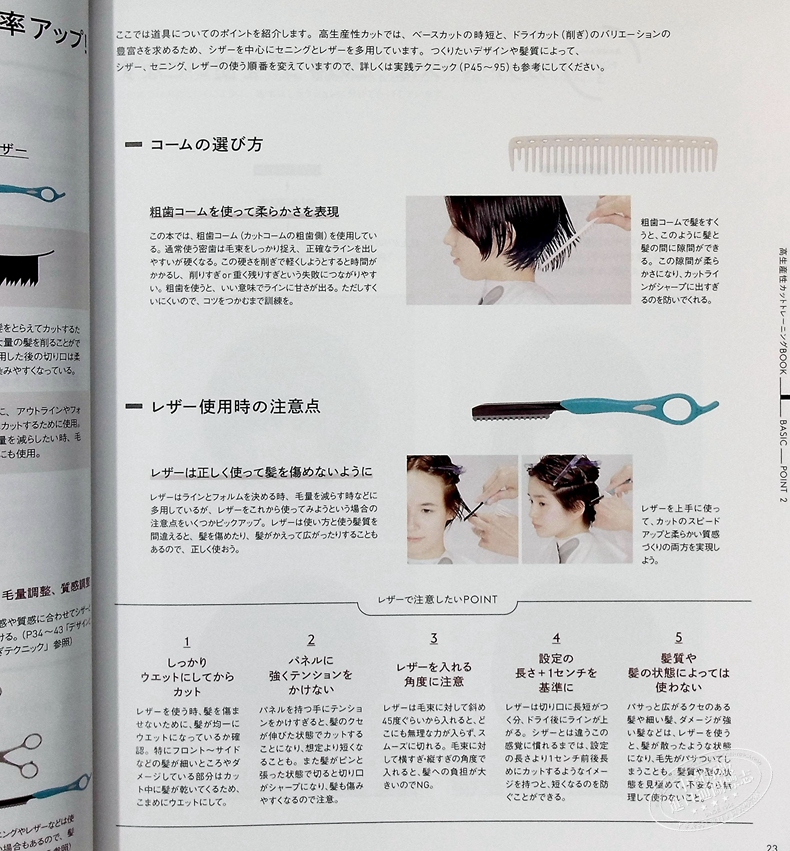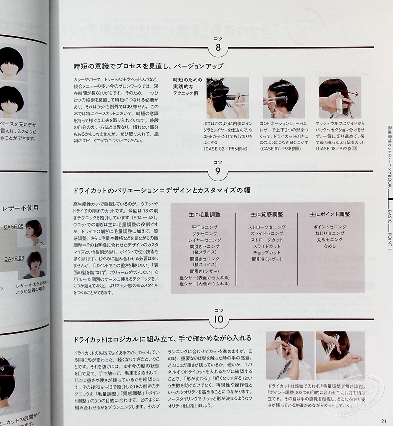 MESSAGE/DESIGN VARIATION/INTRODUCTION/高生産性カット“I0のコツ”/“3つの道具”を使い分けて効率アップ!/カットベースは“この4つ”を使いこなす/デザインと素材対応を広げる“I8”の削ぎテクニック/COLUMN1 横スライス時代のベーシックとは?/高生産性カット実践編/COLUMN2 売り上げ額別の壁を乗り越えて、スタイリストとして成長する/COLUMN3 「わかる」→「楽しい」→「もっと知りたい」が上達のプロセス/PDCAサイクルでレベルアップ!冨山流カウンセリング術/巻頭ページカットテクニック