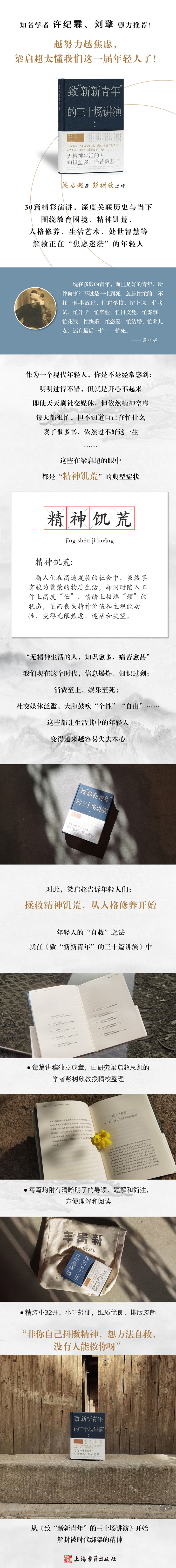 1920年代,梁启超倾注全部热情的三十场讲演:关于教育的出路,和青年的成长。这些问题依然是我们现在关注的焦点,梁启超的声音跨越了一百年,如今听来格外温暖、振聋发聩。