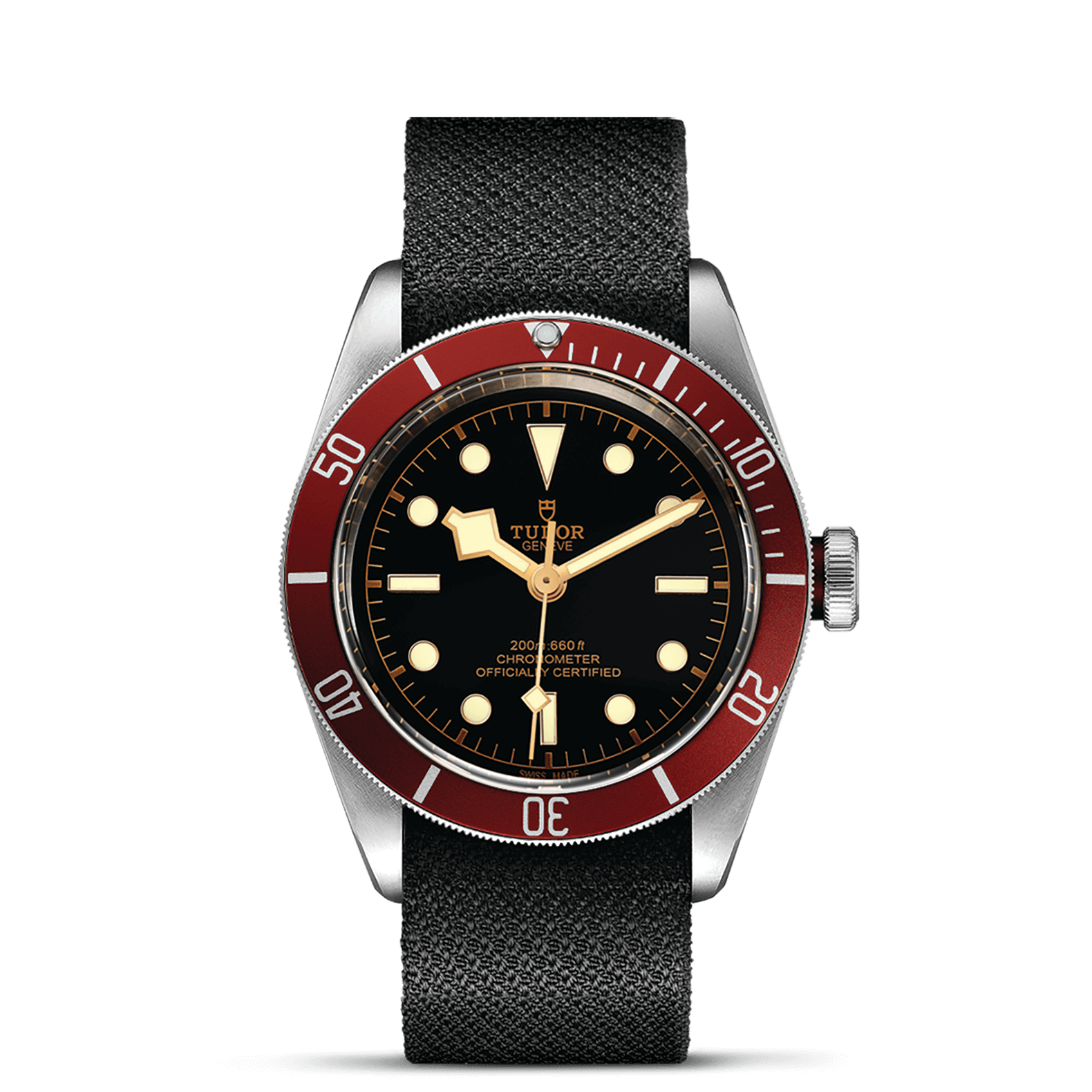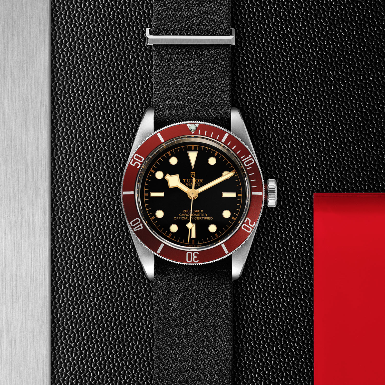 不锈钢旋入式上链表冠,刻有帝舵表玫瑰标志,黑色漆面,配酒红色阳极氧化铝上链表冠轴