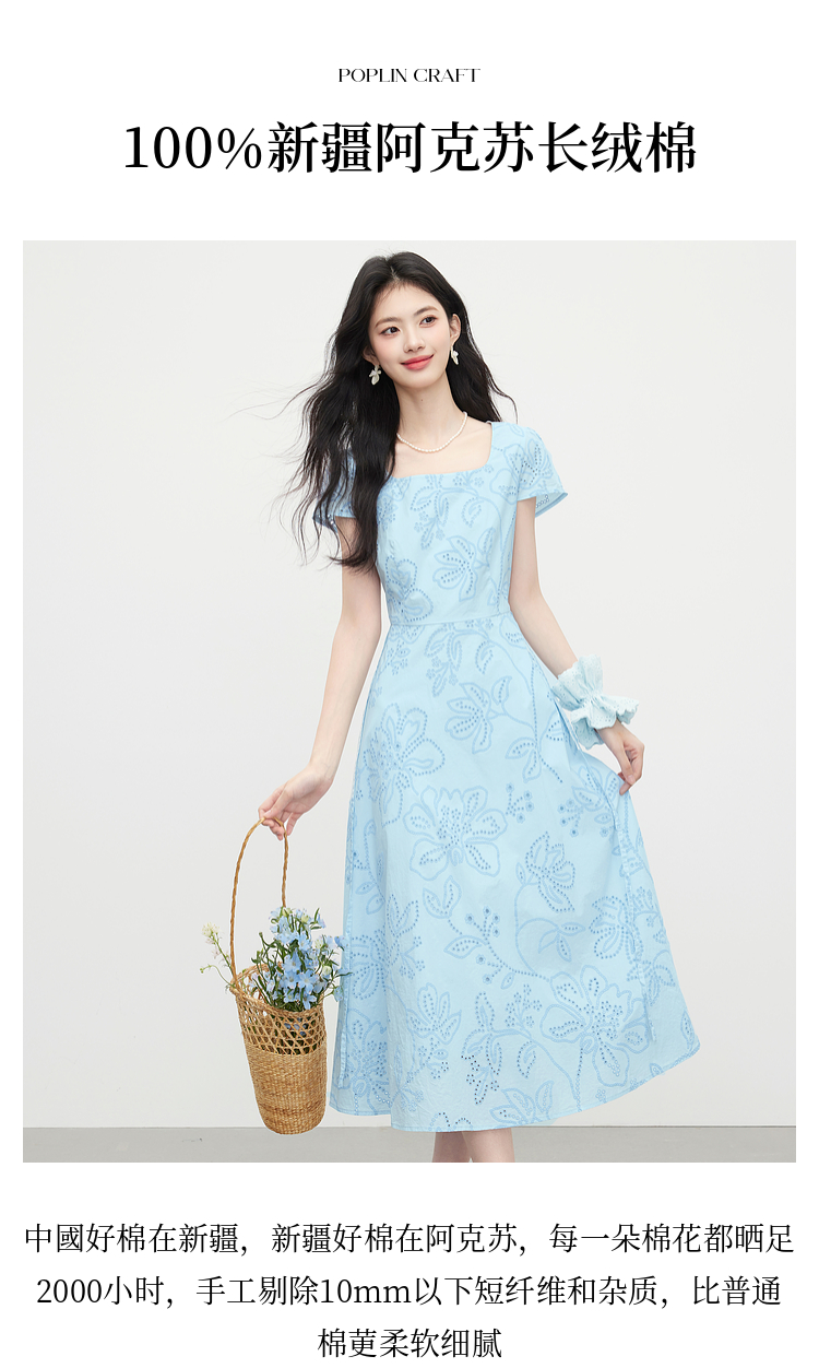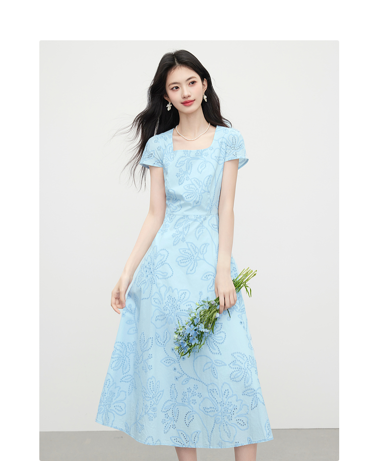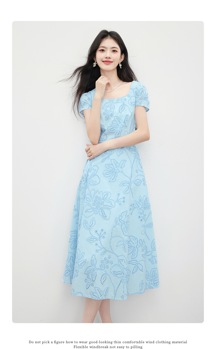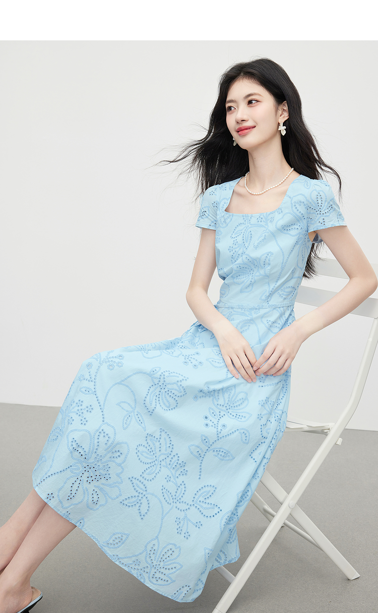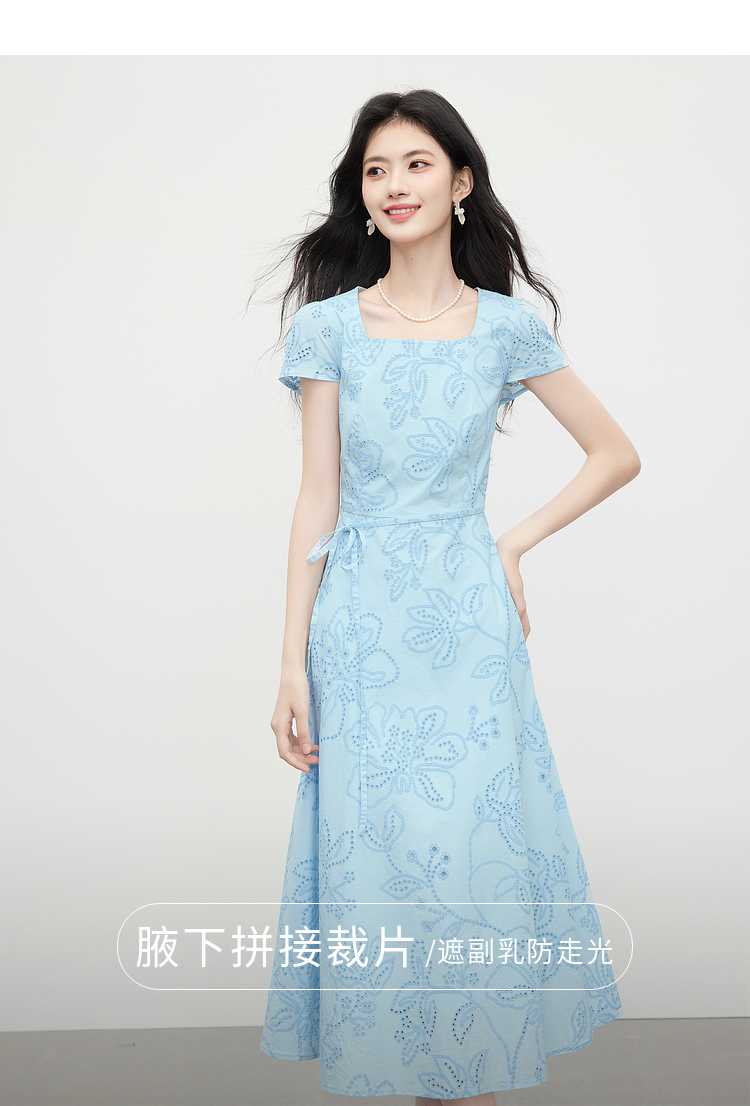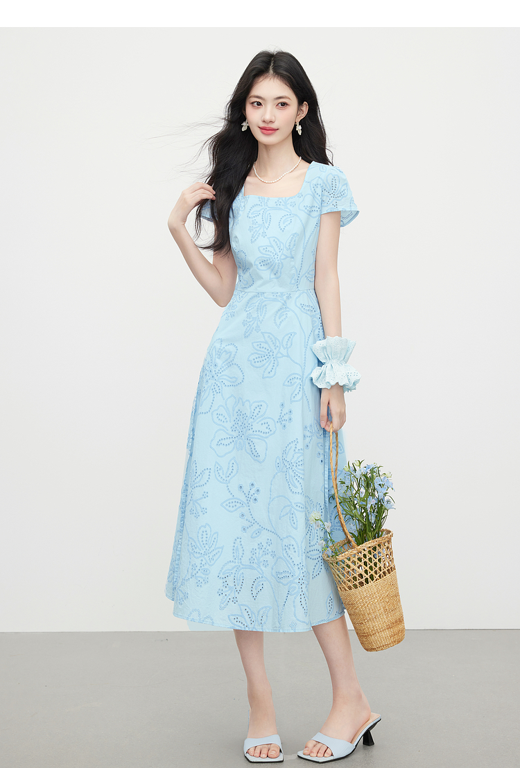 【专属特价】熙世界度假风挑孔绣花蓝色连衣裙女夏季新款法式U领显瘦收腰裙子