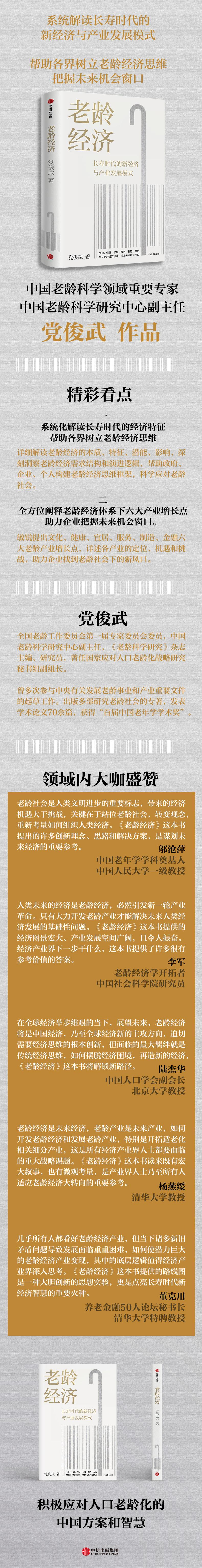 《老龄经济》一书系统化解读未来老龄社会条件下的经济新范式,全方位阐释该经济体系下产业发展的机遇和挑战,帮助政府、企业、个人构建老龄经济思维框架,为推动老龄事业高质量发展提供决策依据。