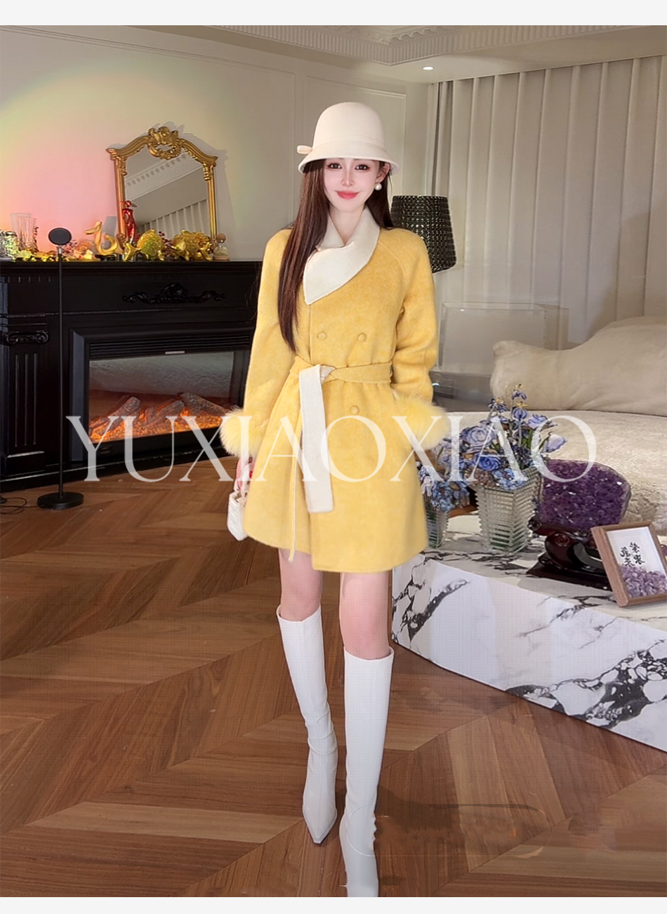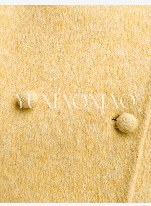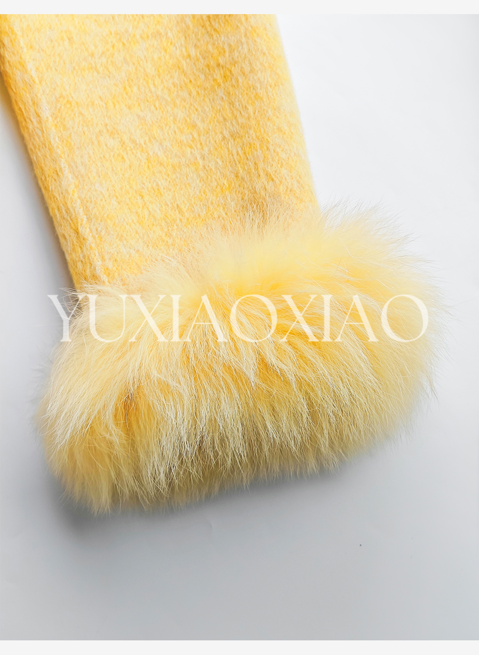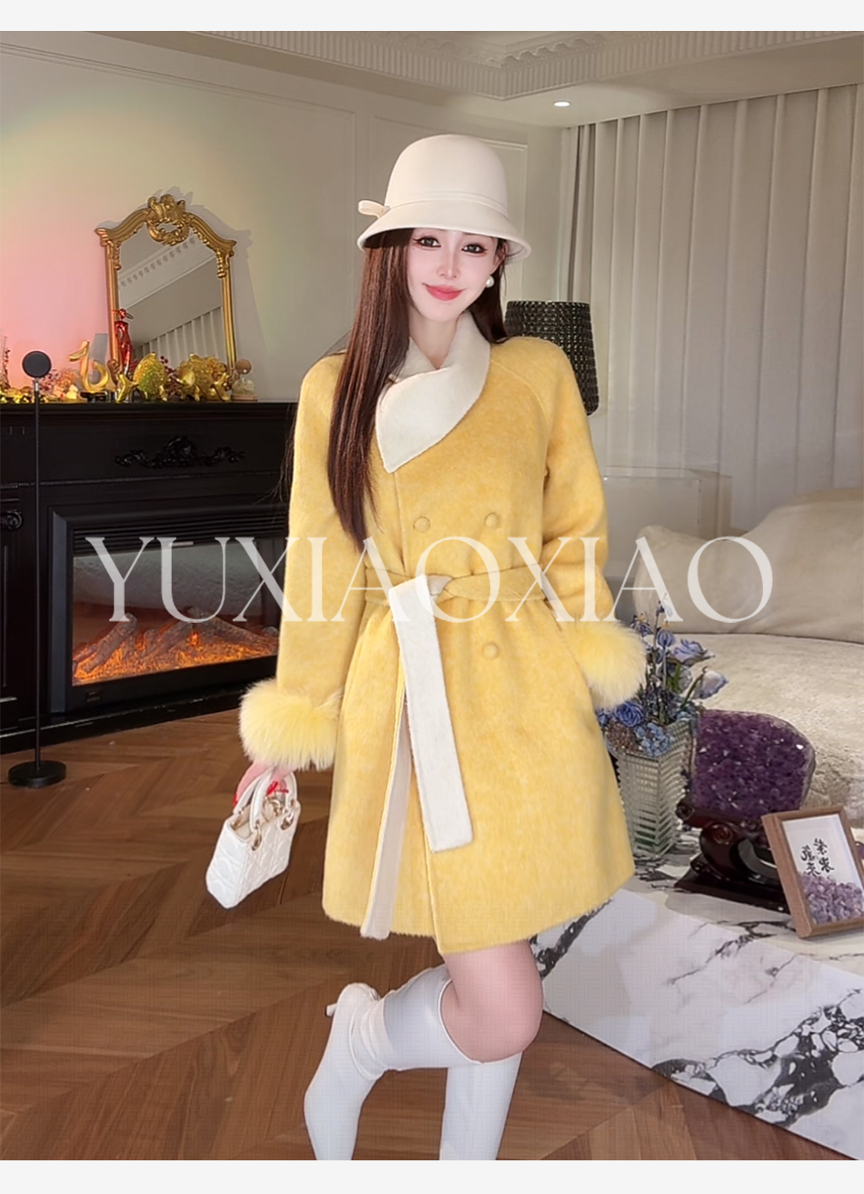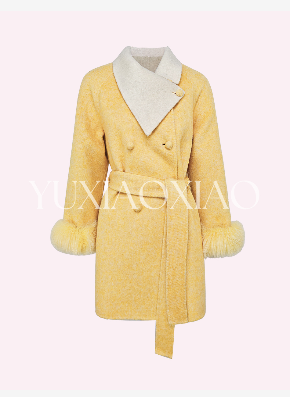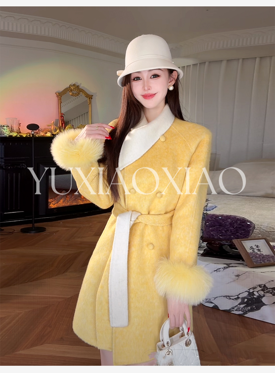余潇潇【治愈黄玫瑰】桑蚕丝兔毛绵羊毛混纺可拆卸狐狸毛毛呢大衣