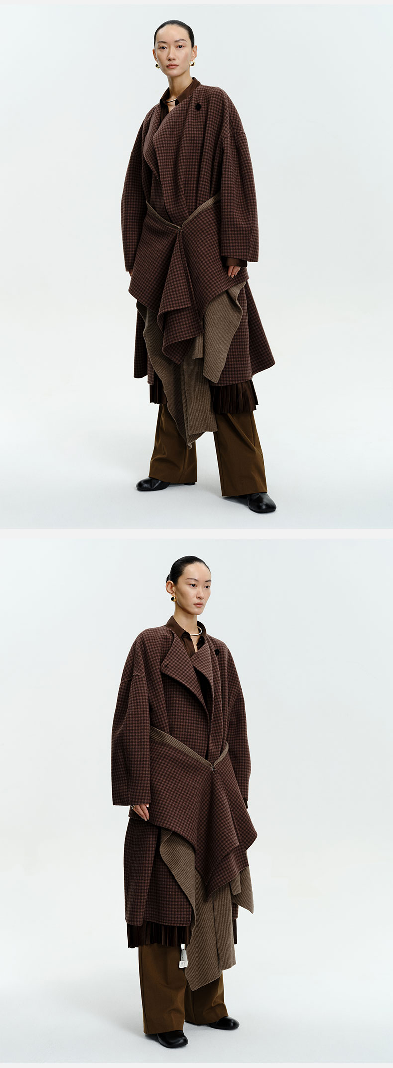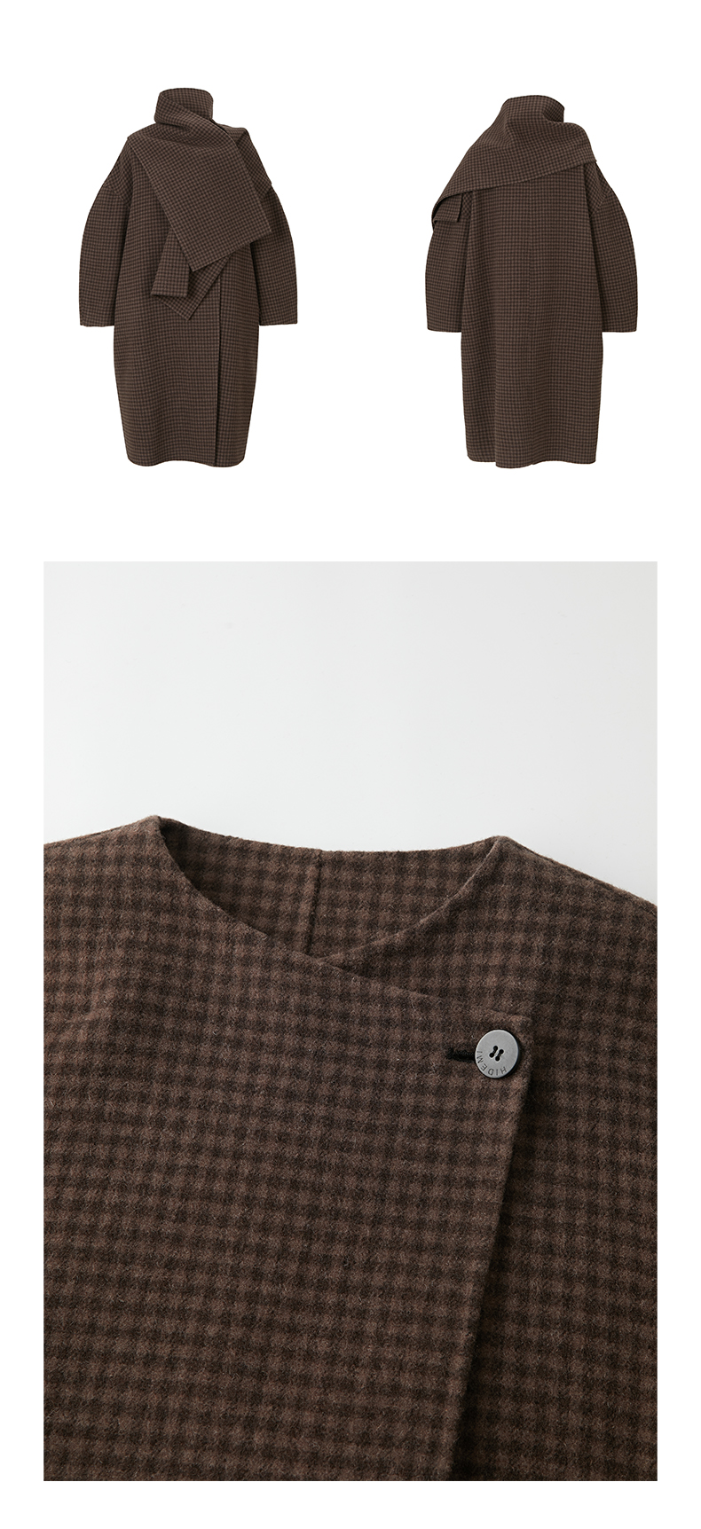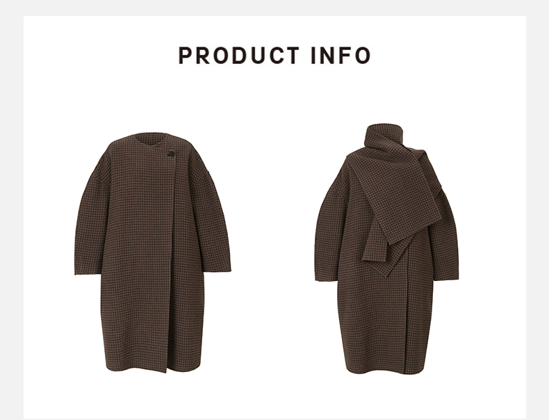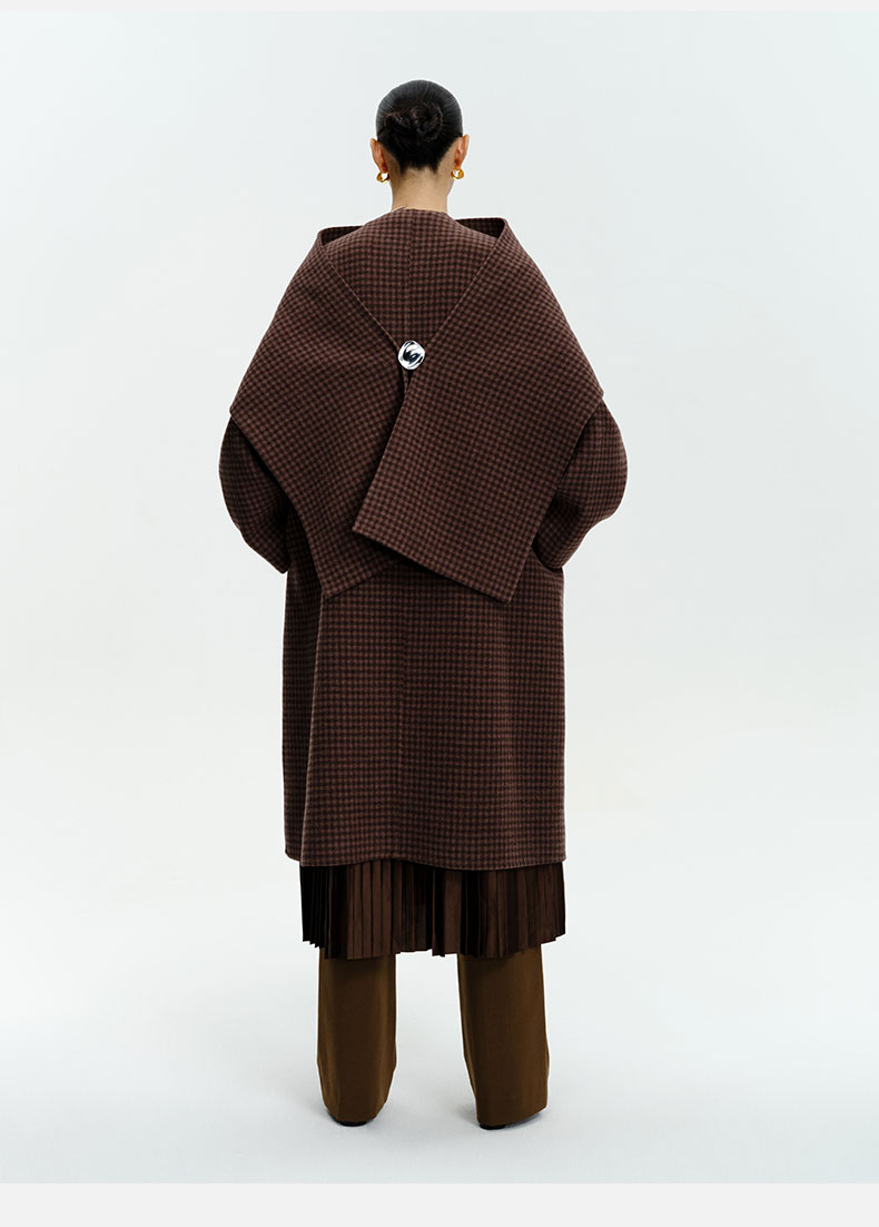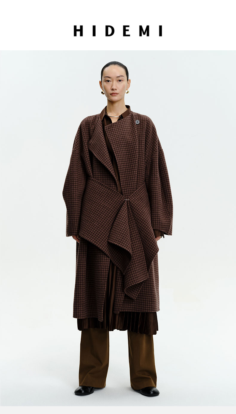 HIDEMI 深咖色格纹长款围巾式大衣