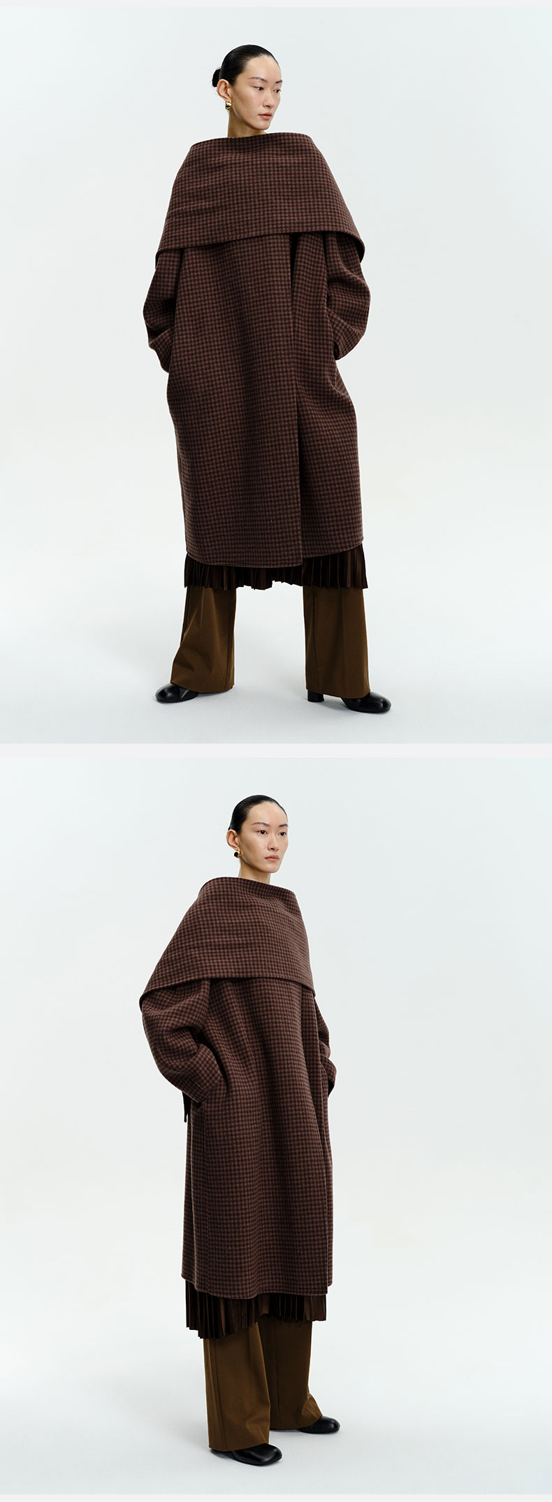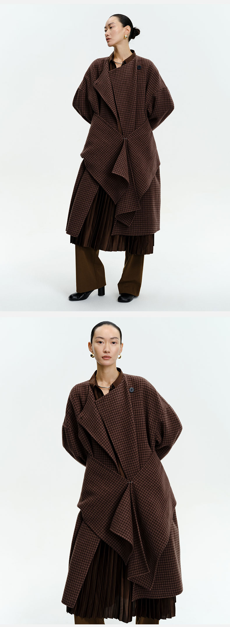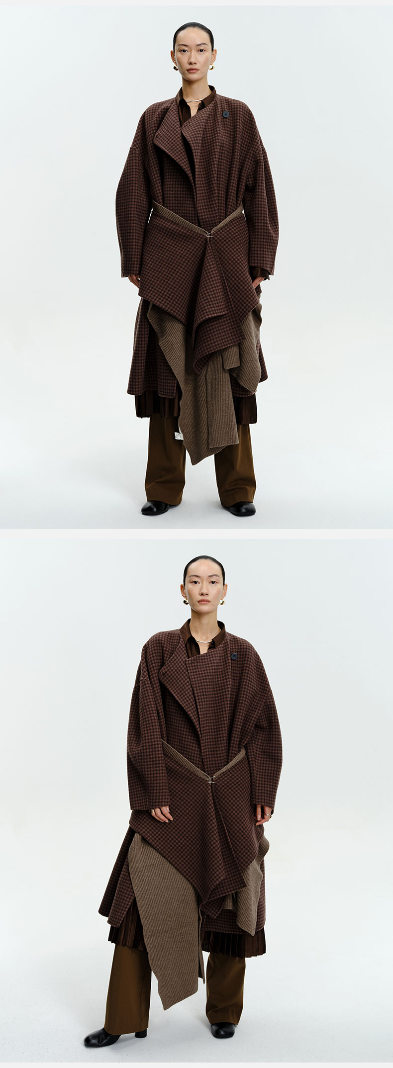 HIDEMI 深咖色格纹长款围巾式大衣