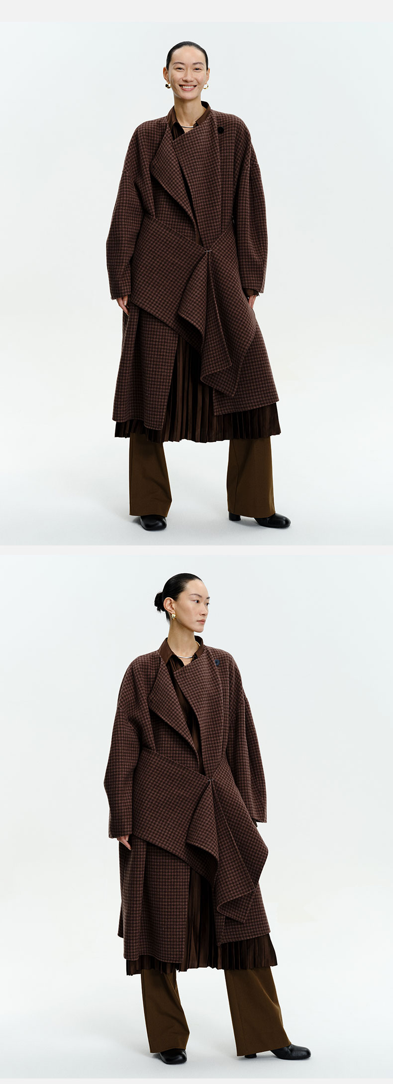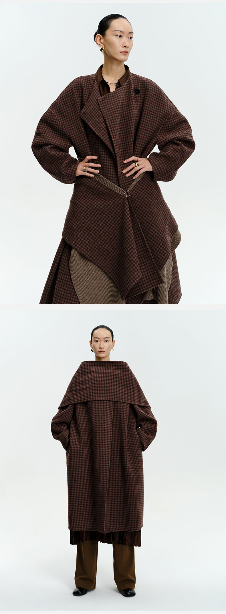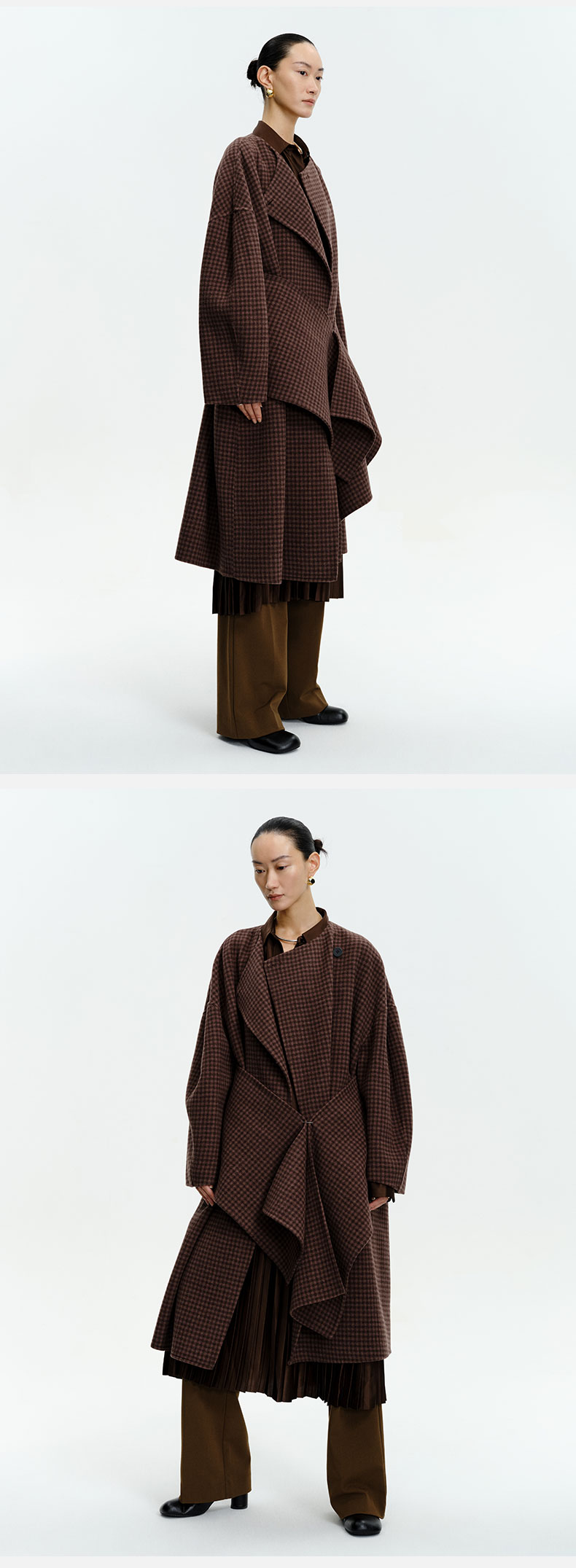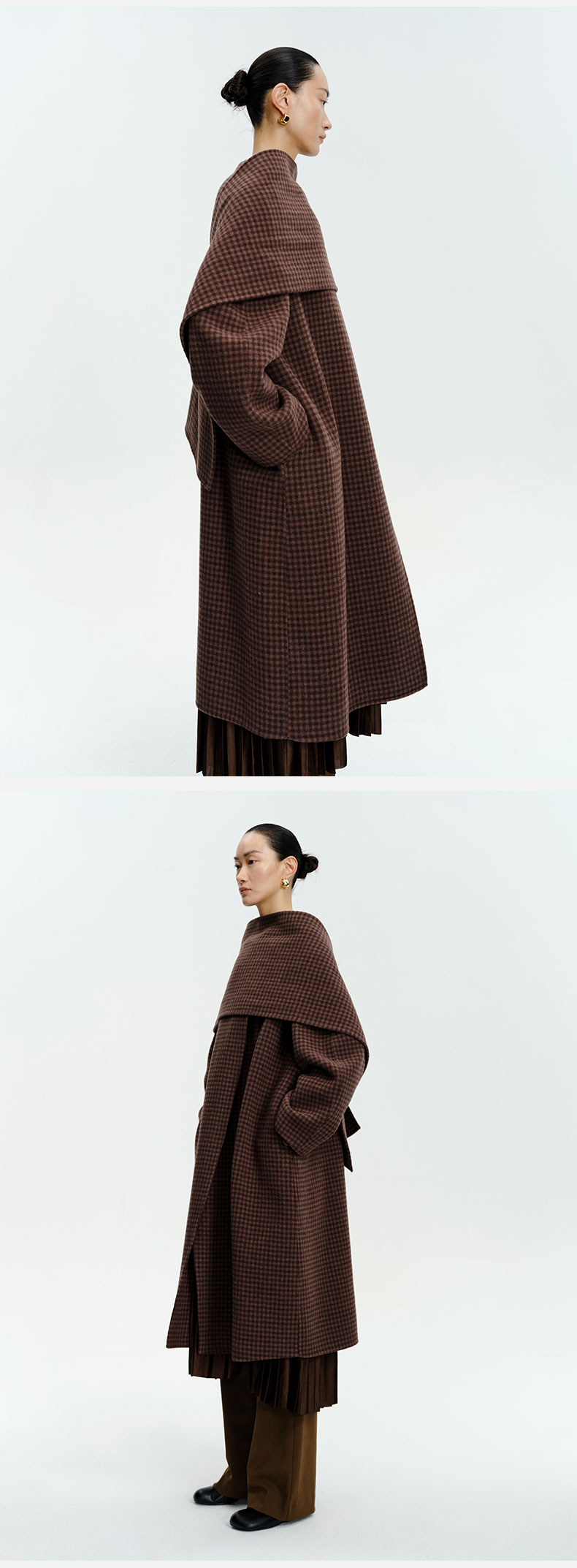 HIDEMI 深咖色格纹长款围巾式大衣