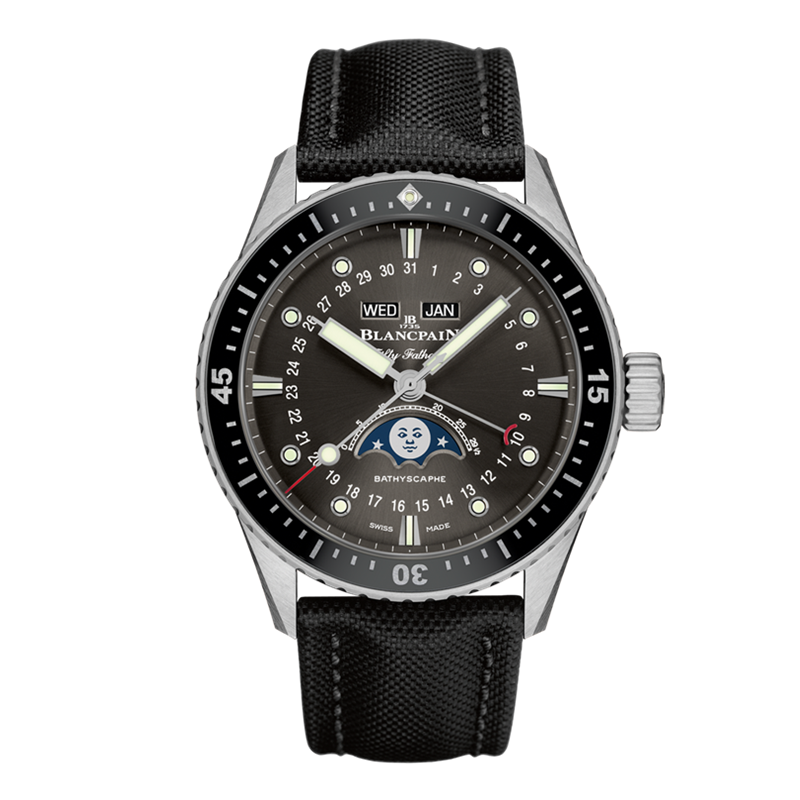 黑色表盘 圆形时标 夜光 日期 月相 星期 月份 年份显示 |
