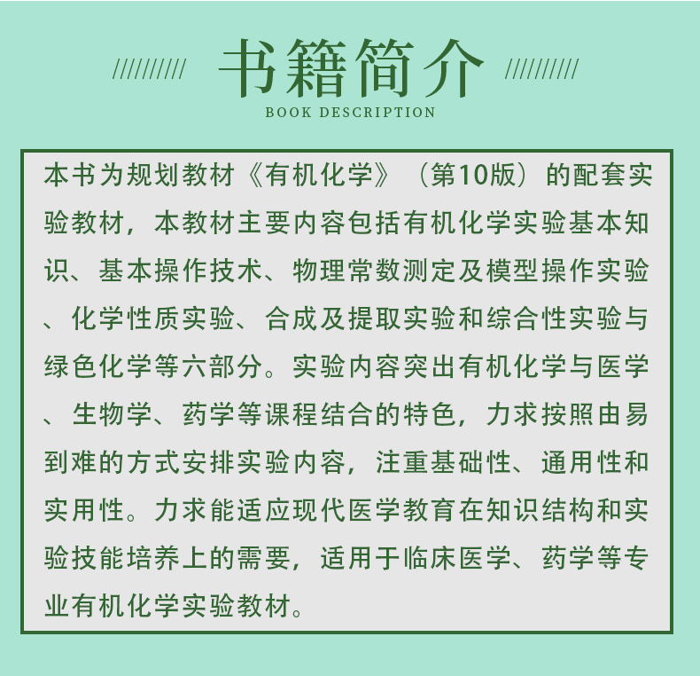 本书为规划教材《有机化学》(第10版)的配套实验教材,本教材主要内容包括有机化学实验基本知识、基本操作技术、物理常数测定及模型操作实验、化学性质实验、合成及提取实验和综合性实验与绿色化学等六部分。实验内容突出有机化学与医学、生物学、药学等课程结合的特色,力求按照由易到难的方式安排实验内容,注重基础性、通用性和实用性。力求能适应现代医学教育在知识结构和实验技能培养上的需要,适用于临床医学、药学等专业有机化学实验教材。