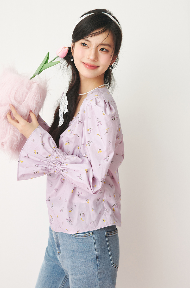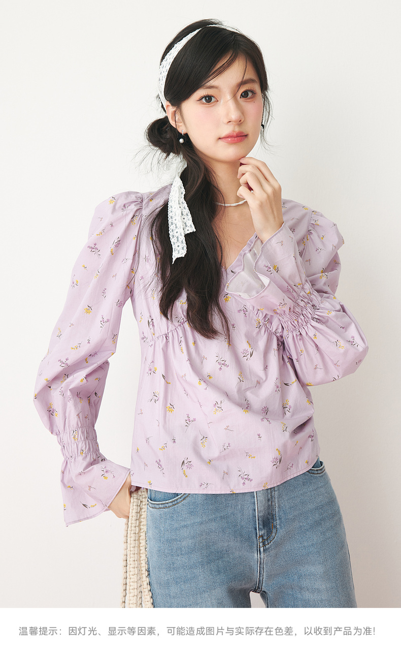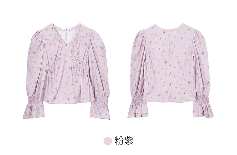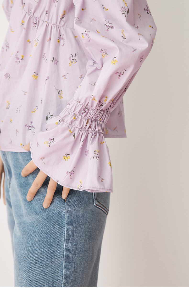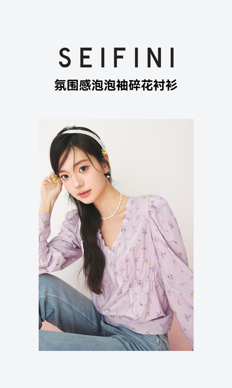 【严选】诗凡黎春精致抽褶设计碎花造型感泡泡袖衬衫SF3120141
