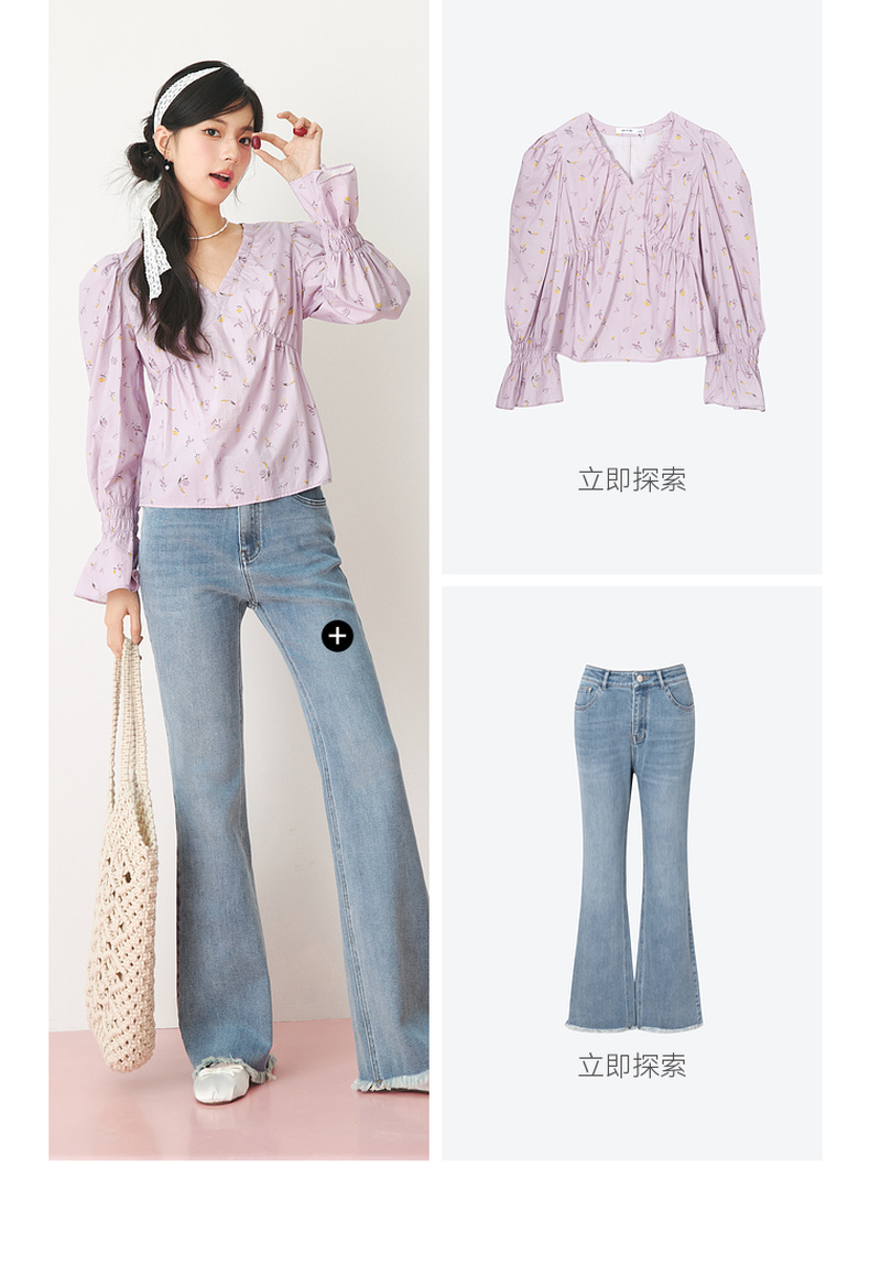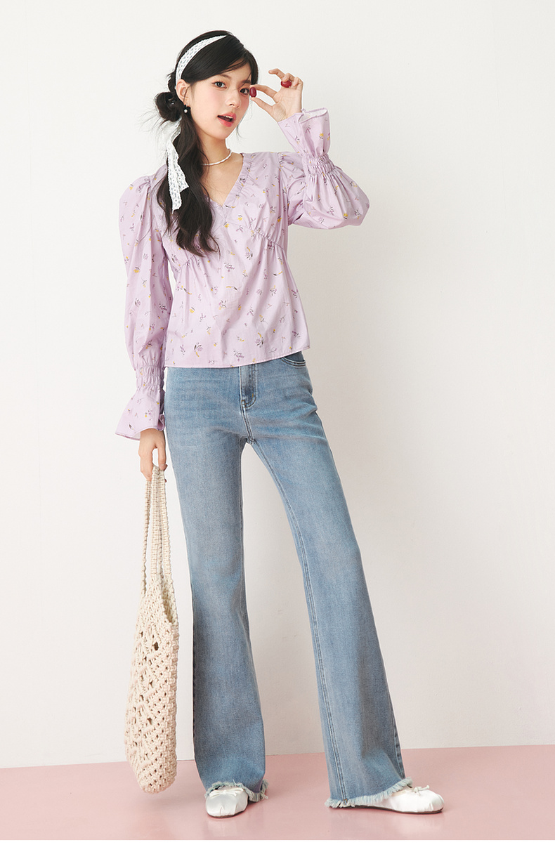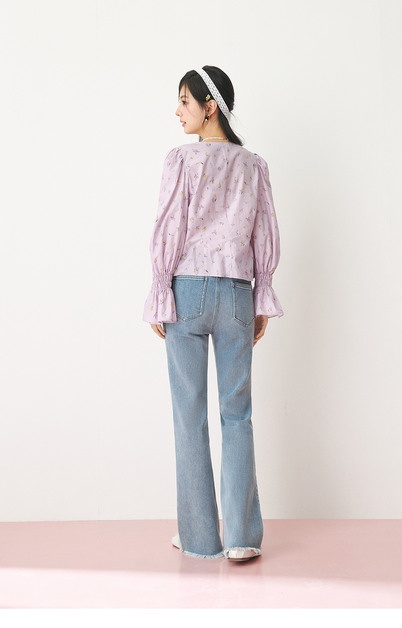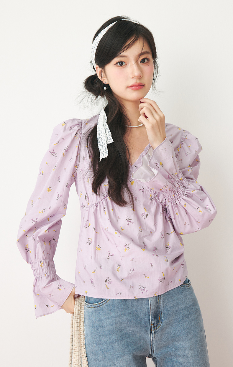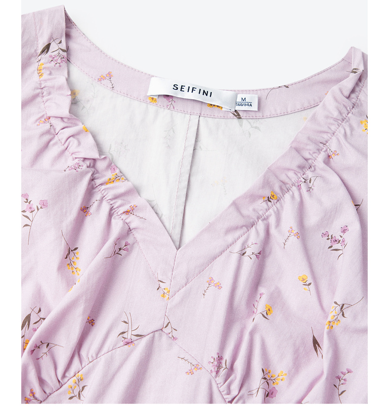 【严选】诗凡黎春精致抽褶设计碎花造型感泡泡袖衬衫SF3120141