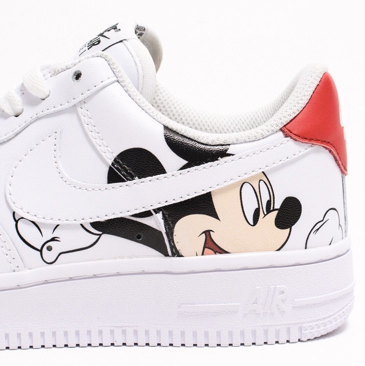 Nike AIR Force 1 Low Mickey Mouse 空军一号米老鼠 鞋款整体的设计颇为简约,白色鞋身的基础上加入类似手绘的米老鼠Logo