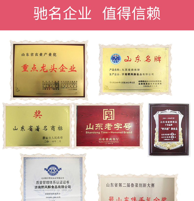 - 济南野风酥食品有限公司是一家从事绿色无公害农产品深加工,生产山东特产食品的企业。职工总人数586人,其中高中级技术人员56人。2007年济南野风酥食品有限公司被山东省人民政府授予省级农业产业化经营重点龙头企业。我公司生产的糖酥煎饼等系列产品曾连续获农业部、山东省优质产品奖,被人民大会堂定为国宴用品。“九顶塔”牌商标获得“省优”“部优”商标称号。全国著名的营养学家于若木曾来厂视察并亲笔题词,姜春云、苏毅然等国家、省级领导先后来厂视察。“野风酥”被中国食品协会评为“优秀民族食品”,获得“中华名吃”称号。产品连续获得国家级食品展销会的畅销产品奖,成为山东省的特色食品,省、市旅游局的十佳旅游商品。“山东煎饼”和“山东烧饼” 被认证为绿色食品。
