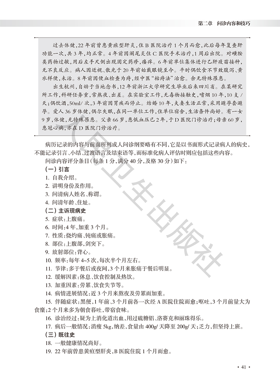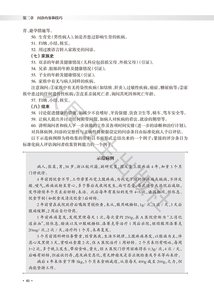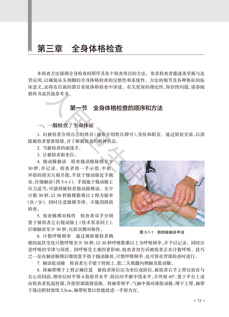 第一章 标准化病人概述/ 1 第一节 标准化病人的概念和作用/ 1 第二节 标准化病人的发展历程/ 3 第三节 标准化病人教学法的应用和“华西”实践/ 4 第四节 标准化病人培训概述和“华西”实践/ 9 第五节 标准化病人的考核验收和“华西”实践/ 16 第六节 标准化病人管理体系和“华西”实践/ 25 第二章 问诊内容和技巧/ 38 第一节 成人问诊纲要/ 38 第二节 问诊技巧及评分标准/ 42 第三节 系统回顾问诊方法/ 51 第四节 儿科问诊纲要/ 56 第五节 精神科问诊及精神检查方法/ 62 第六节 特殊情况的问诊技巧/ 69 第七节 问诊小结/ 71 第八节 口述病历摘要纲要/ 71 第三章 全身体格检查/ 73 第一节 全身体格检查的顺序和方法/ 73 第二节 全身体格检查评分表/ 98 第四章 器官系统体格检查/ 108 第一节 眼部检查方法/ 108 第二节 耳、鼻、口腔及咽喉部检查方法/ 113 第三节 胸部检查方法/ 120 第四节 心血管体格检查方法/ 130 第五节 腹部体格检查方法/ 139 第六节 骨骼肌肉系统检查方法/ 152 第七节 神经系统检查方法/ 164 第八节 男性生殖系统及直肠检查方法/ 173 第九节 女性乳房及盆腔检查方法/ 177 第五章 某些特殊情况的体格检查/ 185 第一节 婴幼儿体格检查方法/ 185 第二节 新生儿体格检查方法/ 199 第六章 标准化病人问诊示范案例/ 207 第一节 腹痛案例/ 207 第二节 血尿案例/ 211 第三节 少尿案例/ 215 第四节 头痛案例/ 219 第五节 发热案例/ 222 第六节 胸痛案例/ 226 第七节 腹泻案例/ 230 第八节 消瘦案例/ 234 第九节 情绪低落案例/ 238 第十节 新生儿黄疸案例/ 242 第七章 标准化病人重点问诊查体示范案例/ 248 第一节 腹痛案例/ 249 第二节 下腹痛案例/ 251 第三节 胸痛案例/ 254 第四节 血尿案例/ 256 第八章 临床诊断思维教学示范案例/ 260 第一节 水肿的诊断思路/ 260 第二节 胸痛的诊断思路/ 266 第三节 呼吸困难的诊断思路/ 270 第四节 心悸的诊断思路/ 274 第五节 腹痛的诊断思路/ 278 第六节 黄疸的诊断思路/ 282 第七节 腰痛的诊断思路/ 286 第八节 头痛的诊断思路/ 290 第九节 情感症状的诊断思路/ 294 第十节 停经和阴道流血的诊断思路/ 298 主要参考文献/ 302