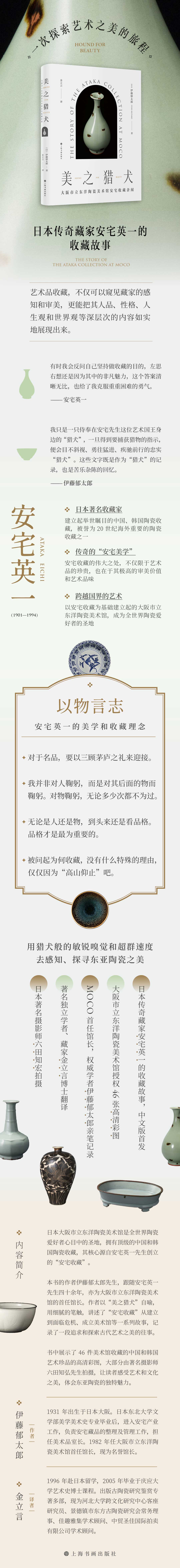 本书的作者伊藤郁太郎先生,跟随安宅英一先生四十余年,亦为大阪市立东洋陶瓷美术馆的首任馆长。作者以“美之猎犬”自喻,用细腻的笔触,讲述了“安宅收藏”从建立到面临危机、成立美术馆等一系列故事,记录了一段追求和探索古代艺术之美的往事。书中展示了46 件美术馆收藏的中国和韩国艺术珍品的高清彩图,大部分由著名摄影师六田知弘先生拍摄,让读者感受艺术和文化的洗礼,体会东亚陶瓷的独特魅力。