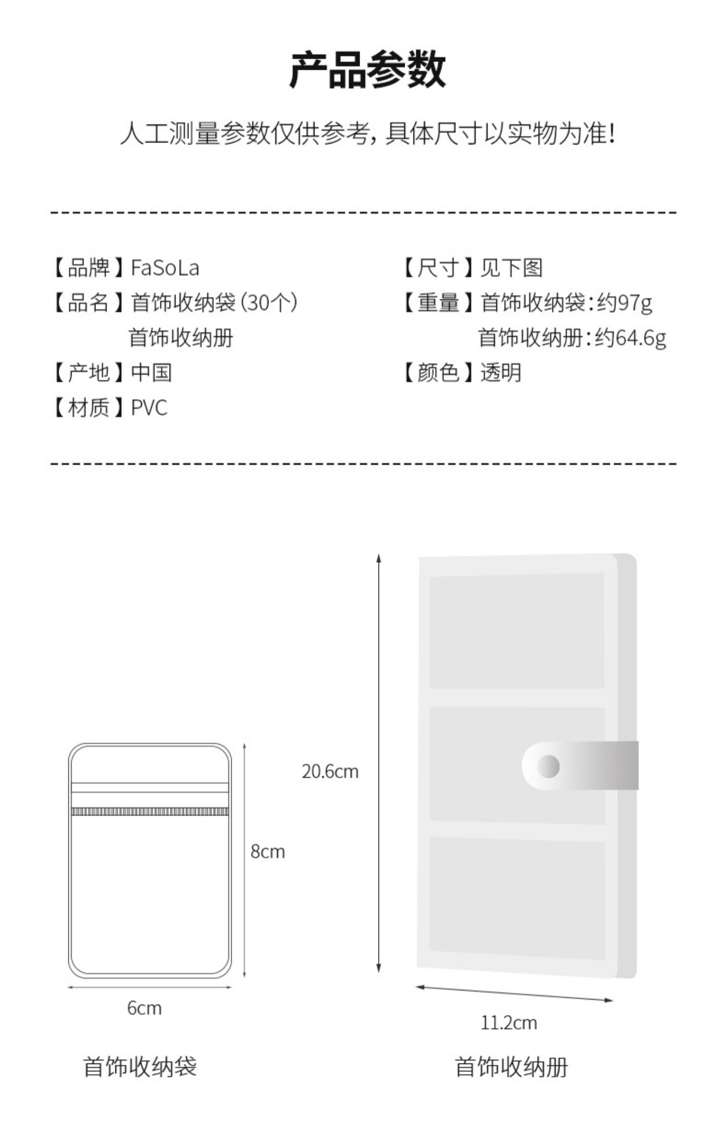 FaSoLa首饰收纳册pvc透明防尘袋子防氧化耳环饰品收纳项链包装袋