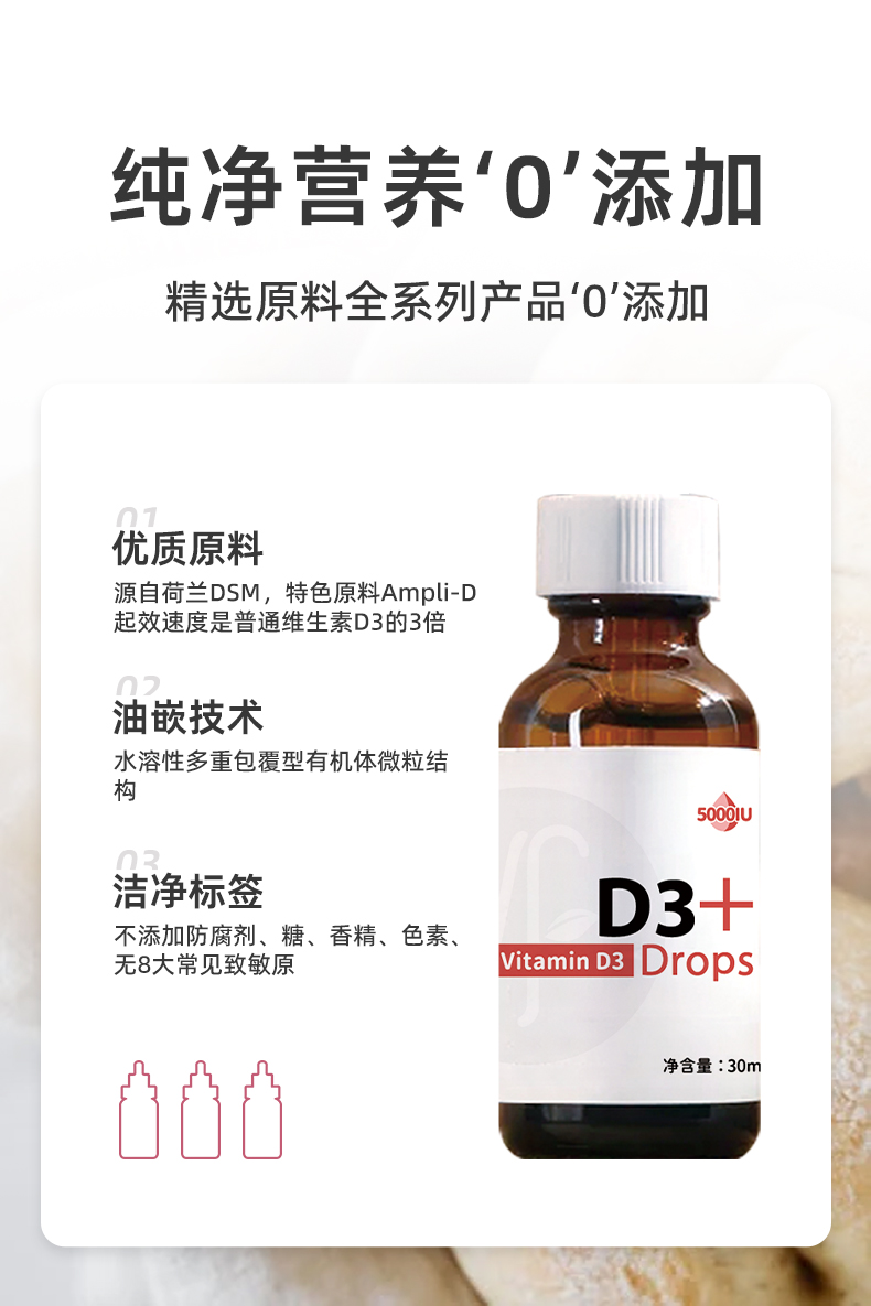 叁佰添维生素D3滴剂儿童成人帝斯曼原料 新西兰原装进口 (每滴含1000单位)3ml瓶装