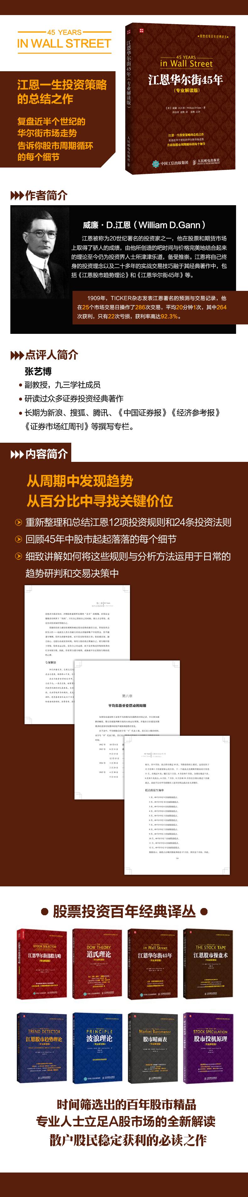 江恩一生受欢迎的作品,江恩理论学习读物。 国内名家立足当下国内A股市场的精彩评述和导读。 揭示股市周期循环的数字秘密。 预判股票趋势转折的规律。 自股市出现以来,各类名家辈出,他们写作的股市书籍更是数不胜数。然而,时间是好的筛选器,大浪淘沙,历经近百年之后,只有少数的作品仍在流传。人心没有变,股市的基本运行规律也没有变。因此,在这里,我们甄选的是这类洞察人心、触及股市本质的作品。在汗牛充栋的股票作品中,为股票投资人遴选案例、去伪存真,给散户股民基本、实用的指导,使他们看清股市的本质,找到股市中百年不变的规律。