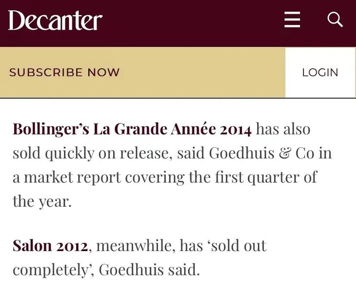 被誉为亿万富豪才知道的香槟,前几年酒庄出品的Salon 2012年份,一出道即售罄(Sold Out Completely)