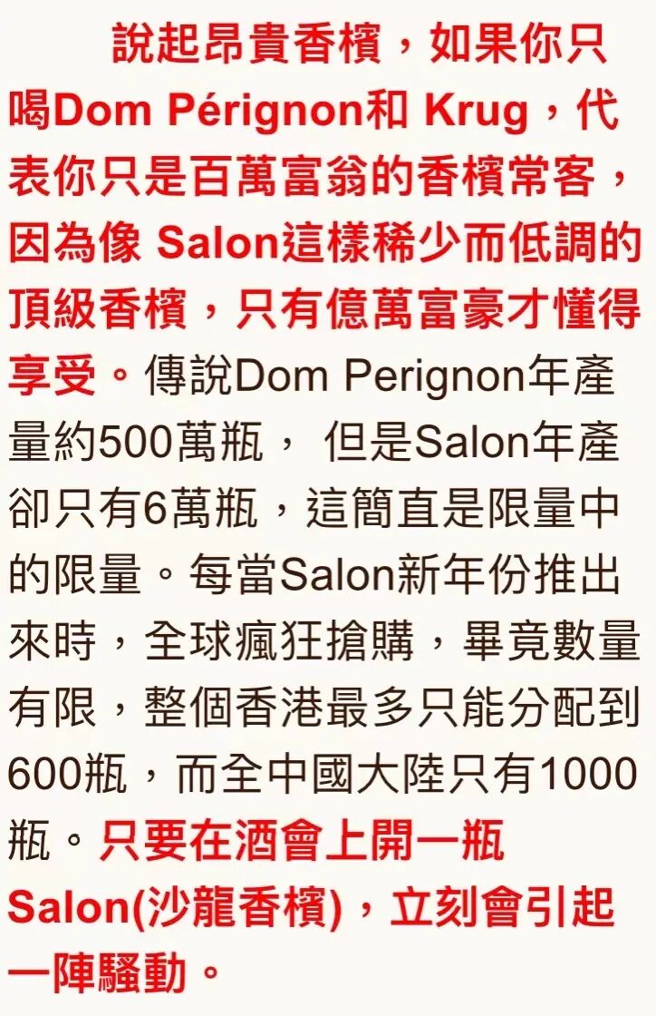 要知道买Krug只能证明咱有钱,并不能证明咱懂香槟(约等于懂酒,约等于有文化)所以买大家都知道、都买得到的最贵的香槟真体现不了啥水平,但是只要你朋友圈Po个Salon,基本上所有圈内(即使一直潜水)的富豪都会跳出来给你点赞!