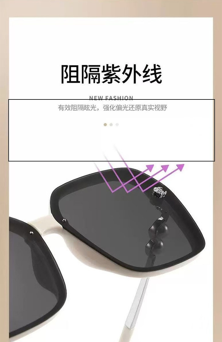 👉🏻珍珠款墨镜 不挑年龄不挑脸,闭眼入的百搭款,全年都能戴! ✅ 方形大框设计 完美修饰颧骨、下颌线,轻松遮住高颧骨、咬肌 显脸小效果直接拉满,素颜戴也能直接出门😎 ✅ 牢固铰链 + 质感镜腿 耐用又高级,久戴不滑落 颜值与实用性双在线✨ ✅镜腿处的珍珠串珠设计 打破了传统墨镜的硬朗感 在酷飒的方形镜框里,融入了温柔的珍珠元素 甜酷风直接拿捏,甜妹、辣妹都能完美驾驭
