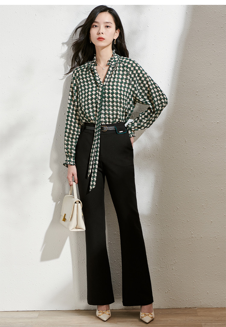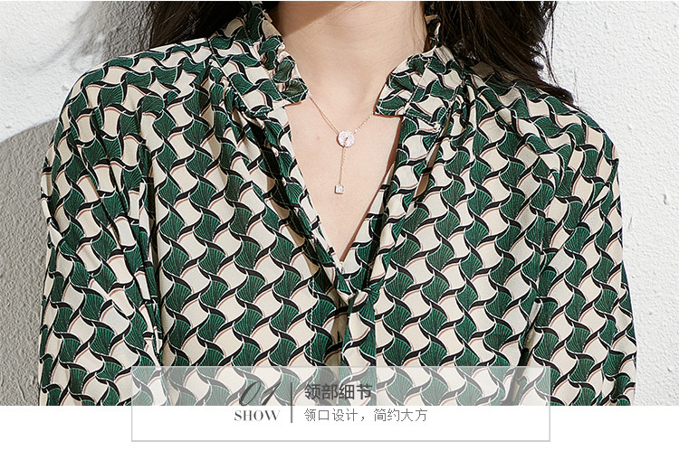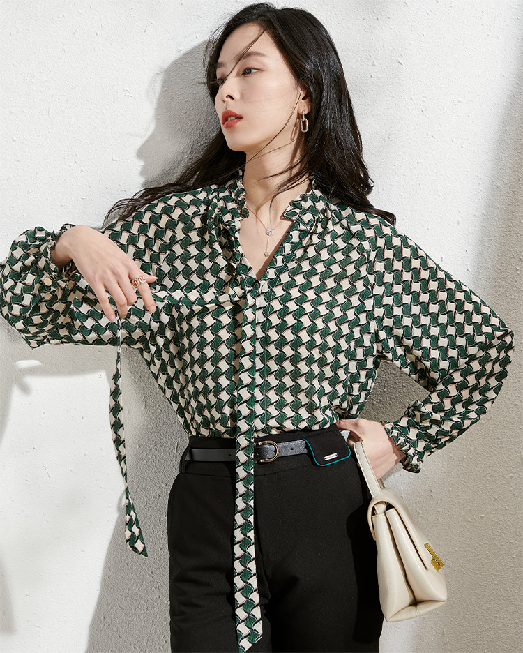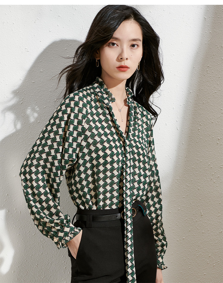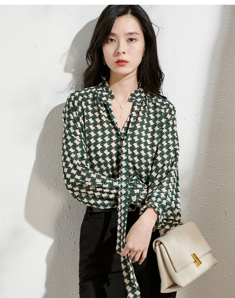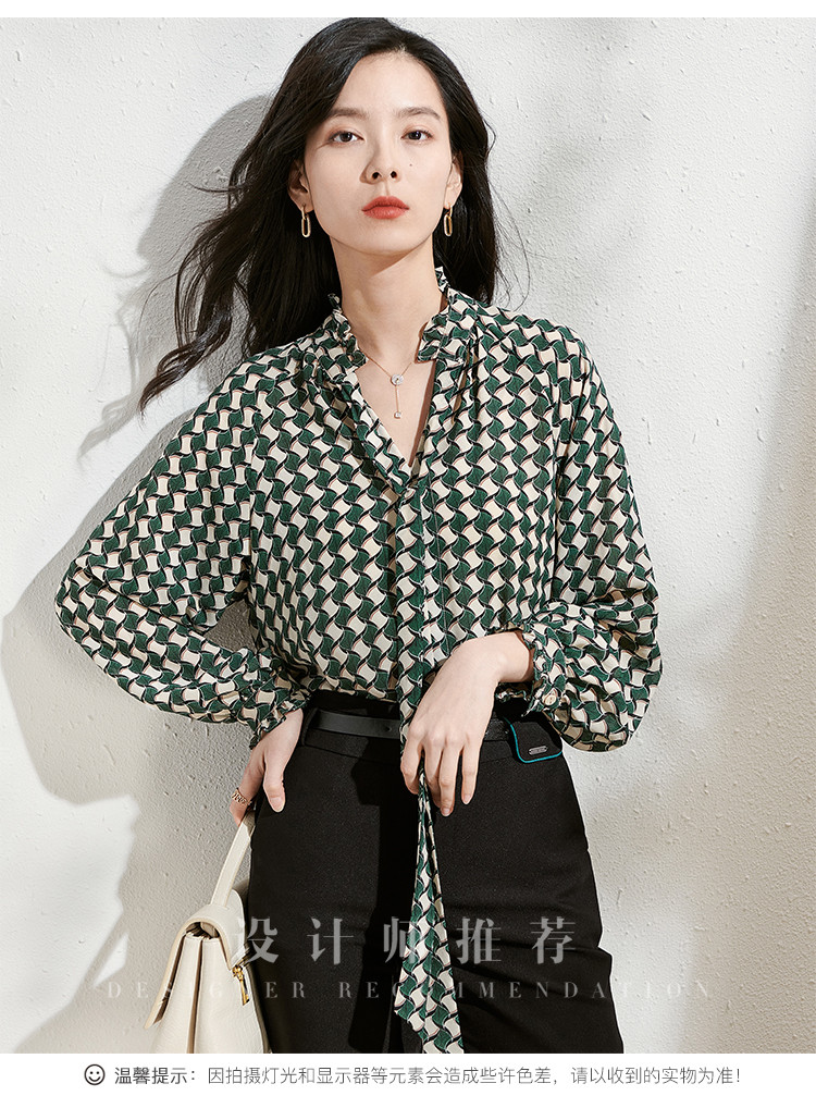 剩M 芳外拼色荷叶袖绑带领2025春季新款长袖知性女式衬衫