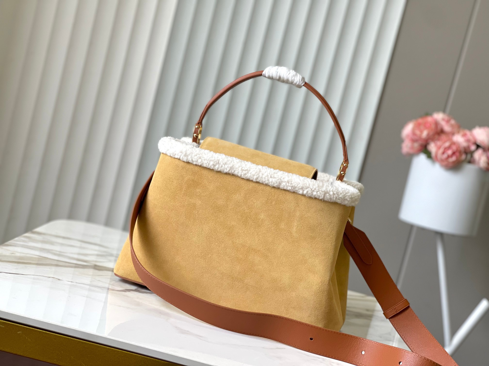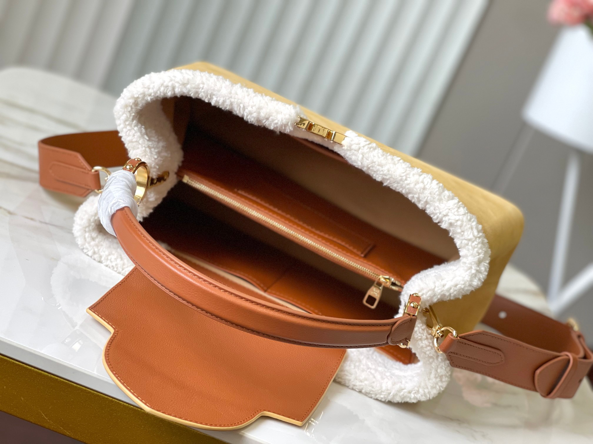 秋冬特惠💰1600 渠道级LV 新品 te级LV 动态芯片 M12784/M48865Souple金棕绒毛款 本款 Capucines Souple 大号手袋融合绒面牛皮革和羊毛皮 以耀目 LV 标识和光滑皮革手柄舒展 LV Ski 系列的优雅风采 宽裕尺寸可收纳日常所需、A4 文件和旅行用品 Size:23 * 16 * 38 cm