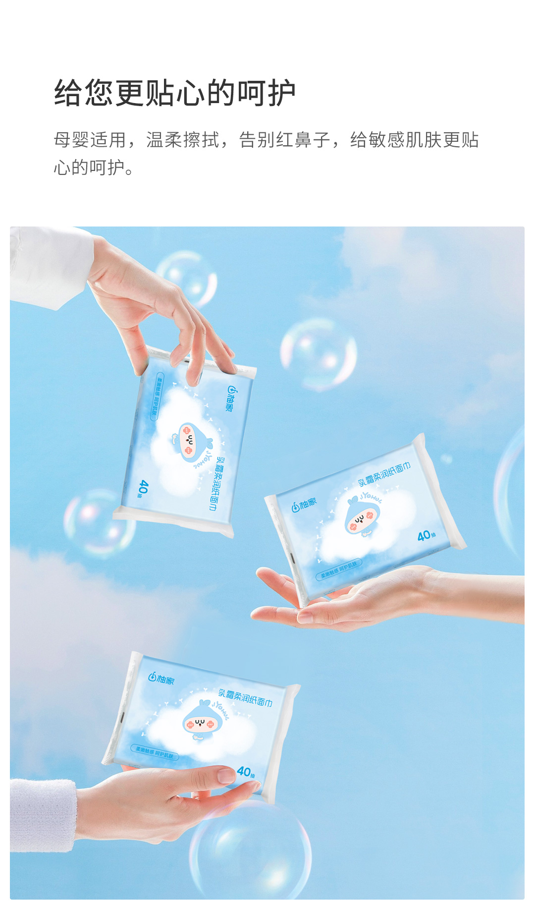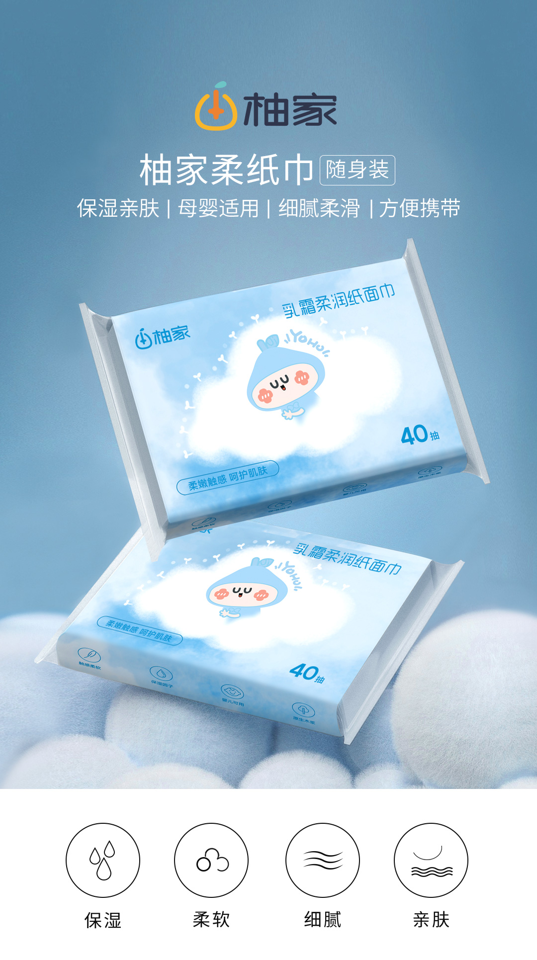 柚家保湿纸巾(蓝色款)40抽/包 3层 5包/箱170466